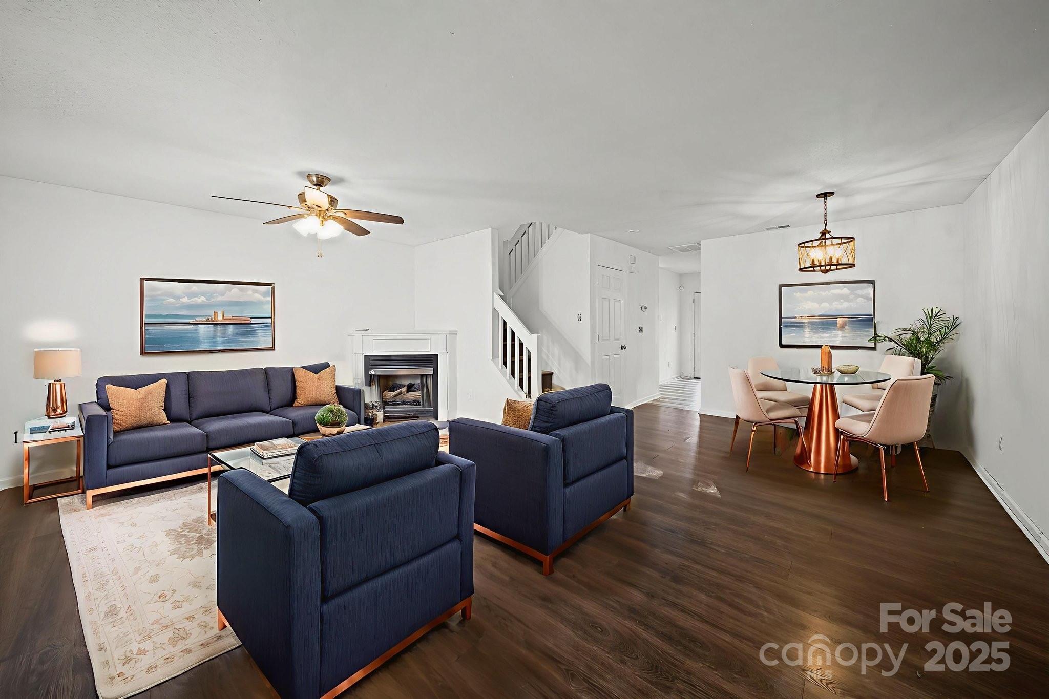 Upon entry, you are greeted by durable wood-style flooring that flows seamlessly throughout the main living areas, instantly creating a sense of warmth and continuity. The spacious living room is anchored by a cozy fireplace, providing a natural focal point for relaxing evenings or entertaining guests. The open dining area connects effortlessly to the kitchen, which features crisp white cabinetry, granite countertops, modern appliances, and ample prep space, offering both functionality and timeless appeal. A convenient half bathroom on the main level adds everyday practicality for guests.