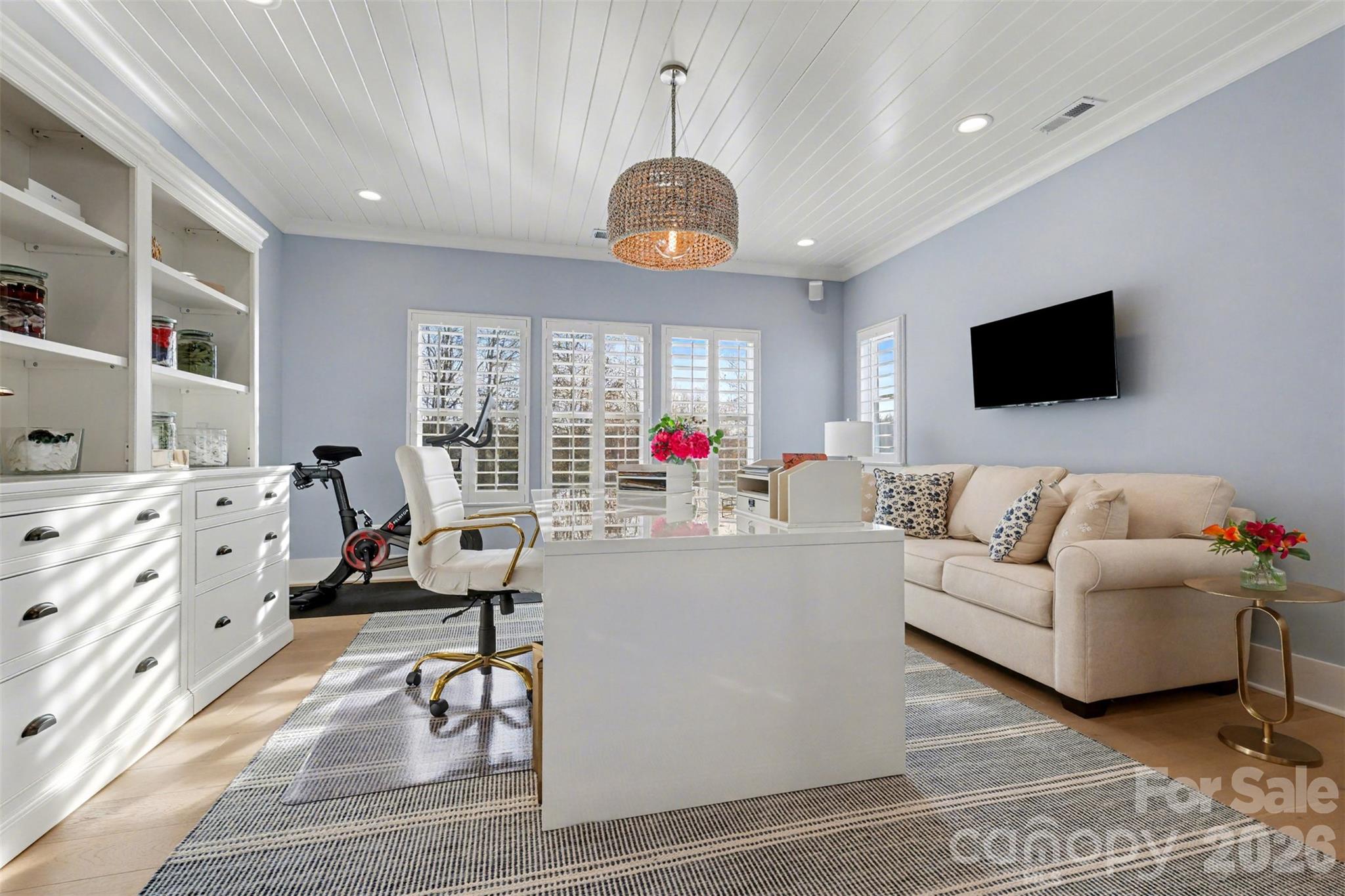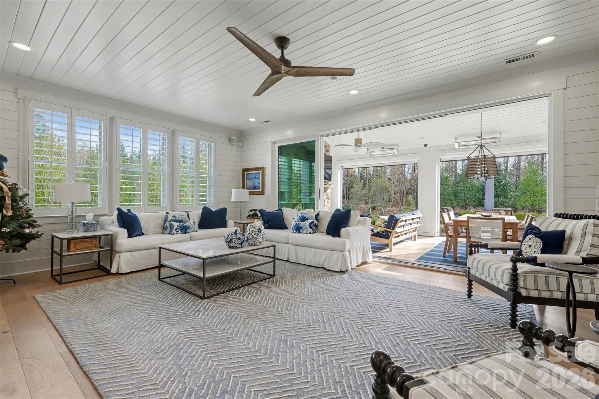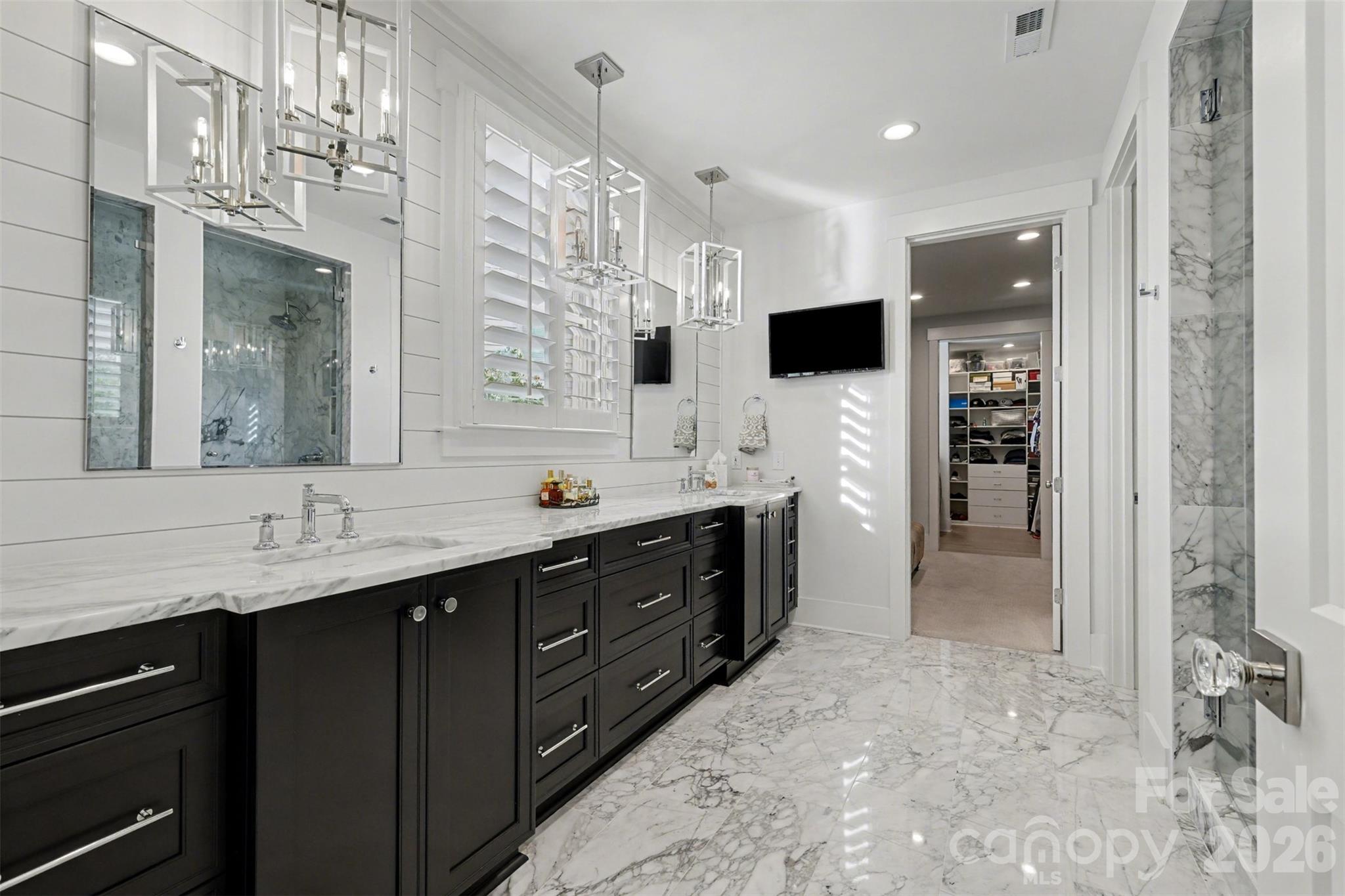The main-level owner’s suite is a serene retreat, offering a spa-inspired bath with marble counters, heated marble floors, an oversized walk-in spa shower, and an expansive custom-designed primary closet with integrated laundry. Additional highlights include a first-floor guest suite, formal and open living spaces, and refined architectural details such as V-groove wood ceilings, shiplap accents, designer lighting, plantation shutters, and custom closets throughout.