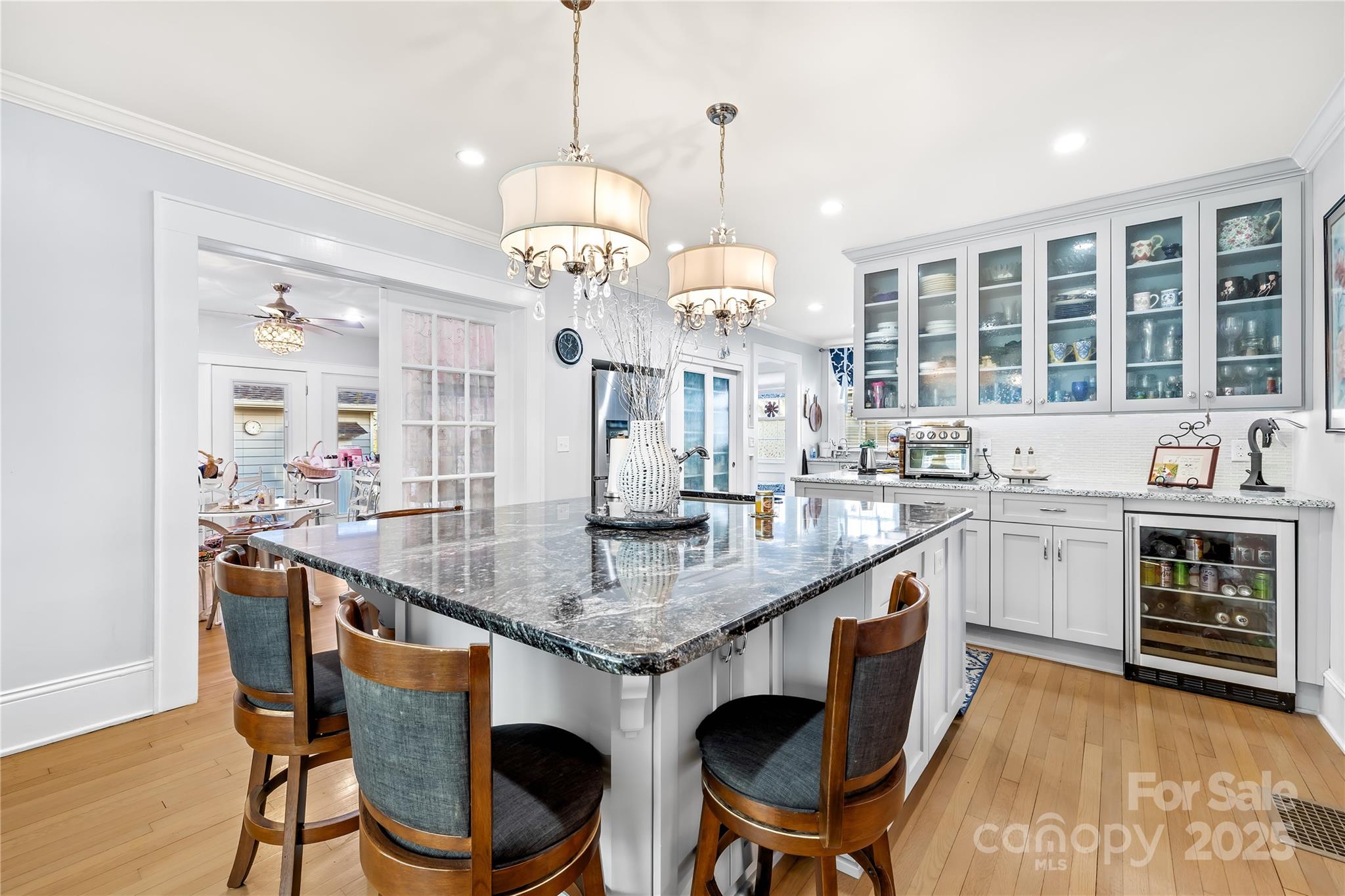 Inside, you’ll find real original hardwood floors throughout and an oversized primary bedroom featuring three closets, offering rare space and storage for a historic home. The custom-built kitchen is a showstopper with granite and quartz countertops, stainless steel appliances, pot filler, primary and prep sinks, and a convenient appliance lift/mixer stand. All kitchen appliances convey. Additional upgrades include a whole-house water filtration system, reverse-osmosis drinking water faucets, and an on-demand tankless water heater.