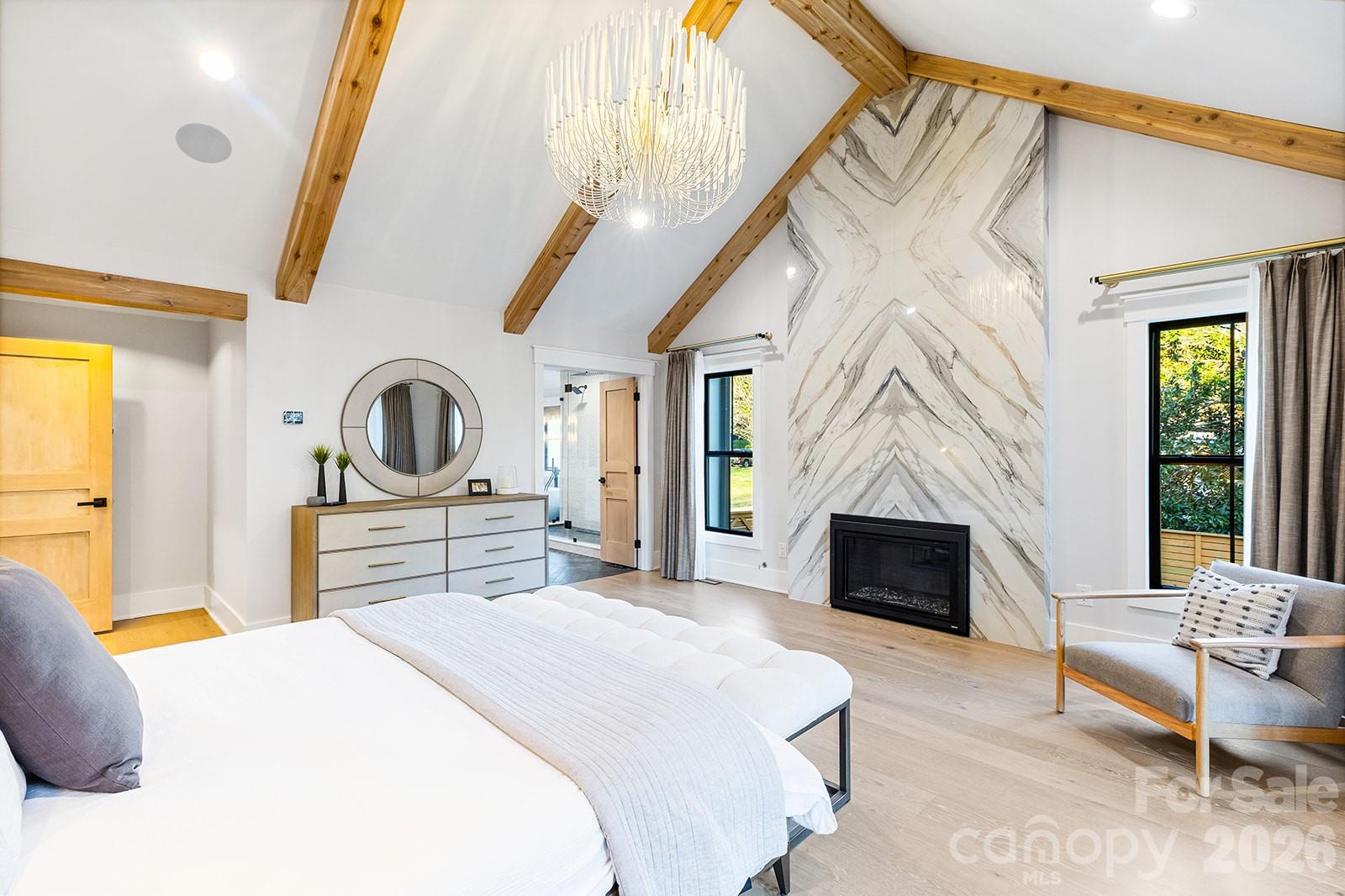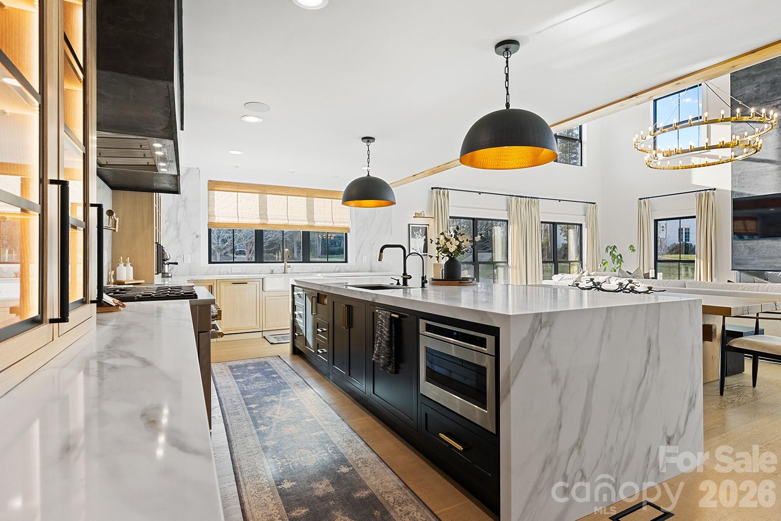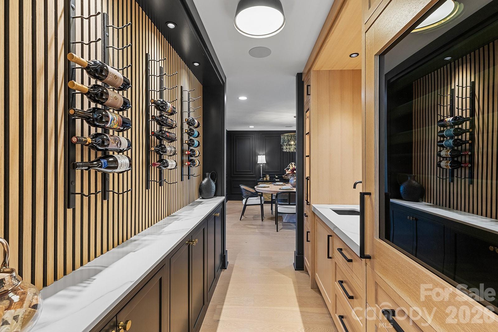 Set in South Charlotte’s Montibello neighborhood & convenient to prestigious schools in South Park & South Charlotte, along with Carmel Country Club & Quail Hollow Club, this 6BR/6.5BA home is intentionally designed w/ a focus on craftsmanship, flow, & livability—every detail thoughtfully laid out & intentionally designed. From the entry, custom modern molding, architectural millwork, decorative wood paneling, & wood-accented ceiling details establish a refined tone. 7.5” engineered white oak floors run throughout, paired w/ tile selections sourced exclusively from Queen City Stone & Tile & lighting curated by Lumi Lighting & Home Design. The kitchen anchors the home w/ custom rift-sawn white oak cabinetry, a 12’ black island, Calacatta Castana quartz 2.5” mitered waterfall countertops, pot filler, prep sink w/ reverse osmosis filtration faucet, & a concealed scullery w/ freezer & refrigerator drawers plus extensive pantry storage. A full suite of GE Monogram custom panel appliances is anchored by a 48” dual-fuel range w/ six burners & built-in griddle, accented by a Black Venetian plaster custom range hood. Built-in refrigerator/freezer & two fully integrated dishwashers blend seamlessly into the cabinetry, while a microwave drawer & 36” Kohler Whitehaven farmhouse sink complete the workspace. The kitchen transitions seamlessly into the great room w/ 24’ ceilings, anchored by a floor-to-ceiling Black Venetian plaster fireplace custom-crafted by a local artisan & framed by architectural beams. The dining room features custom millwork & is finished in SW Tricorn Black for a dramatic yet sophisticated setting. A wet bar/wine wall connecting the kitchen & dining room includes a Wine Sommelier refrigerator, Blanco Diamond SILGRANIT prep sink, & custom rift-sawn white oak cabinetry. The home features front & back staircases. Living spaces include a main-level primary suite & a secondary primary upstairs, offering flexibility for multi-generational living or guest retreat. The main-level primary features vaulted ceilings w/ architectural beams, a matchbook porcelain slab gas fireplace, soundproofing for privacy, & a spa-caliber bath w/ freestanding soaking tub, oversized shower w/ rain head + 2 additional heads, a two-person Sunlighten Signature infrared sauna w/ interior lighting & integrated speakers, & a fully customized closet w/ center island, 17 drawers, & laundry pullouts. The main-level office offers floor-to-ceiling built-ins, shiplap accent wall, integrated desk, & modern trim detailing. The pool house kitchen features Cristallo quartzite countertops w/ undercounter LED lighting, dishwasher, beverage fridge, & hydraulic bar window opening to the pool deck, along w/ indoor lounging space & full bath. Outdoor living includes a heated gunite saltwater pool w/ integrated spa, tanning ledges, water features, & custom leathered marble hardscaping, supported by landscape irrigation & outdoor audio speakers. A covered back porch adds a second gas fireplace & access to the main-level primary. Additional highlights include wiring in place for future porch heaters front & back, plus hot & cold exterior spigots for a future outdoor shower. Upstairs, white oak flooring continues, along w/ a built-in homework center w/ integrated desk, shelving, & storage. In addition to the secondary primary, there are four additional bedrooms, all w/ walk-in closets. Bedroom layout includes four ensuite baths, one direct-access bath, & one shared hall bath. Two upstairs bedrooms are soundproofed. Delta & Brizo fixtures throughout. Integrated surround sound throughout the main level & bonus room, w/ invisible architectural speakers in the kitchen, plus surround sound on both covered porches & a dedicated outdoor audio system serving the pool area.