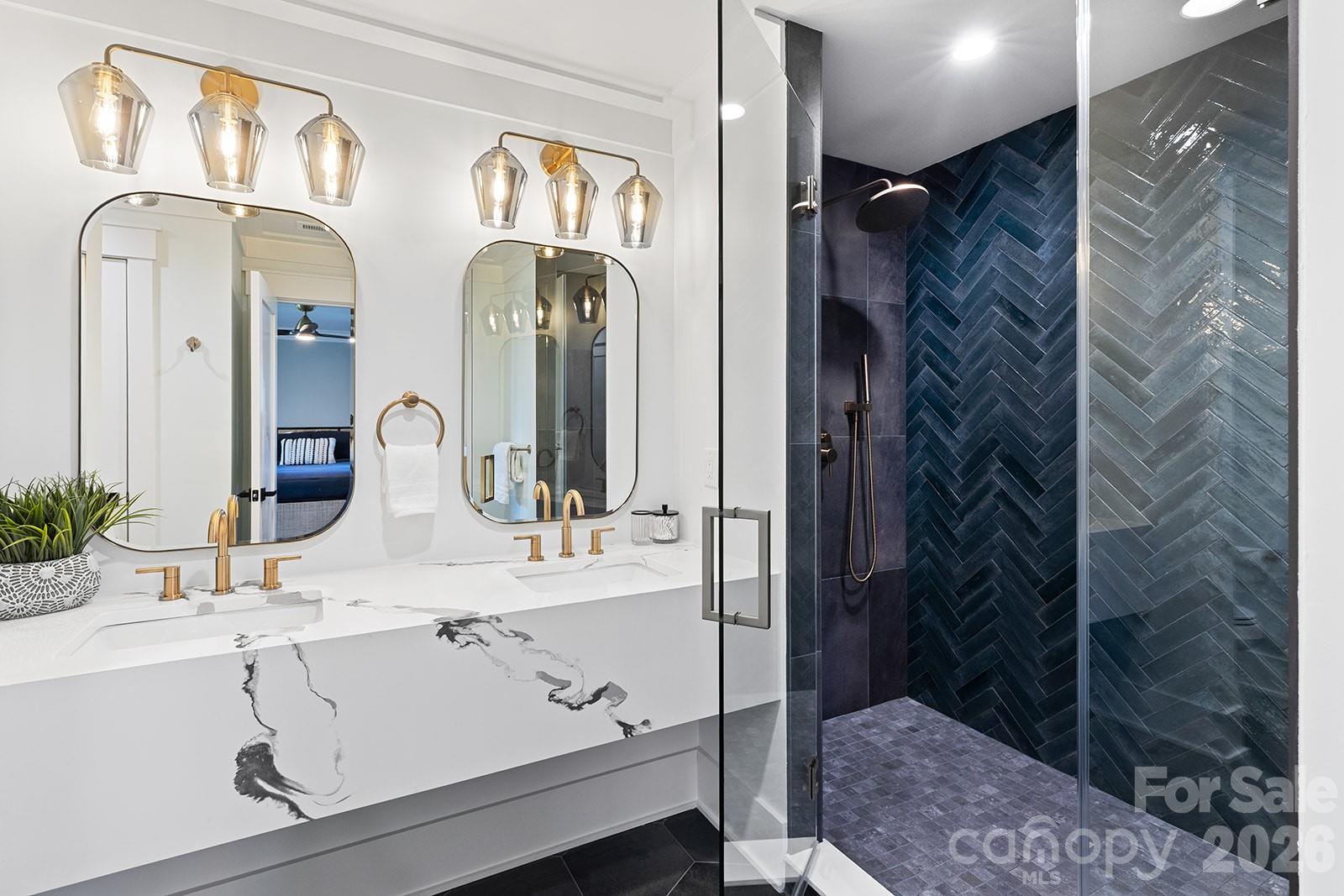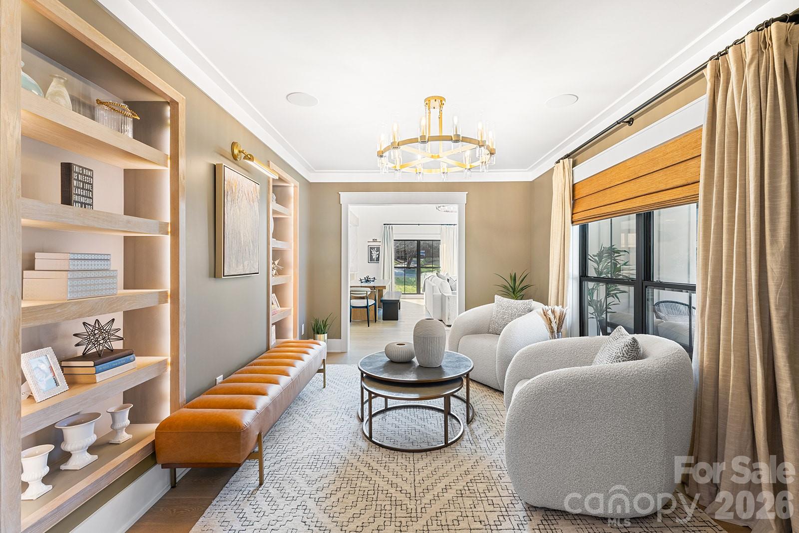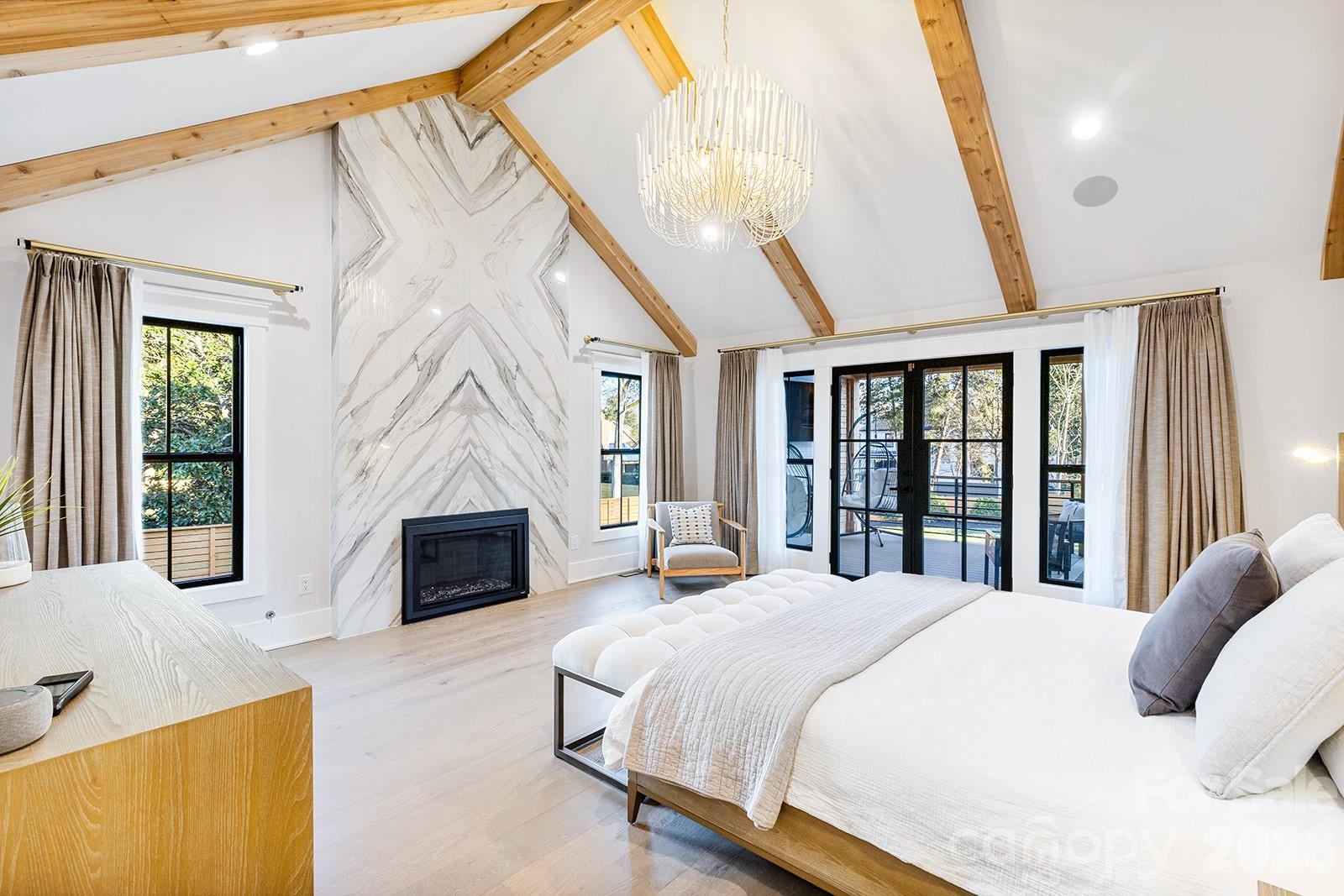 Set in South Charlotte’s Montibello neighborhood & convenient to prestigious schools in South Park & South Charlotte, along with Carmel Country Club & Quail Hollow Club, this 6BR/6.5BA home is intentionally designed w/ a focus on craftsmanship, flow, & livability—every detail thoughtfully laid out & intentionally designed. From the entry, custom modern molding, architectural millwork, decorative wood paneling, & wood-accented ceiling details establish a refined tone. 7.5” engineered white oak floors run throughout, paired w/ tile selections sourced exclusively from Queen City Stone & Tile & lighting curated by Lumi Lighting & Home Design. The kitchen anchors the home w/ custom rift-sawn white oak cabinetry, a 12’ black island, Calacatta Castana quartz 2.5” mitered waterfall countertops, pot filler, prep sink w/ reverse osmosis filtration faucet, & a concealed scullery w/ freezer & refrigerator drawers plus extensive pantry storage. A full suite of GE Monogram custom panel appliances is anchored by a 48” dual-fuel range w/ six burners & built-in griddle, accented by a Black Venetian plaster custom range hood. Built-in refrigerator/freezer & two fully integrated dishwashers blend seamlessly into the cabinetry, while a microwave drawer & 36” Kohler Whitehaven farmhouse sink complete the workspace. The kitchen transitions seamlessly into the great room w/ 24’ ceilings, anchored by a floor-to-ceiling Black Venetian plaster fireplace custom-crafted by a local artisan & framed by architectural beams. The dining room features custom millwork & is finished in SW Tricorn Black for a dramatic yet sophisticated setting. A wet bar/wine wall connecting the kitchen & dining room includes a Wine Sommelier refrigerator, Blanco Diamond SILGRANIT prep sink, & custom rift-sawn white oak cabinetry. The home features front & back staircases. Living spaces include a main-level primary suite & a secondary primary upstairs, offering flexibility for multi-generational living or guest retreat. The main-level primary features vaulted ceilings w/ architectural beams, a matchbook porcelain slab gas fireplace, soundproofing for privacy, & a spa-caliber bath w/ freestanding soaking tub, oversized shower w/ rain head + 2 additional heads, a two-person Sunlighten Signature infrared sauna w/ interior lighting & integrated speakers, & a fully customized closet w/ center island, 17 drawers, & laundry pullouts. The main-level office offers floor-to-ceiling built-ins, shiplap accent wall, integrated desk, & modern trim detailing. The pool house kitchen features Cristallo quartzite countertops w/ undercounter LED lighting, dishwasher, beverage fridge, & hydraulic bar window opening to the pool deck, along w/ indoor lounging space & full bath. Outdoor living includes a heated gunite saltwater pool w/ integrated spa, tanning ledges, water features, & custom leathered marble hardscaping, supported by landscape irrigation & outdoor audio speakers. A covered back porch adds a second gas fireplace & access to the main-level primary. Additional highlights include wiring in place for future porch heaters front & back, plus hot & cold exterior spigots for a future outdoor shower. Upstairs, white oak flooring continues, along w/ a built-in homework center w/ integrated desk, shelving, & storage. In addition to the secondary primary, there are four additional bedrooms, all w/ walk-in closets. Bedroom layout includes four ensuite baths, one direct-access bath, & one shared hall bath. Two upstairs bedrooms are soundproofed. Delta & Brizo fixtures throughout. Integrated surround sound throughout the main level & bonus room, w/ invisible architectural speakers in the kitchen, plus surround sound on both covered porches & a dedicated outdoor audio system serving the pool area.