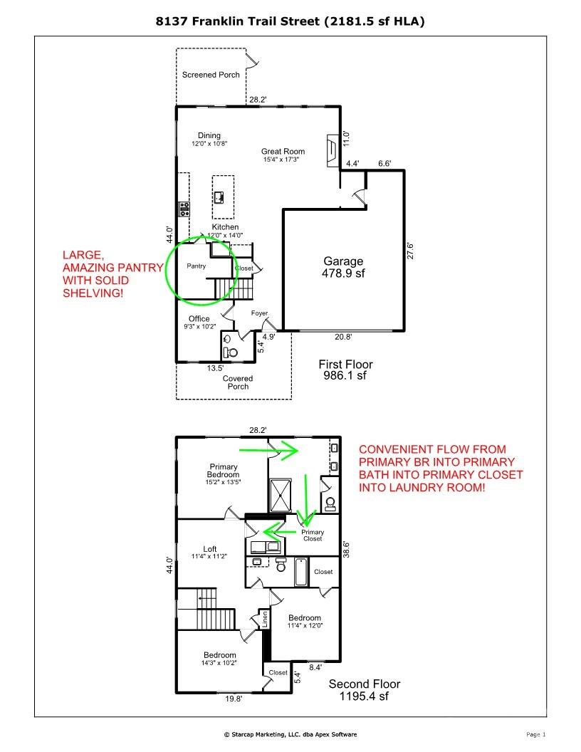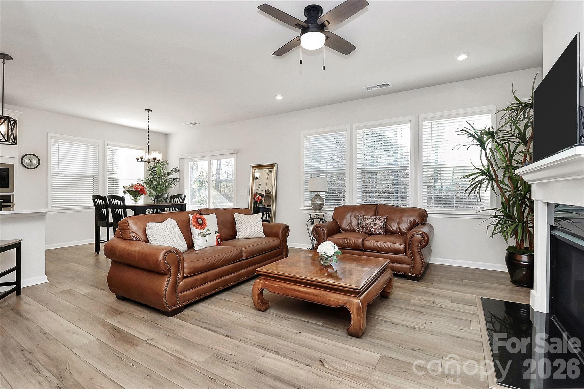 The inviting Great Room and Dining Area feature a GAS FIREPLACE and open seamlessly to a COVERED SCREENED PORCH, creating the perfect space for relaxing or entertaining year-round. Luxury vinyl plank flooring extends up the staircase, complemented by OPEN-RAIL BALUSTERS on both floors for a modern, airy feel.