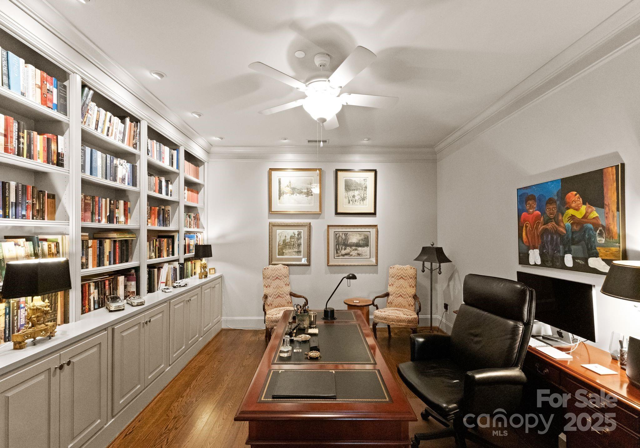 A large private office/bonus room with gorgeous built-in bookshelves provides the ideal space for working, relaxing, or library-style retreat. The luxurious primary suite includes a generous walk-in closet and a spa-inspired bath with dual vanities, soaking tub, and separate shower. Each of the two additional bedrooms offers its own en suite bath, providing comfort and privacy for family or guests. A spacious laundry room and separate service entry add thoughtful convenience.