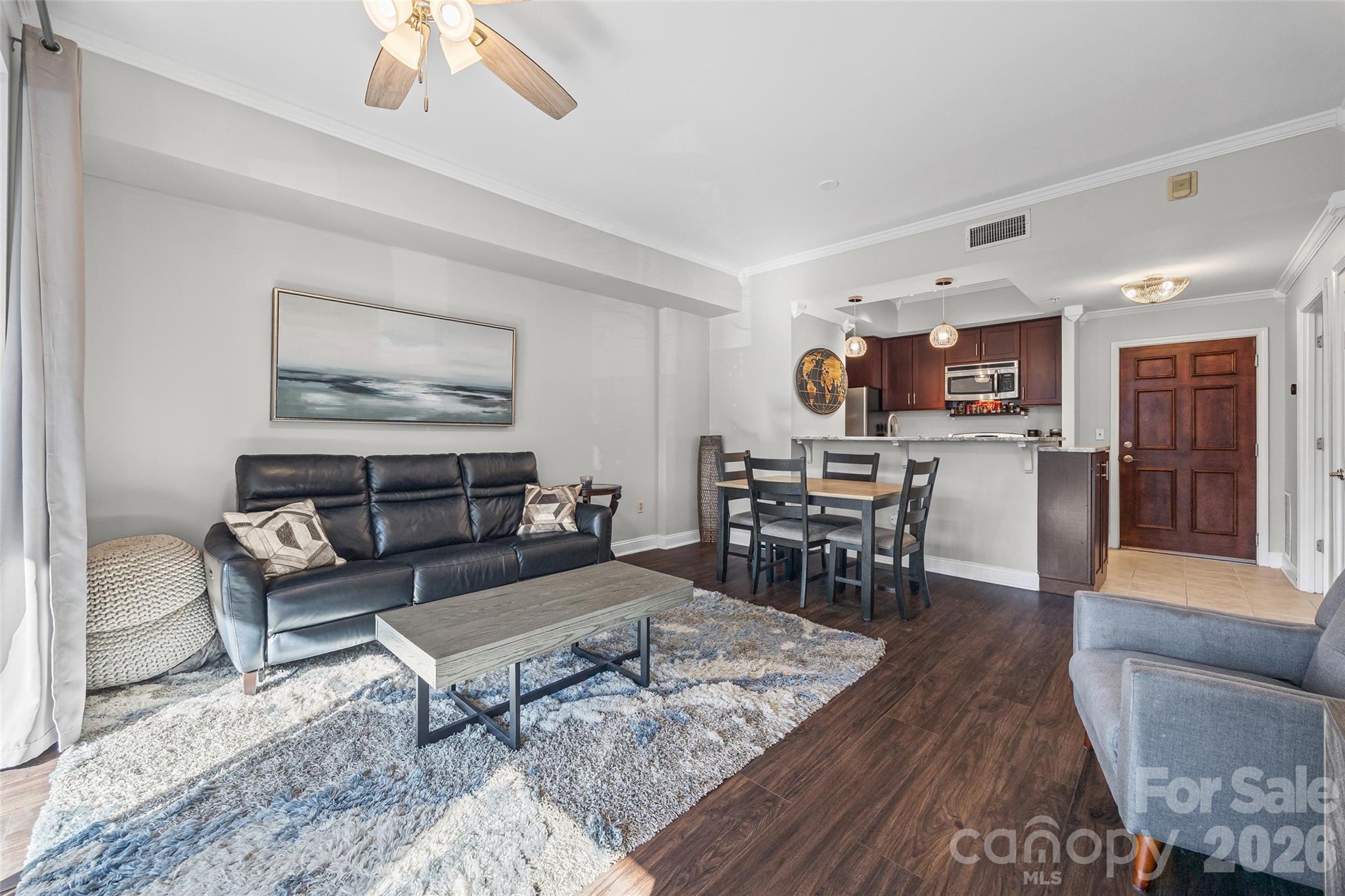 Experience elevated Uptown living in this well maintained 1 bedroom 1 bath condo ideally located in the heart of Charlotte. The open concept layout offers abundant natural light, and a seamless flow between the living, dining, and kitchen areas. The kitchen features rich cabinetry, stone countertops, stainless steel appliances, and a convenient breakfast bar, ideal for everyday living and entertaining. The spacious bedroom includes a walk in closet and easy access to the full bath with a large vanity and walk in shower. Step outside to a covered balcony, perfect for relaxing or enjoying city views. Residents enjoy access to a secure amenity rich community featuring a fitness center, resort style heated pool, resident lounge with fireplace, media room, cyber cafe and business center, coffee bar, putting green, dog park, and beautifully maintained common areas. Onsite conveniences include a Harris Teeter supermarket, dry cleaners, salon and spa, nail salon, access controlled parking garage, and key fob entry. Located just steps from Uptown dining, shopping, entertainment, and major employers, this home offers a low maintenance lifestyle in one of Charlotte’s most walkable locations.
