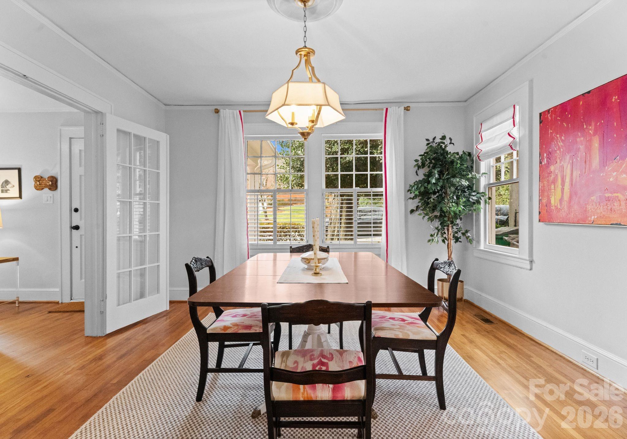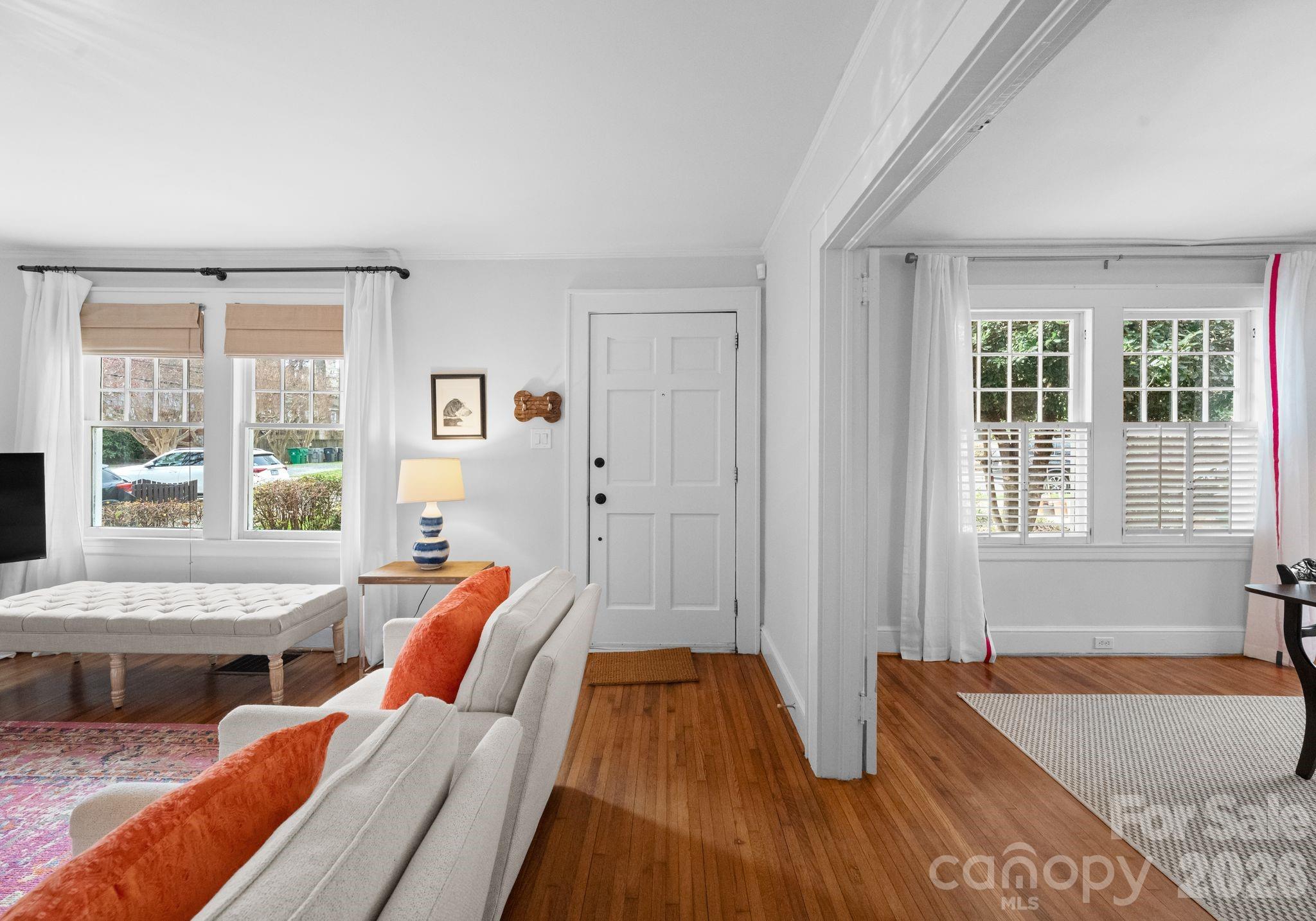 Adorable and whimsical 1928 bungalow perched perfectly in the heart of Dilworth, brimming with timeless character and undeniable curb appeal. From the inviting covered front porch with a bright pink front door, this home makes a memorable first impression. The freshly painted gray exterior highlights the home’s charming architectural details and classic 1920s character. Inside, original hardwood floors and original windows featuring "wavy glass" add to the vintage charm. The jewel-box décor highlights a classic black-and-white kitchen with built-ins and a cozy breakfast nook, while a beautiful mantle serves as the centerpiece of the bright, sun-filled living room. The living room, dining room, and kitchen flow seamlessly together, creating an ideal space for both everyday living and entertaining. The home offers three bedrooms—one currently used as an office and without a closet—along with one and a half baths, including a powder room full of personality. A tucked-away laundry closet and drop zone/pantry area add convenience, and a wooden deck overlooks the private, fenced backyard—perfect for relaxing or entertaining in one of Charlotte’s most beloved neighborhoods.