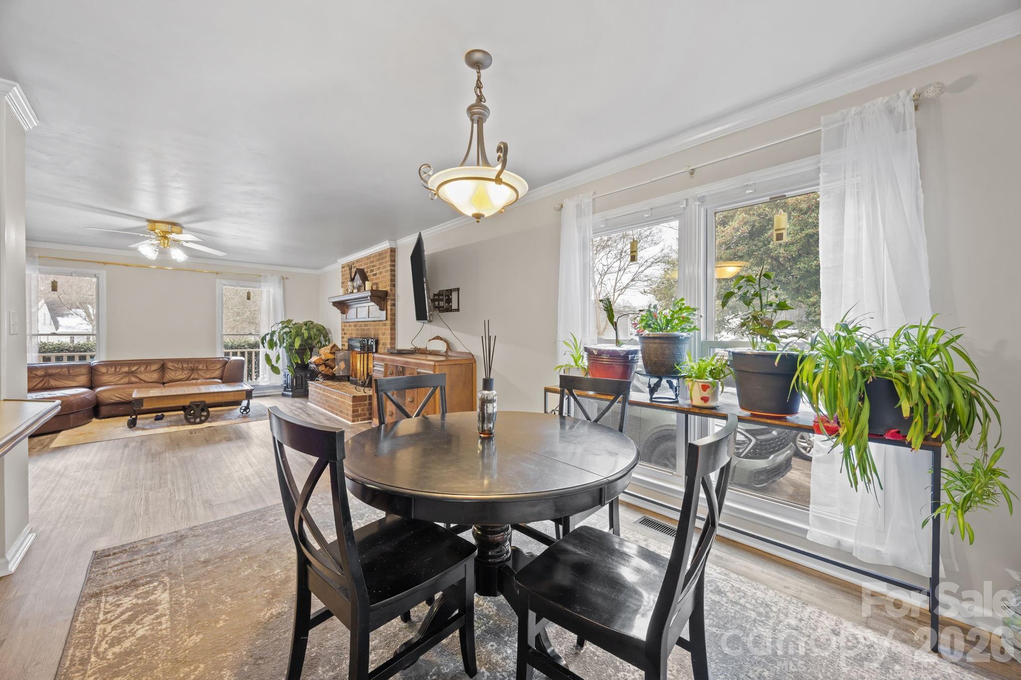 The living room features a charming wood-burning fireplace, creating a cozy focal point for gatherings. The kitchen has been refreshed with new paint, updated appliances, and a stylish backsplash.