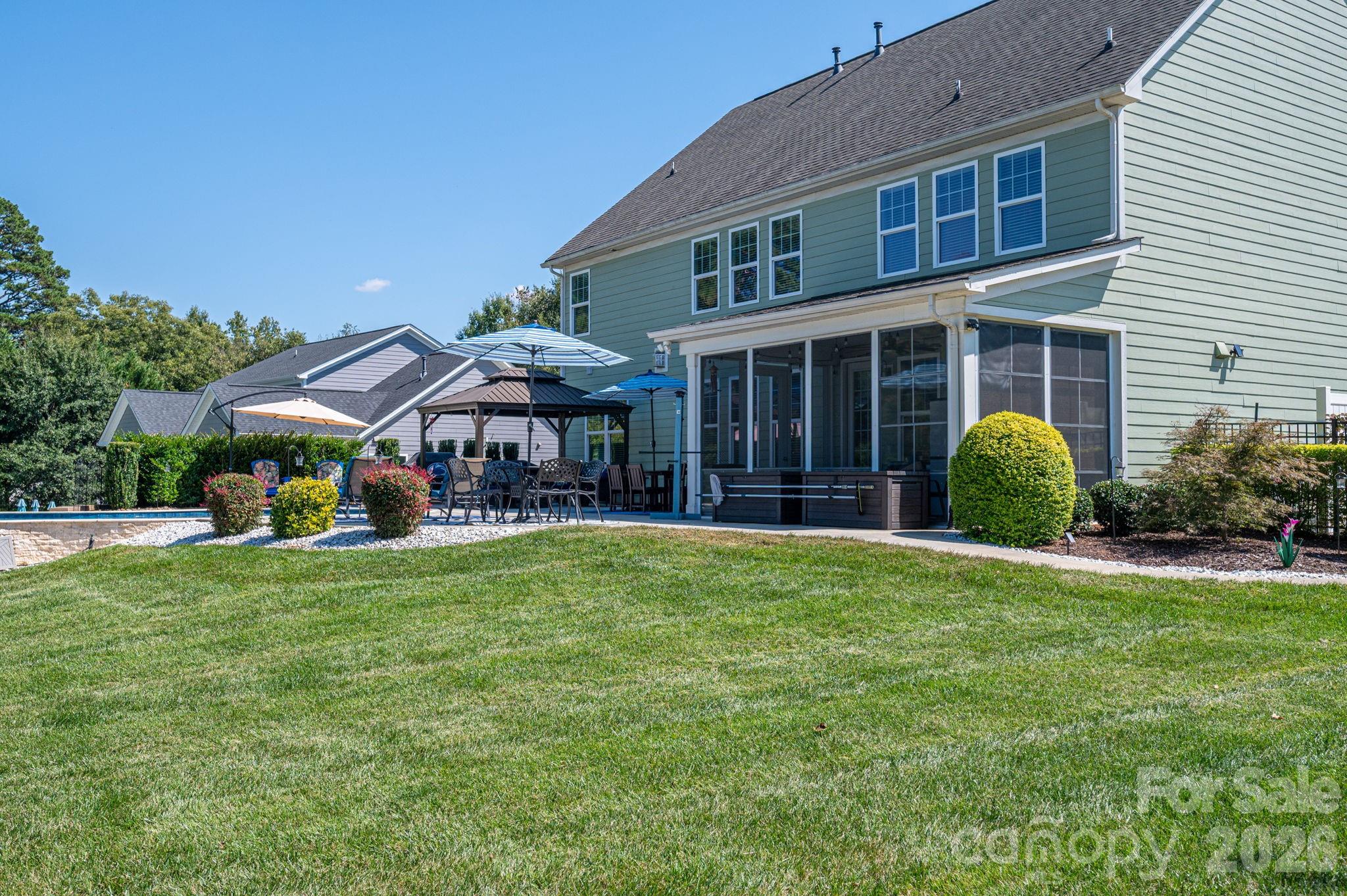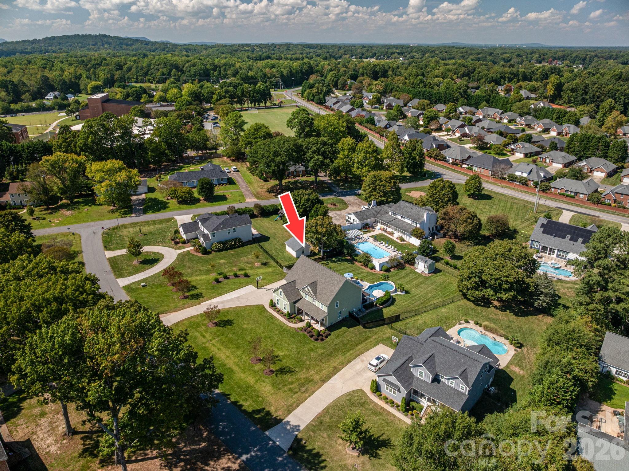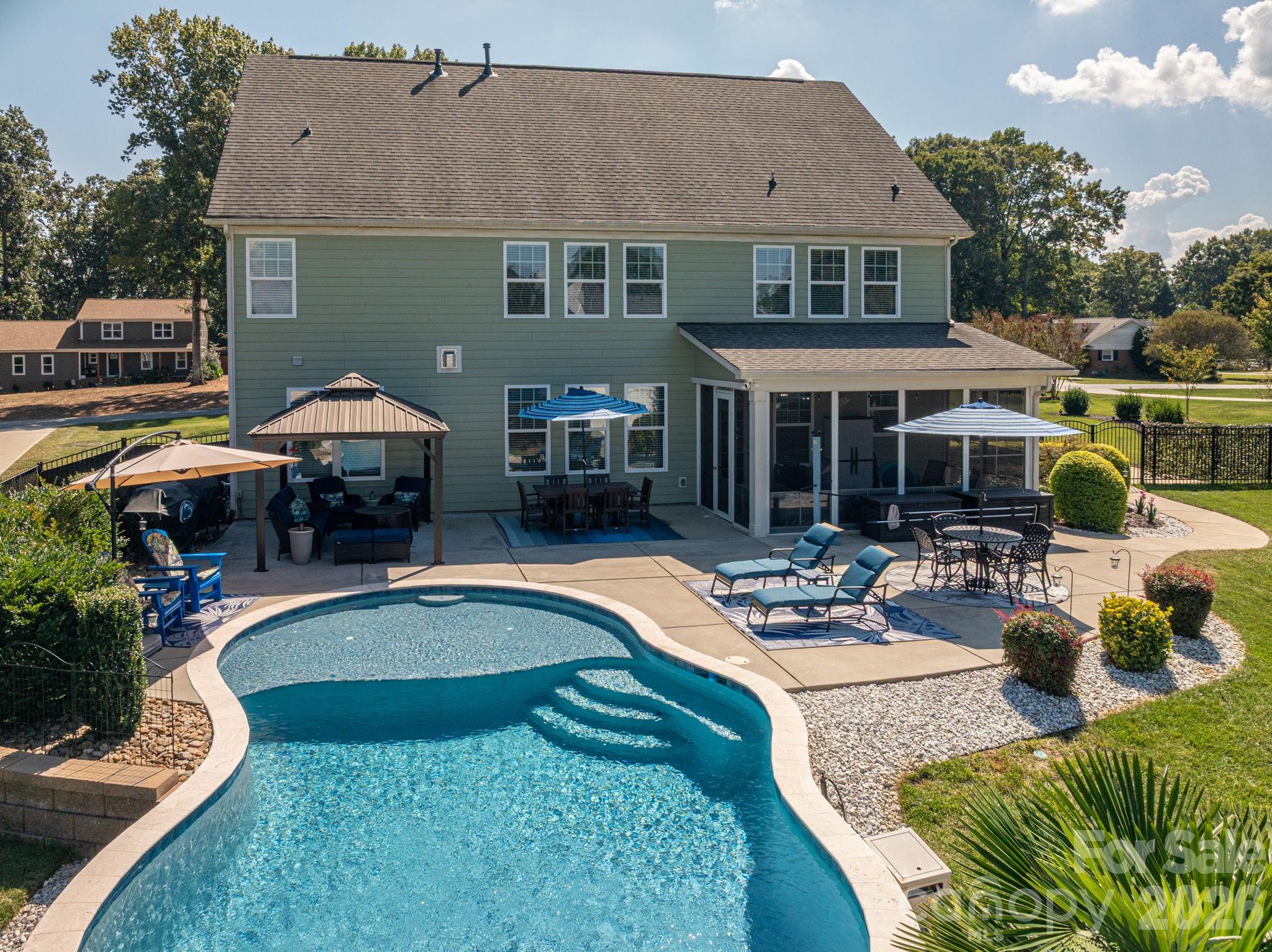Nestled in one of Gastonia's most sought-after areas, this stunning five-bedroom, four-bathroom estate perfectly balances refined entertaining with relaxed daily living. Designed with elegance, functionality, and comfort in mind, this exceptional home offers the ideal blend of style, space, and serenity. Step inside to discover a thoughtfully designed floor plan, beginning with a formal dining room featuring an attached bar area-perfect for hosting-alongside a private home office enclosed with classic French doors. The space flows effortlessly into a spacious living room highlighted by custom built-in bookcases and a striking stone fireplace. The gourmet kitchen is a chef's dream, boasting premium appliances, an oversized island, and exquisite finishes that elevate everyday cooking and entertaining. A main-floor bedroom with an attached full bath adds convenience and flexibility for guests or multigenerational living. Upstairs, the luxurious master suite offers a spa-like retreat with an oversized shower and a generous walk-in closet. A large bonus room with charming barn-style doors creates the perfect space for a media room, playroom, or additional entertaining area. Step outside to your private backyard oasis-sure to impress even the most discerning buyer. Enjoy a spacious screened porch, a custom patio area, and a stunning inground saltwater pool, all set against the backdrop of an expansive and beautifully landscaped yard. This home is a rare opportunity to experience luxury living in a prime location--don't miss it!