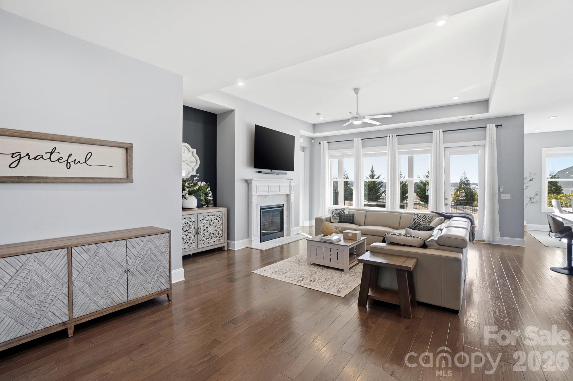 The bright, open floor plan is filled with abundant natural light, enhanced by 10-foot ceilings and 8-foot doors, creating an impressive sense of space and openness. Wood flooring flows throughout the main living areas, while a gas fireplace adds warmth and charm to the great room.