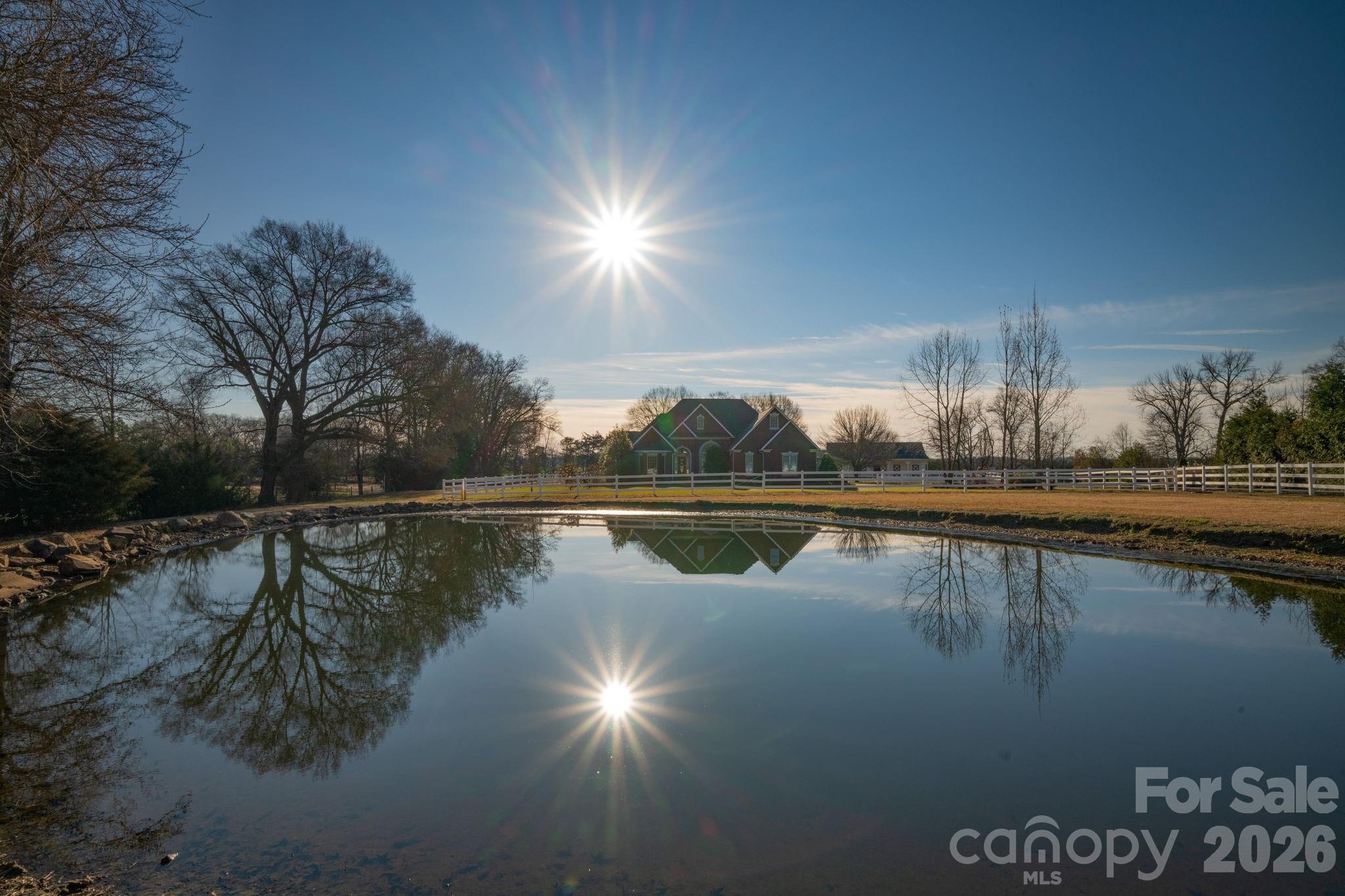 The full brick home offers expansive windows overlooking the landscaped grounds, pond, and farm areas. The split/open floor plan features a primary suite with sitting area and fireplace on one side of the home, along with an additional bedroom or office, while guest suites are located on the opposite side for privacy. Interior details include refinished hardwood floors, chair rail molding, crown molding, and columns that maintain an open yet defined layout.