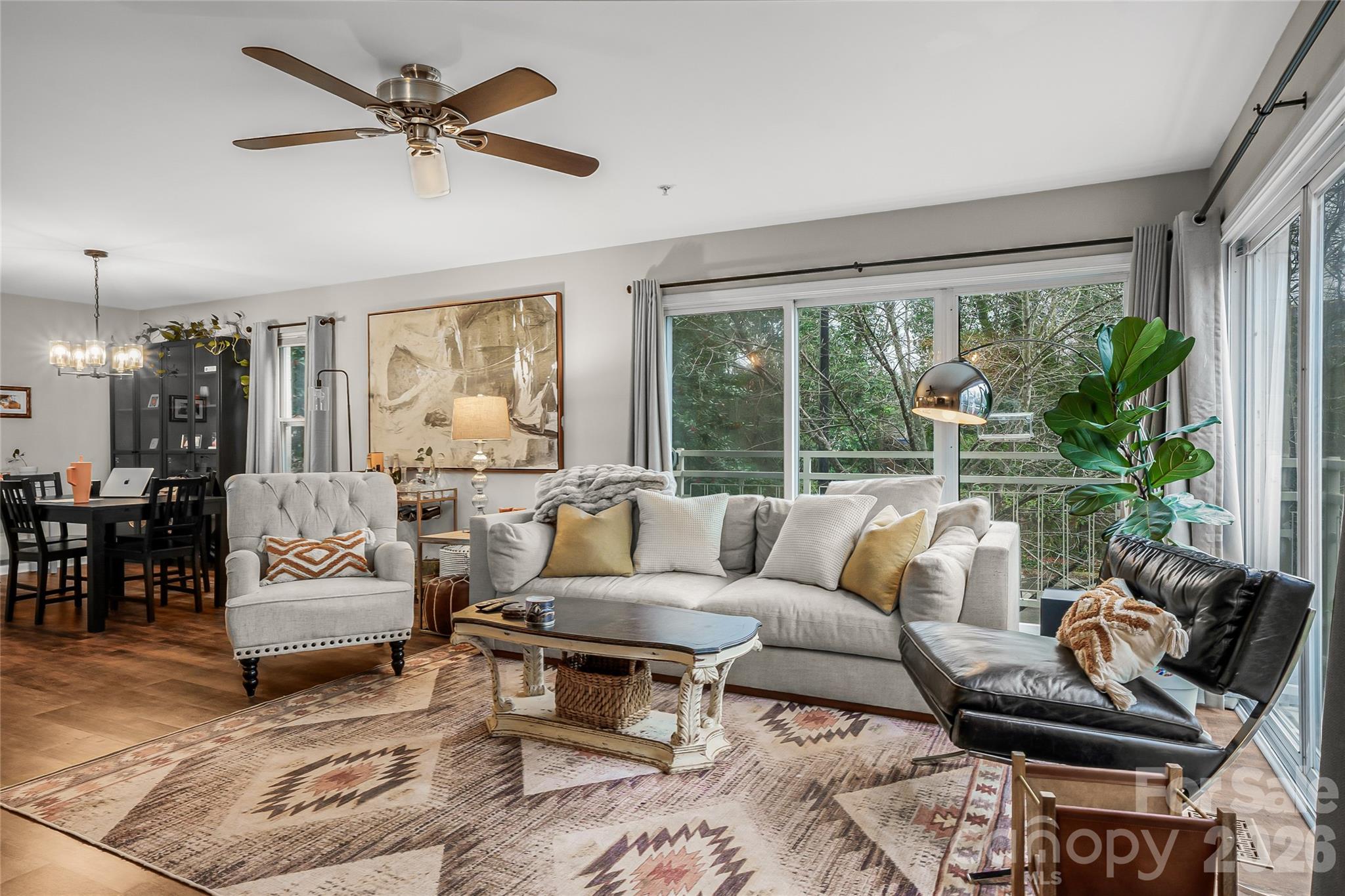 Stylish 2-story end-unit condo in the heart of NoDa’s popular Arts District! This light-filled home features an open kitchen overlooking the living and dining areas, highlighted by double sliding doors that flood the space with natural light. The primary bedroom is conveniently located on the main level, offering comfort and functionality.