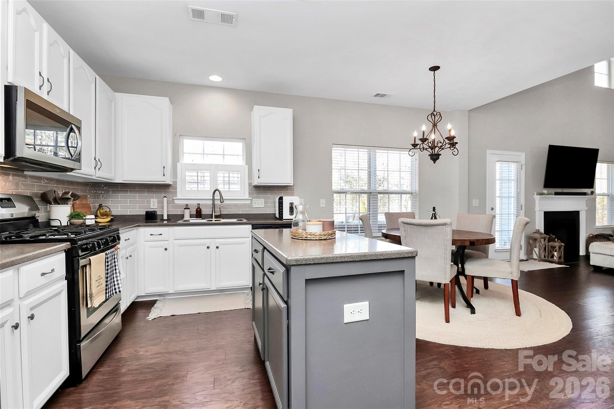 The kitchen is designed for connection and comfort, featuring 42" cabinets, Corian countertops, a generous island ideal for family gatherings, a convenient computer niche, and stainless steel appliances—including a gas range and dishwasher updated in 2020 and a microwave added in 2024—perfect for everyday meals and special occasions alike.