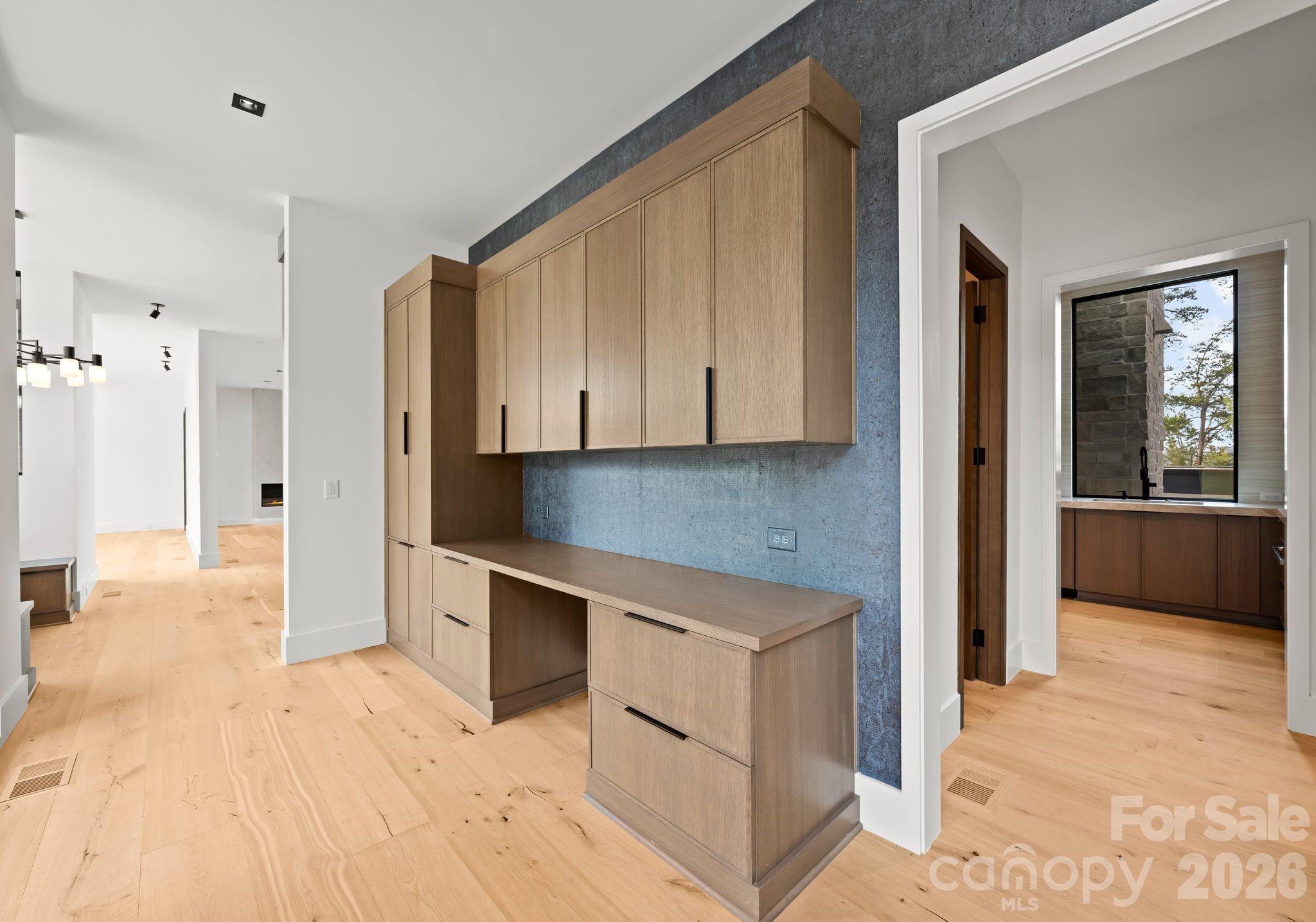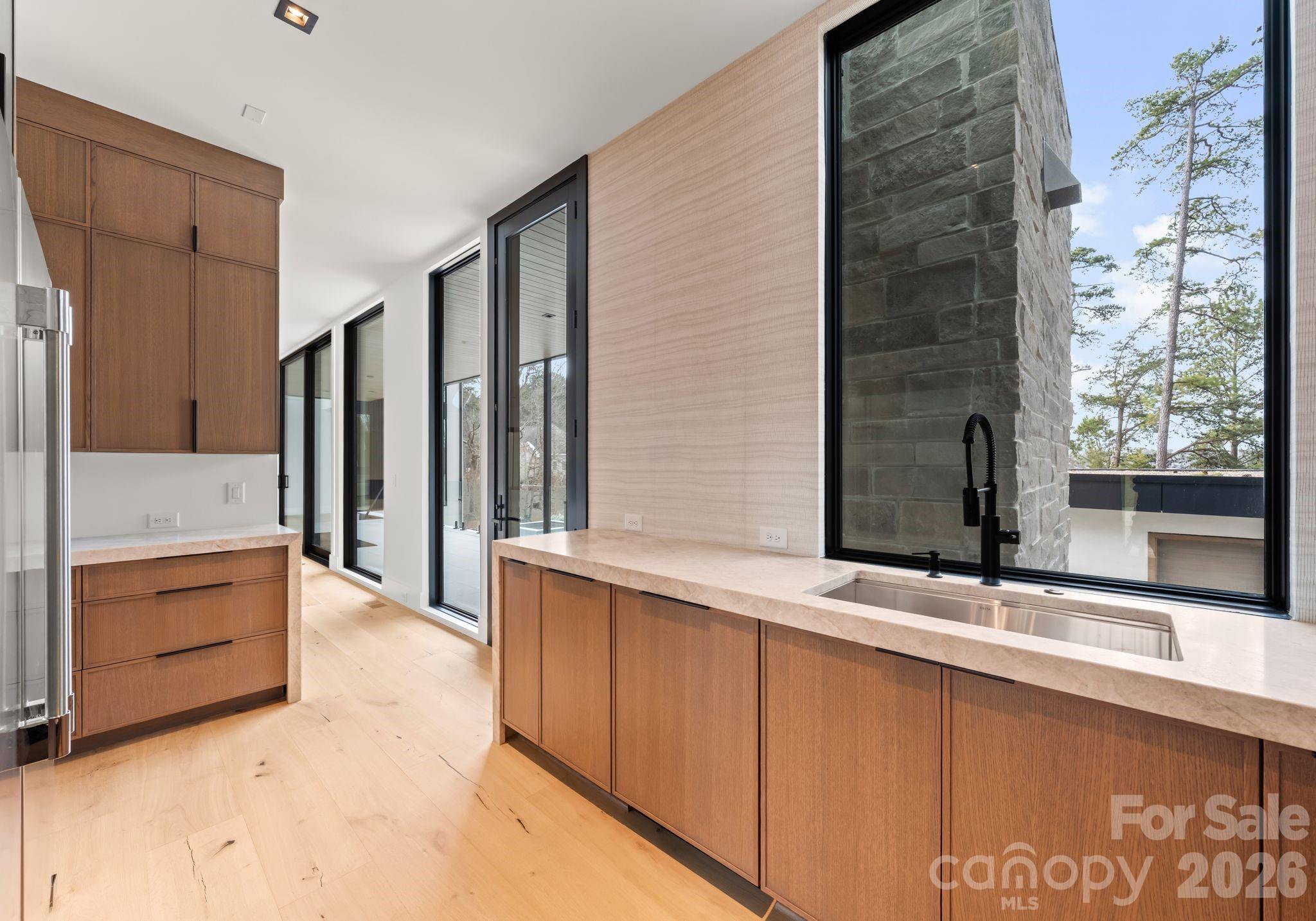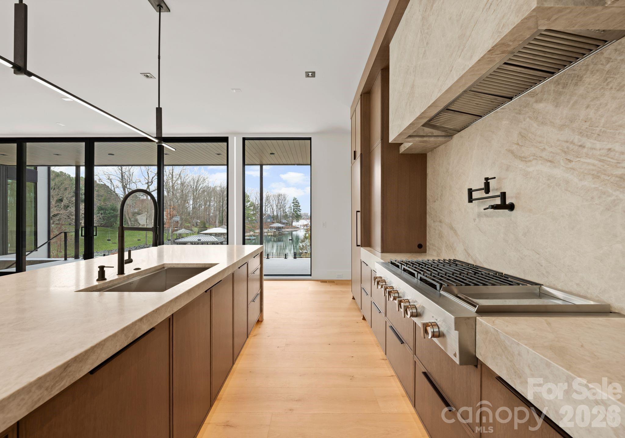 A dramatic two-story foyer welcomes you through a striking 10-foot solid oak pivot door, immediately framing sweeping lake views beyond. The open-concept main level is anchored by 10-inch-wide white oak hardwood floors and walls of floor-to-ceiling windows that flood the home with natural light. The chef’s kitchen is a true showpiece, featuring an oversized Taj Mahal quartzite island, floor-to-ceiling soft-close cabinetry, hidden paneled Bosch appliances, and a breakfast nook with custom built-in storage. A beautifully appointed scullery provides additional prep space, a spacious walk-in pantry, secondary appliances, and seamless access to the outdoor patio for effortless indoor-outdoor living. The living and dining areas flow seamlessly from the kitchen, ideal for intimate gatherings and larger-scale entertaining, with the living room anchored by a sleek modern gas fireplace.