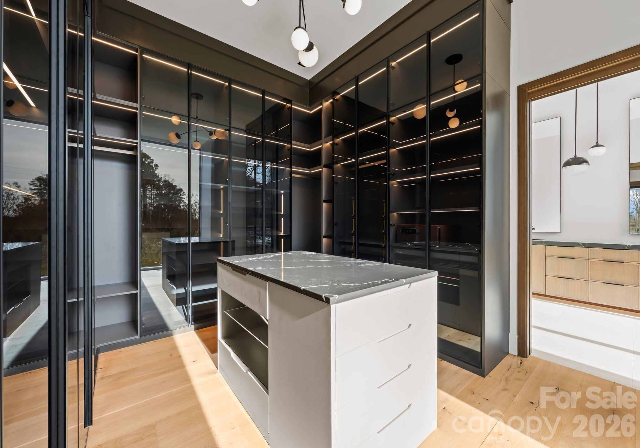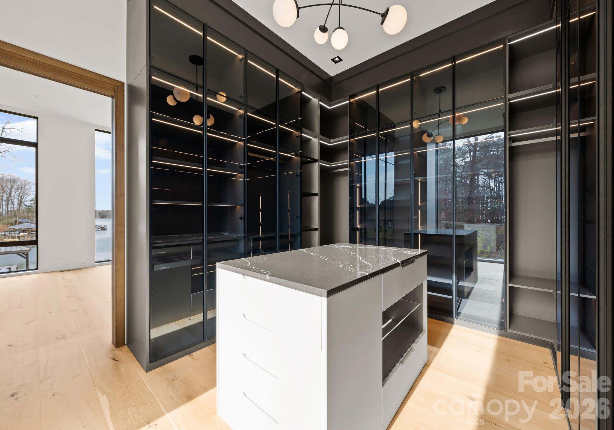 Privately located on the main level, the primary suite serves as a serene retreat with expansive lake views, a gas fireplace, and a custom walk-in closet featuring a center island, custom jewelry drawers, and integrated LED lighting. The spa-inspired bath offers a soaking tub, oversized walk-in shower, and elegant stone finishes. Also on the main level is a flexible office or guest suite, complete with corner floor-to-ceiling windows, double-door closet, and a full bathroom.