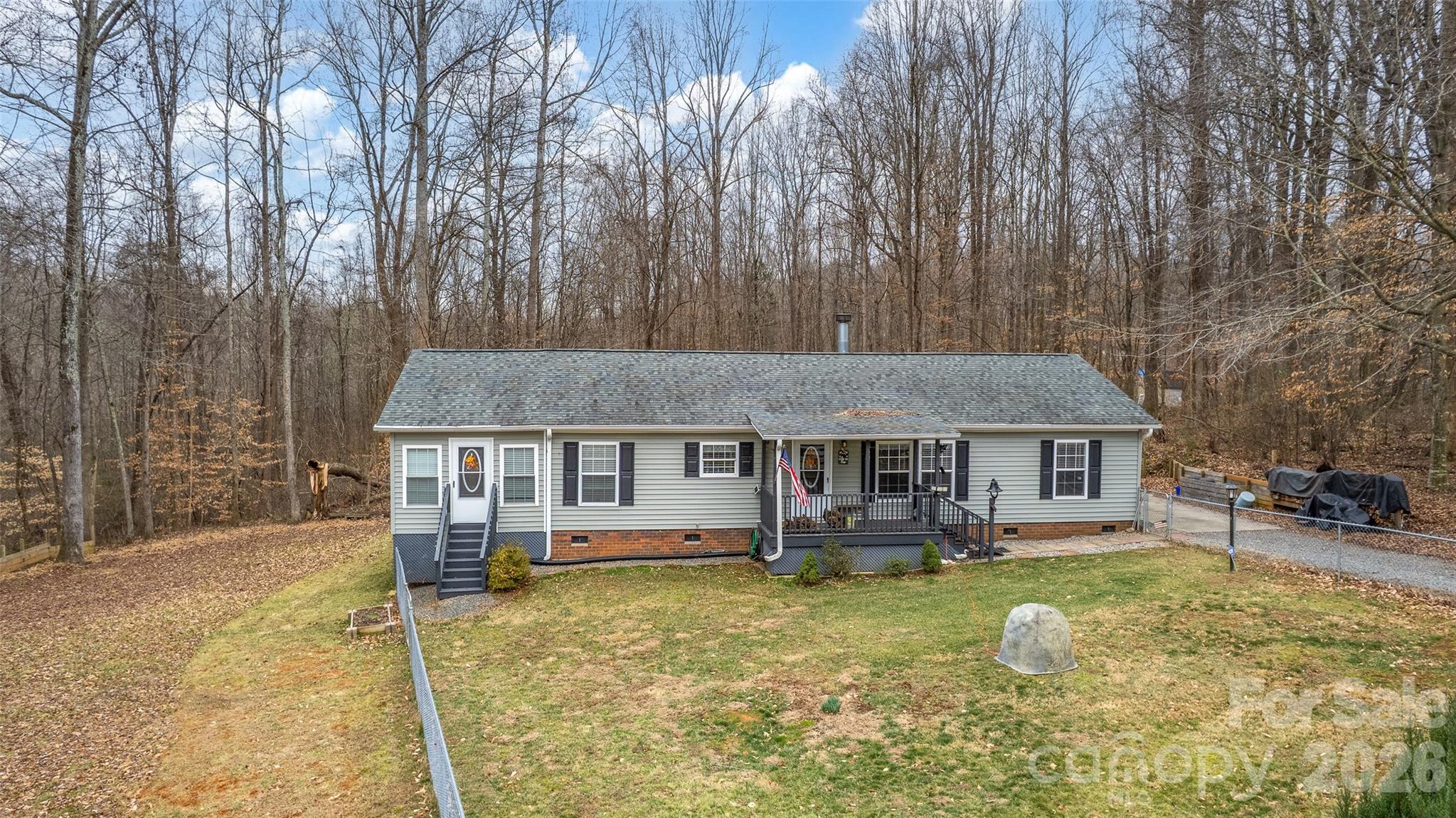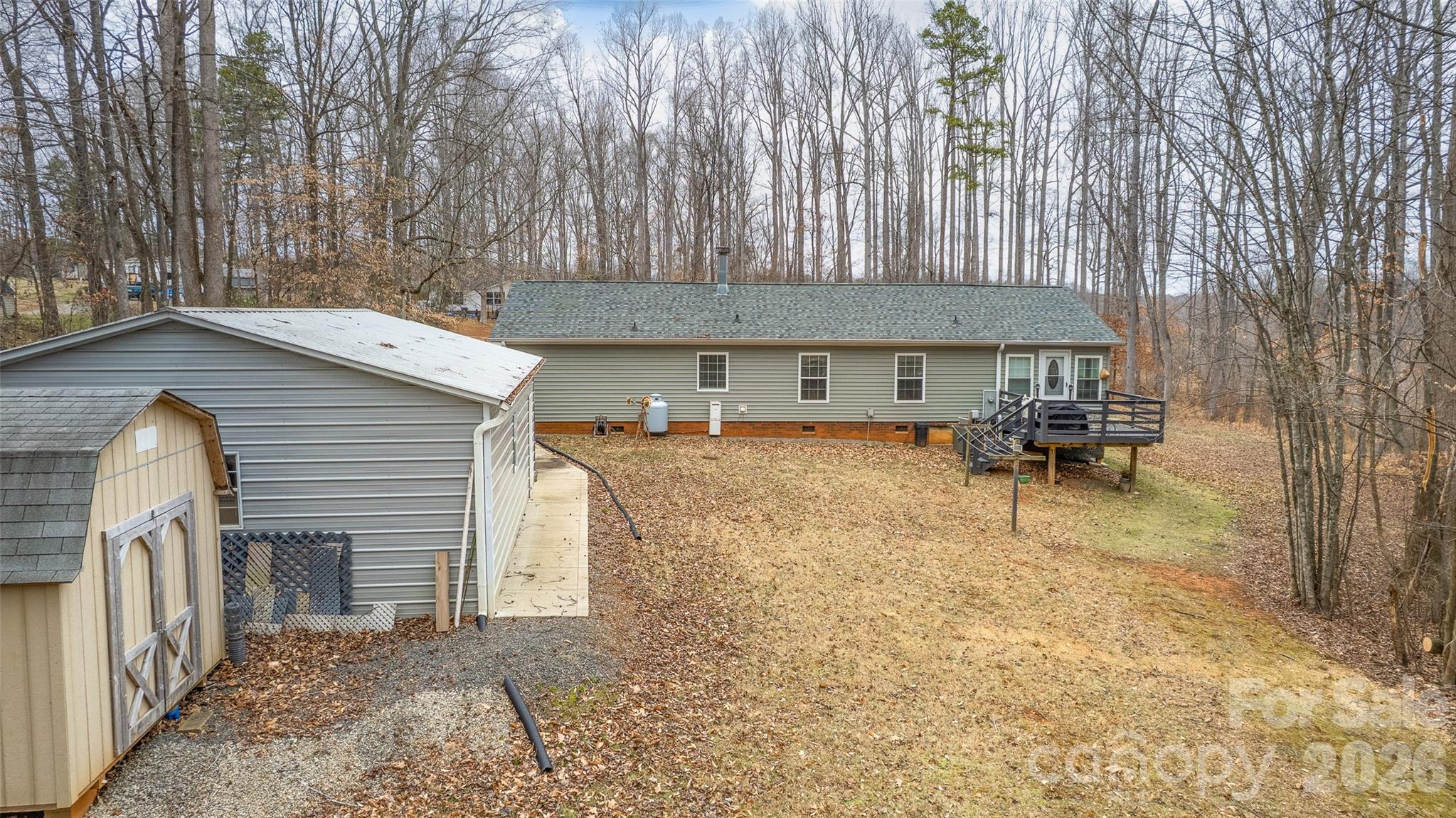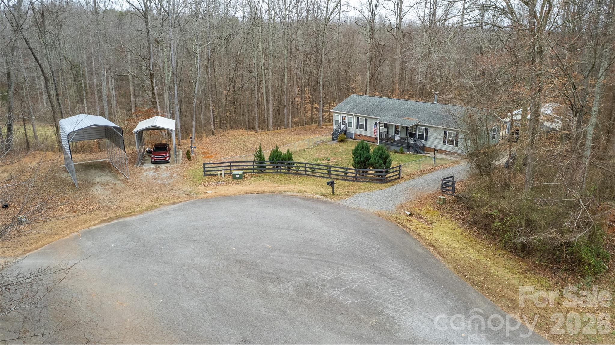 A tastefully updated and immaculately maintained ranch-style home on a 2.43 acre wooded cul de sac lot that backs to a creek; Lovingly cared for, this home needs nothing but you, your furniture and your toys for the garage shop and the 3 carports; 2 wooded cul de sac lots were combined in to this 2.43 acre property; A new kitchen in 2017 features granite counters, a tiled backsplash, all stainless steel appliances (dishwasher 2025), real wood cabinets and a double stainless steel sink; The spacious living room has a functioning wood burning fireplace; The den was added in 2017 and features plenty of windows to let in the natural light and to let you enjoy being surrounded by woods; The den has recessed lights, ceiling lightfans and 2 exterior doors with one of them being to the rear deck; The primary bedroom has a large walk-in closet and a generously-sized primary bathroom that was redone in 2017: granite counters, vanity, elongated toilet and a walk-in shower; Bedrooms 2 and 3 have closets and ceiling lightfans; The main bathroom updates include an elongated toilet and a tubshower; Off the kitchen and connected to the den is the walk-in pantry and laundry area; Neutral paint color thruout; Refrigerator, washer and dryer are included; 2019 updates: the roof and siding; 2017 updates: the convenient covered front porch, the hardwood plank and vinyl plank flooring, the shed and the single carport; HVAC in 2018; The house carport, 2020; The RV carport, 2025; The 32' x 24' garage shop was built in 2017 and features 2 overhead doors with auto openers, a separate electric panel, fluorescent lights, steel beam framing, insulated walls, a concrete floor and heat and air; The Rinaii tankless water heater is fueled by propane with a leased tank; The housewide water softener is included in the sale; The well expansion tank was new in 2025; Property markers can be seen at the front of the cul de sac; This home is minutes to Highways 77, 64 and 70;