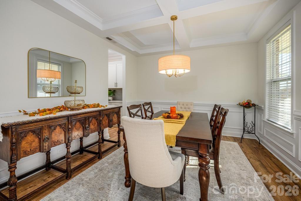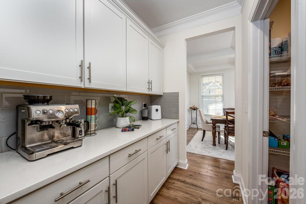 Step inside to discover a warm and inviting atmosphere, perfect for both relaxation and entertaining. The thoughtfully designed layout features a cozy gas fireplace, elegant LPV flooring, and a gourmet kitchen that will inspire your culinary adventures. With stainless steel double ovens, a gas cooktop, loads of storage with pull out shelves and stunning countertops, it’s a chef’s paradise. The oversized butler’s pantry seamlessly connects the kitchen to the formal dining area adorned with a charming coffered ceiling.