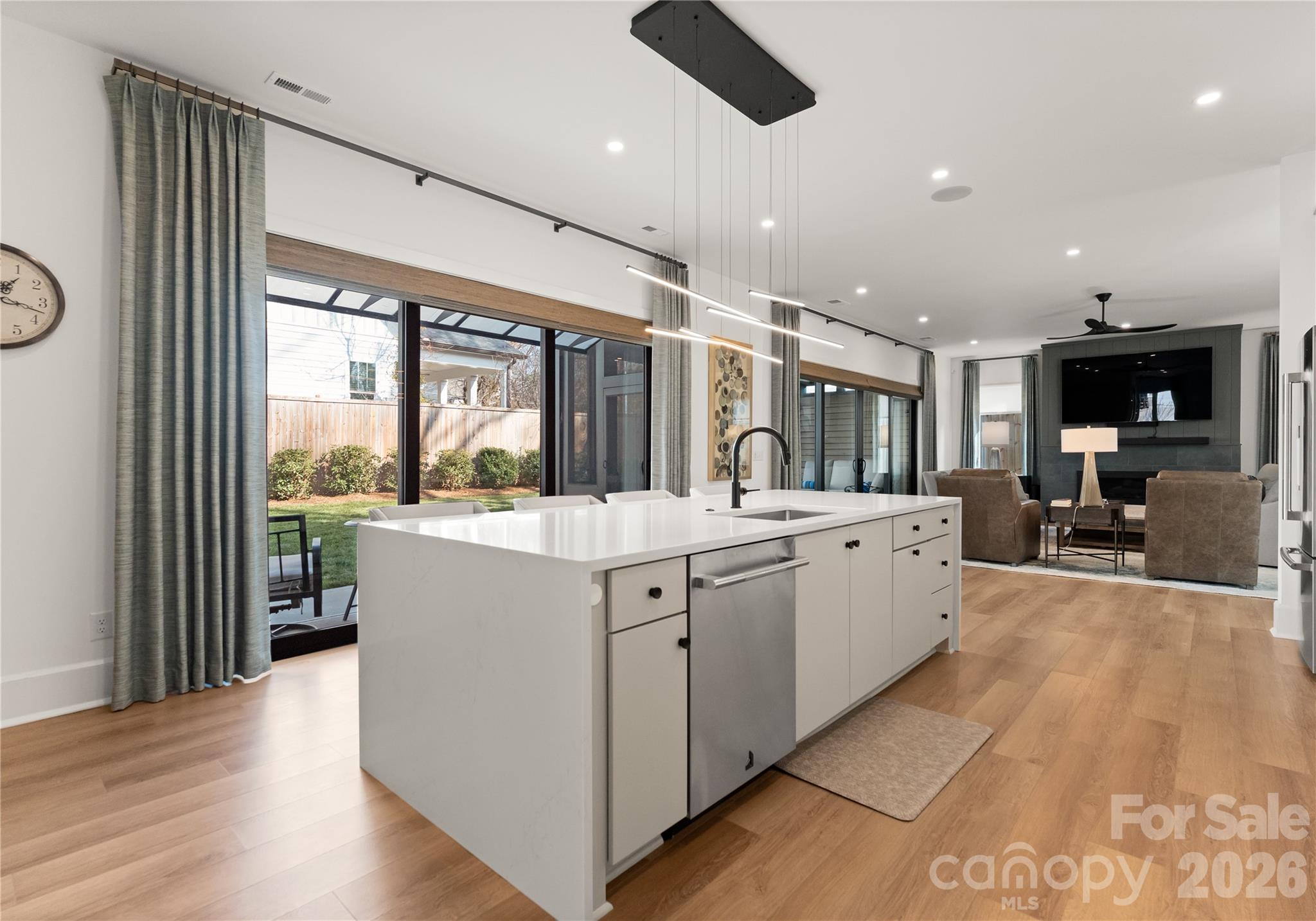 Designed with a wide, expansive footprint and modern open-concept living in mind, the main level is both functional and impressive. The luxury kitchen features a massive island, custom cabinetry, and top-of-the-line appliances, seamlessly flowing into the oversized living room. A sleek linear fireplace and stylish built-in bar create the ultimate entertaining space, while large doors open directly to the screened porch for effortless indoor-outdoor living. The main floor also offers a separate dining room and a dedicated office, perfect for working from home.