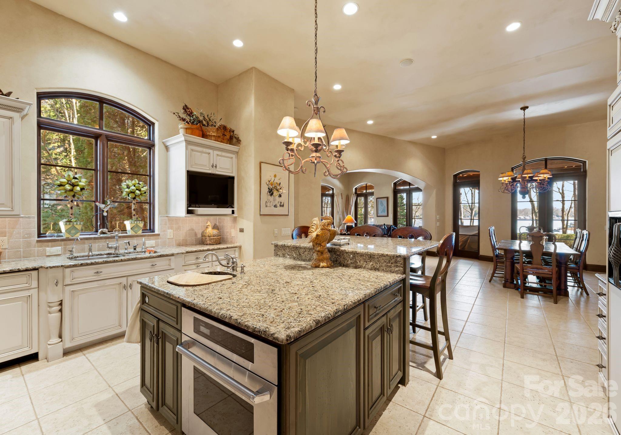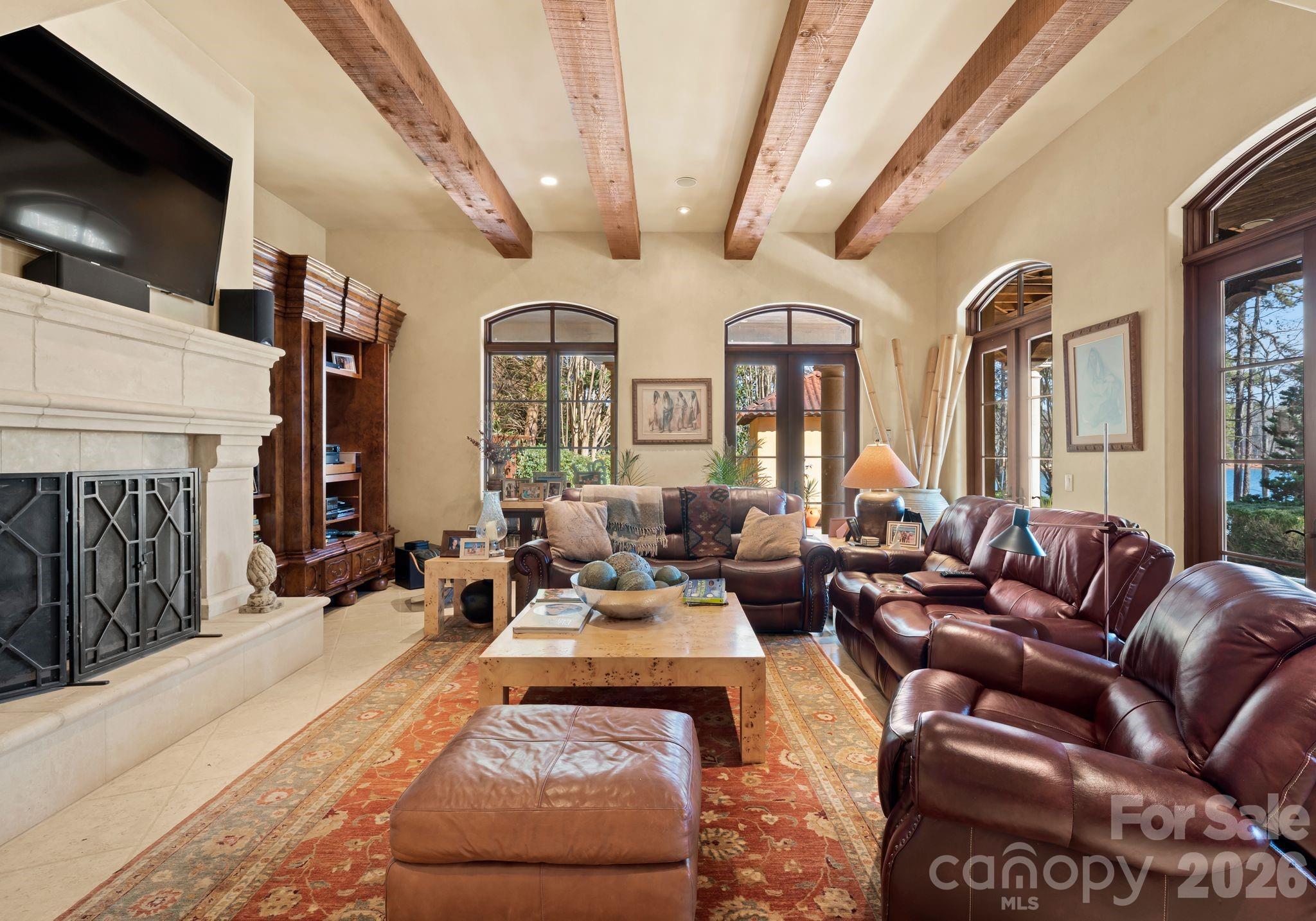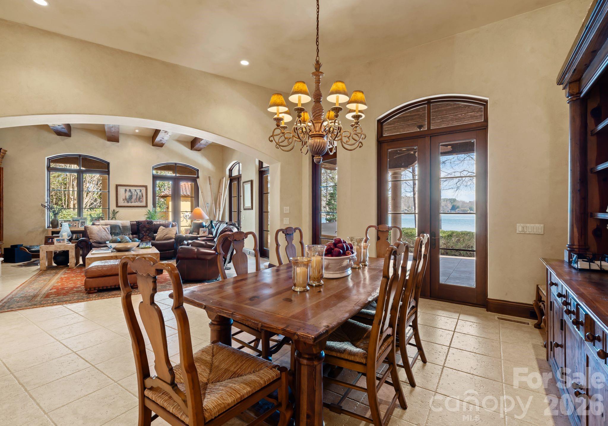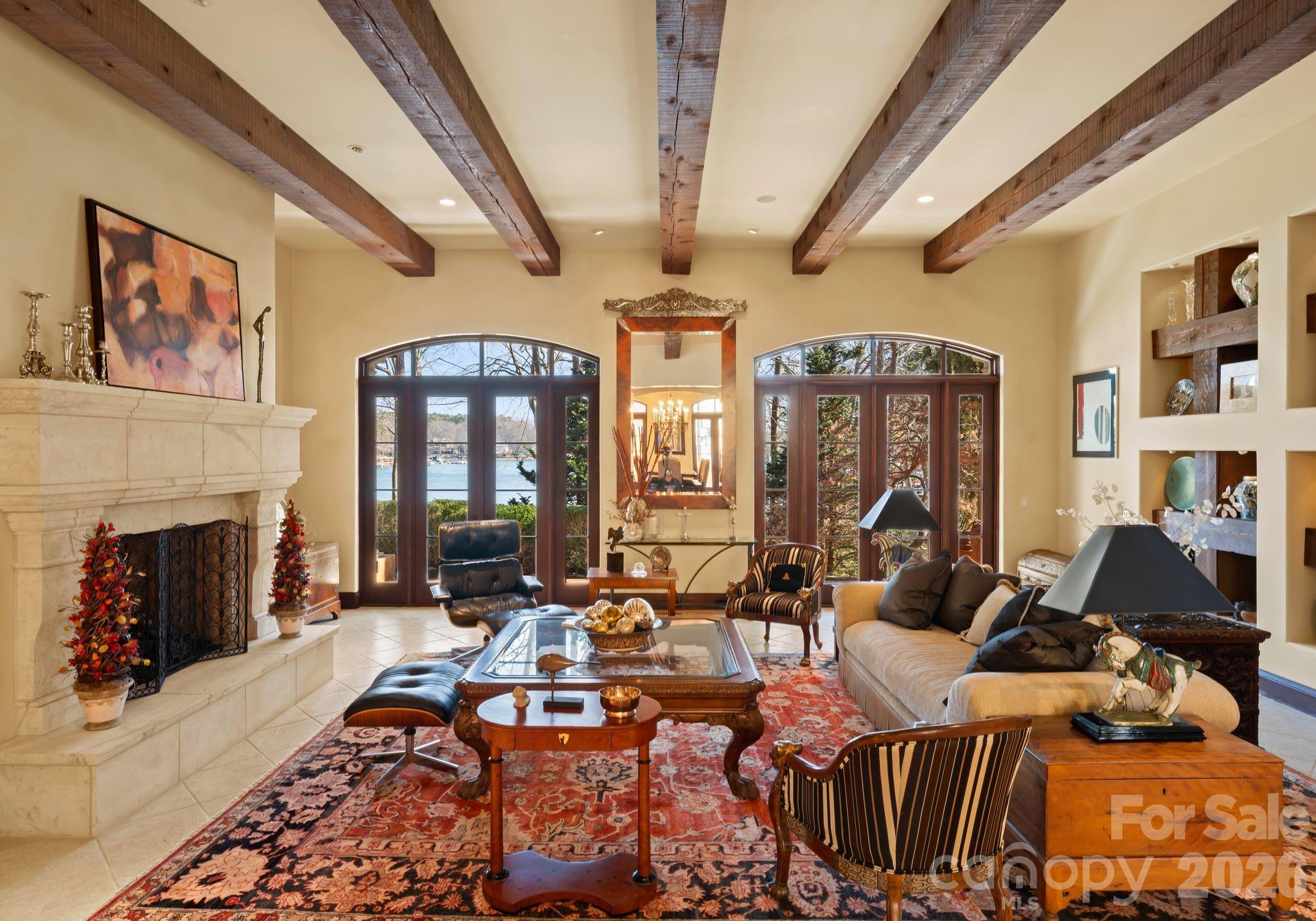 Gracefully positioned along a wide, open stretch of Lake Norman within the prestigious community of The Point, this European-inspired waterfront estate blends timeless architecture with elevated lakefront living. Warm stucco exteriors, arched windows, and rich wood detailing create a striking first impression, while inside, exposed beams, stone fireplaces, and handcrafted cabinetry reflect old-world craftsmanship rarely found today. Expansive windows and French doors frame sweeping water views and seamlessly connect the interior to outdoor terraces. The primary suite is thoughtfully located on the main level, offering a private retreat complete with a spa-style bath featuring dual vanities, soaking tub, and walk-in shower. Upstairs, generously sized secondary bedrooms are complemented by a dedicated office, craft room, and spacious bonus area — providing exceptional flexibility for modern living. The walkout lower level transforms into a lifestyle wing with a fully equipped exercise room, substantial workshop, and abundant storage. Outside, a private dock extends your living experience onto the water, perfectly positioned along a serene yet expansive cove with long-range views ideal for boating, paddle mornings, and sunset cruises. A rare opportunity to own a distinctive waterfront residence in one of Lake Norman’s most sought-after golf and waterfront communities.