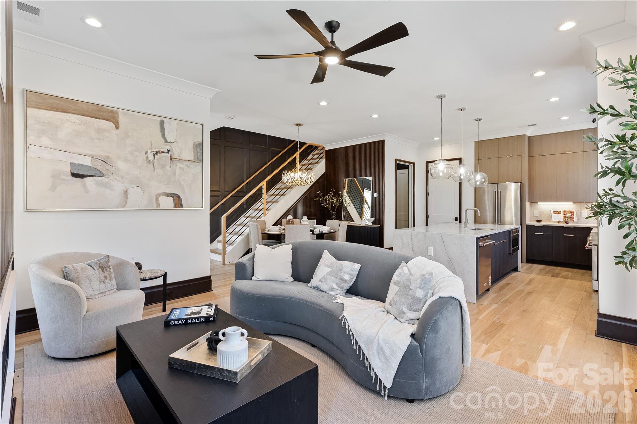 Inside, site-built white oak floors flow throughout the home, setting a warm and sophisticated foundation. Ten-foot ceilings, abundant natural light, and curated finishes elevate every space. The gourmet kitchen is a true centerpiece, showcasing Taj Mahal quartzite countertops, custom cabinetry, and a layout designed for both everyday living and effortless entertaining.