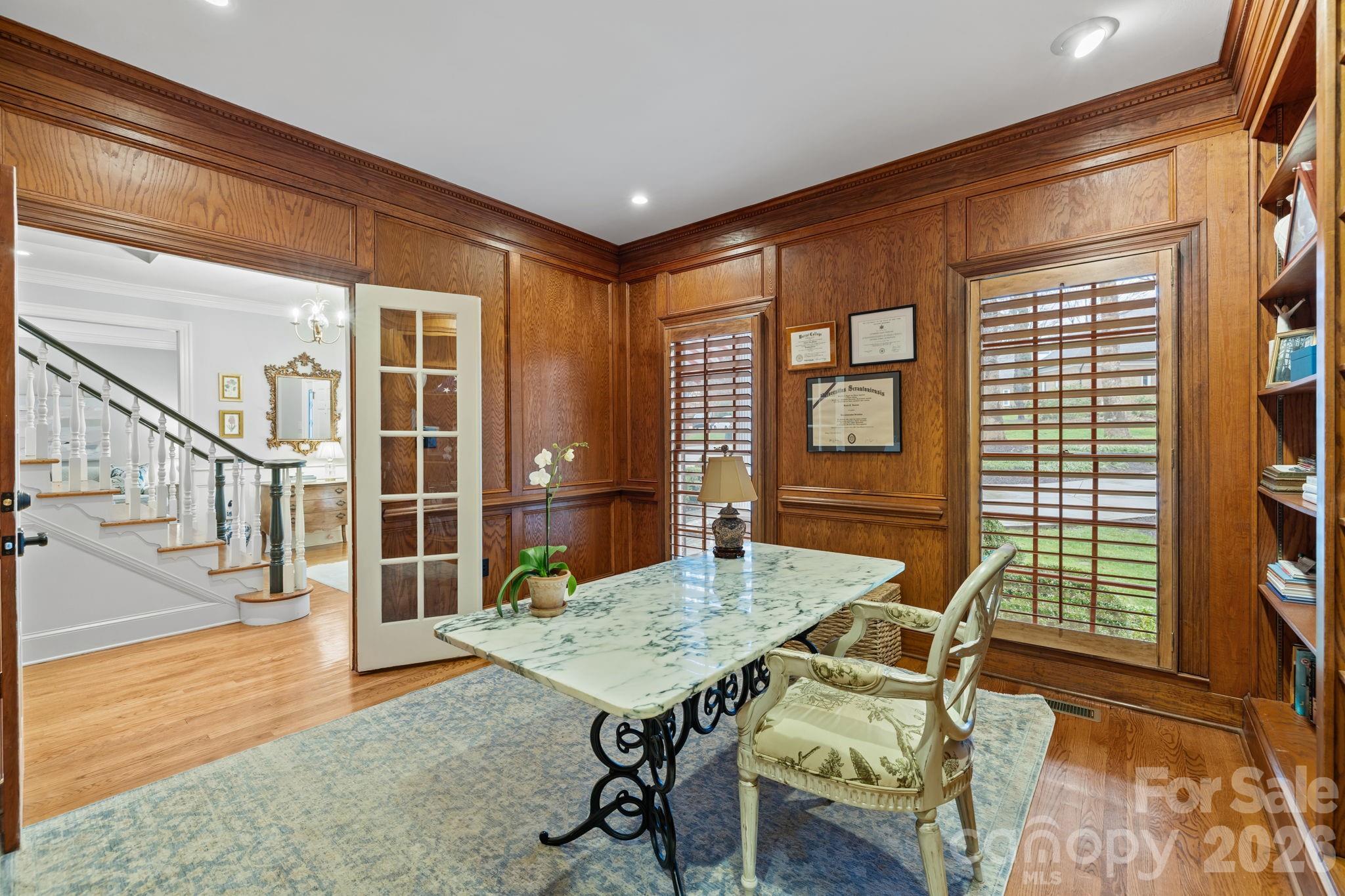 Spectacular property in Quail Hollow on over an acre. This 6 bedroom home is perfectly positioned on a quiet street with an incredible private backyard retreat. Elevate your outdoor living and entertaining with the resort like pool cabana & pool surrounded by gorgeous mature landscaping & lighting. The main level features 9ft ceilings, custom moldings & built-ins and natural light. The traditional floor plan includes formal living & dining rooms, a wood paneled office, a spacious family room with a fireplace with gas logs, a bar with an ice maker & beverage fridge. The gourmet kitchen has ss appliances & an island and is centrally located near the dining room & family room. Other amenities include a side entrance drop zone/mud room, a dedicated laundry room & a sunroom with vaulted ceiling and incredible light. The primary suite on the main level has a fireplace & walk-in closet & a spa bathroom with heated floors and steam shower. The second level includes 4 bedrooms, each with their own half bath & shared tub/showers. Third floor has great flex space and a full bathroom offering a multitude of uses - a gym, a second office or an additional bedroom. The lower level is perfect for entertaining & accesses lower level patio. The outside living includes many options. Enjoy the upper deck off of the family room & kitchen overlooking the backyard or the lower patio off of the basement. The pool & pool cabana are an absolute dream. The huge custom cabana has it all - ceiling heaters, speakers, wood burning fireplace, bar seating and an outside kitchen. The heated saltwater pool and hot tub complete the gorgeous atmosphere. There is also an outside shower & a pool bathroom with a changing area. Attached 2 car garage with an extended parking pad and a circular driveway.
