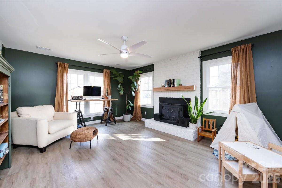 Welcome home to this all-brick Colonial featuring a warm, neutral color palette throughout. This home offers a perfect blend of comfort, style, and functionality. Enjoy cozy evenings in the front entry living room that opens to the dining area. Head back to a spacious and modern kitchen showcasing newer cabinets with quartz countertops, a white subway tile backsplash, and stainless-steel appliances. A center island provides additional prep space with bar seating, plus an adjacent dining area and convenient side entry from the driveway. Extra living space off the kitchen includes a wood- burning fireplace and is currently being used as an office space.