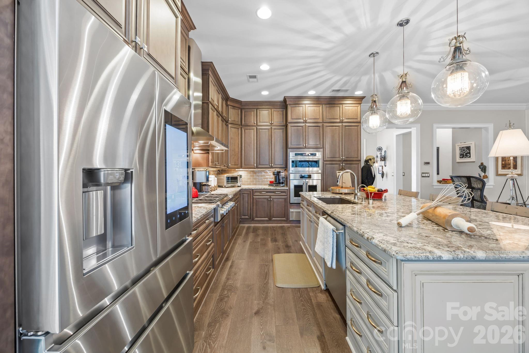 Step into luxury with this Captivate with a loft open floor plan designed for both grand entertaining and comfortable everyday living. From the moment you enter this beautiful foyer, you see a custom library wall designed to showcase your treasured artifacts, while rich hardwood floors flow seamlessly throughout the main living spaces. The chef’s kitchen is a true showpiece, featuring ample storage with self closing pull-drawers, cabinetry extending to the ceiling, gleaming granite countertops, and a French door oven. Entertain effortlessly in the dedicated wine/ beverage & music space, complete with a stunning wine barrel/Sink combo and an enviable 4 bottle wine dispenser and premium Bosch coffee Maker. This thoughtfully designed home offers a spacious primary suite plus three large ensuite bedrooms providing ultimate comfort and privacy for guests. Ascend the statement staircase—adorned with bold leopard print carpet—to experience your very own private cinema. Enjoy a true movie-theater atmosphere with surround sound and an acoustic panel designed for the ultimate viewing experience. Outdoors, discover your own serene retreat. The screened-in porch with a cozy fireplace and tv allows year-round enjoyment. Beyond the porch you will see a beautiful patio adored with a fire pit, water feature and pergulia creating a peaceful, Zen-like ambiance. Artificial turf keeps the yard pristine and low-maintenance for your fur babies, who will love their very own private doggie door. The extended garage offers additional length to accommodate a golf cart, adding convenience to luxury living. This home blends elegance, comfort, and entertainment in every detail—an extraordinary opportunity to live your dream lifestyle on the “Street of Dreams!"
