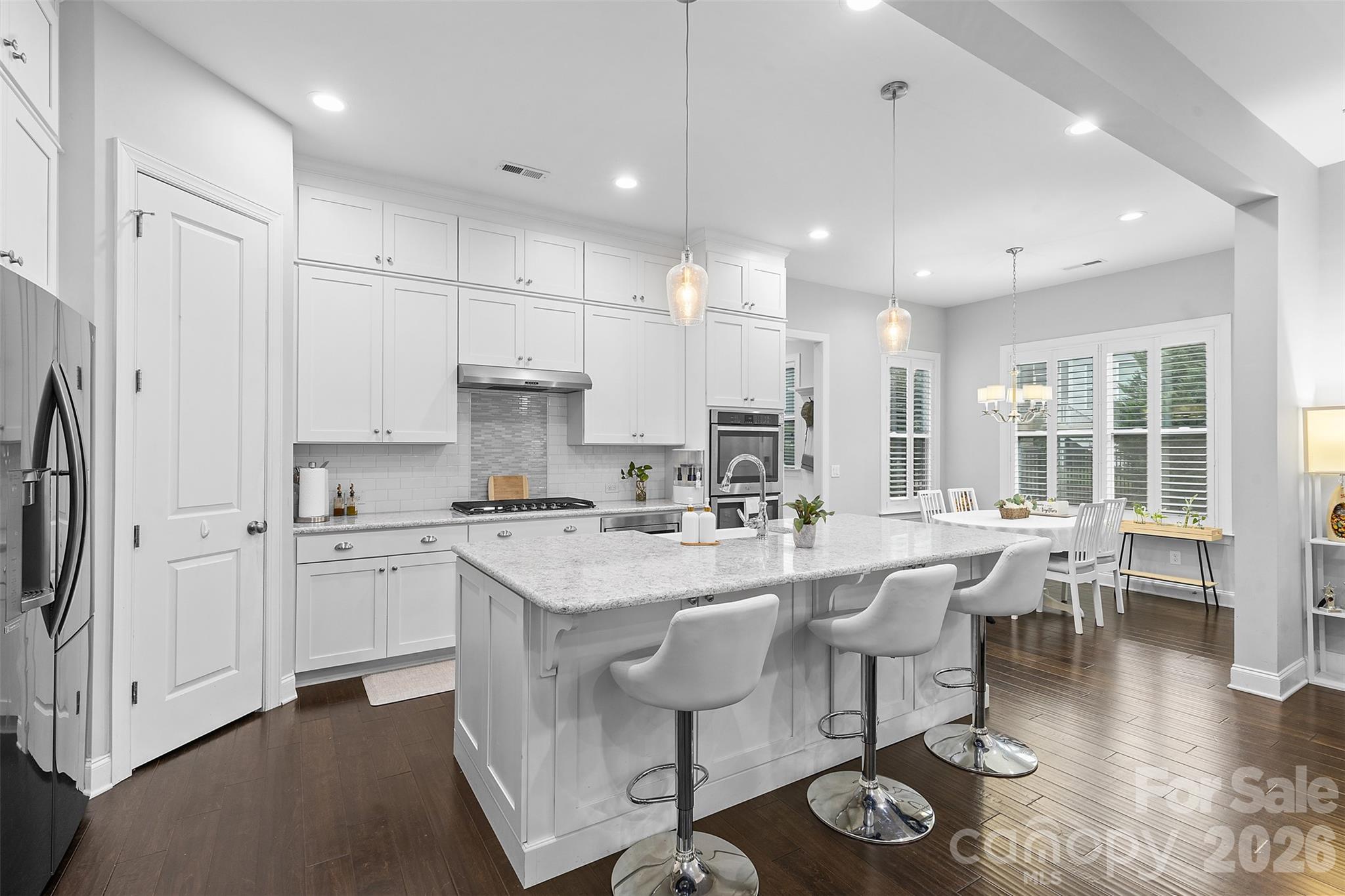 Step inside to a bright, open-concept floor plan filled with natural light, soaring ceilings, elegant built-ins, and a cozy gas fireplace that anchors the living space beautifully. The kitchen is truly the heart of the home — featuring a large center island, abundant cabinetry, and seamless flow into both dining and breakfast areas. Whether you’re hosting holidays or casual get-togethers, this layout was designed for connection. Designer lighting and smart switches add modern convenience and elevated style throughout.