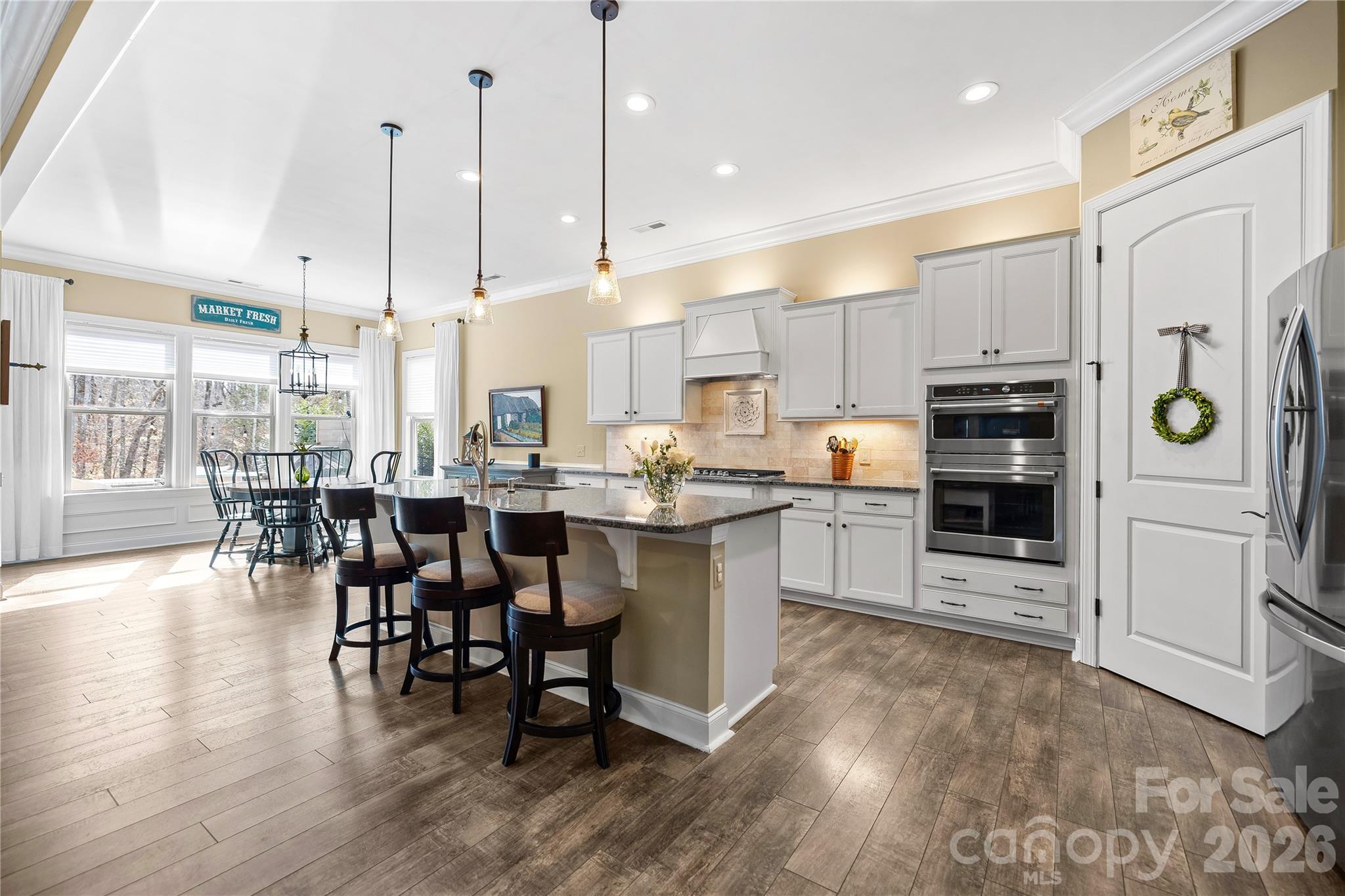 The kitchen is well-appointed with an oversized granite bar-stool island perfect for gatherings, stylish tile backsplash, gas cooktop with vented hood, walk-in pantry, and abundant cabinet storage. It flows seamlessly into the dining and living spaces, making everyday living effortless. The spacious primary suite serves as a private retreat, highlighted by a custom-designed walk-in closet with high-end built-ins for optimal organization. Just off the primary bedroom is a versatile flex space ideal for a home office, nursery, sitting area, fitness room, or easily converted into a third bedroom if desired. FLEX ROOM BY PRIMARY BEDROOM CAN EASILY BE CONVERTED INTO A 3RD BEDROOM & SPEC DRAWING AVAILABLE.