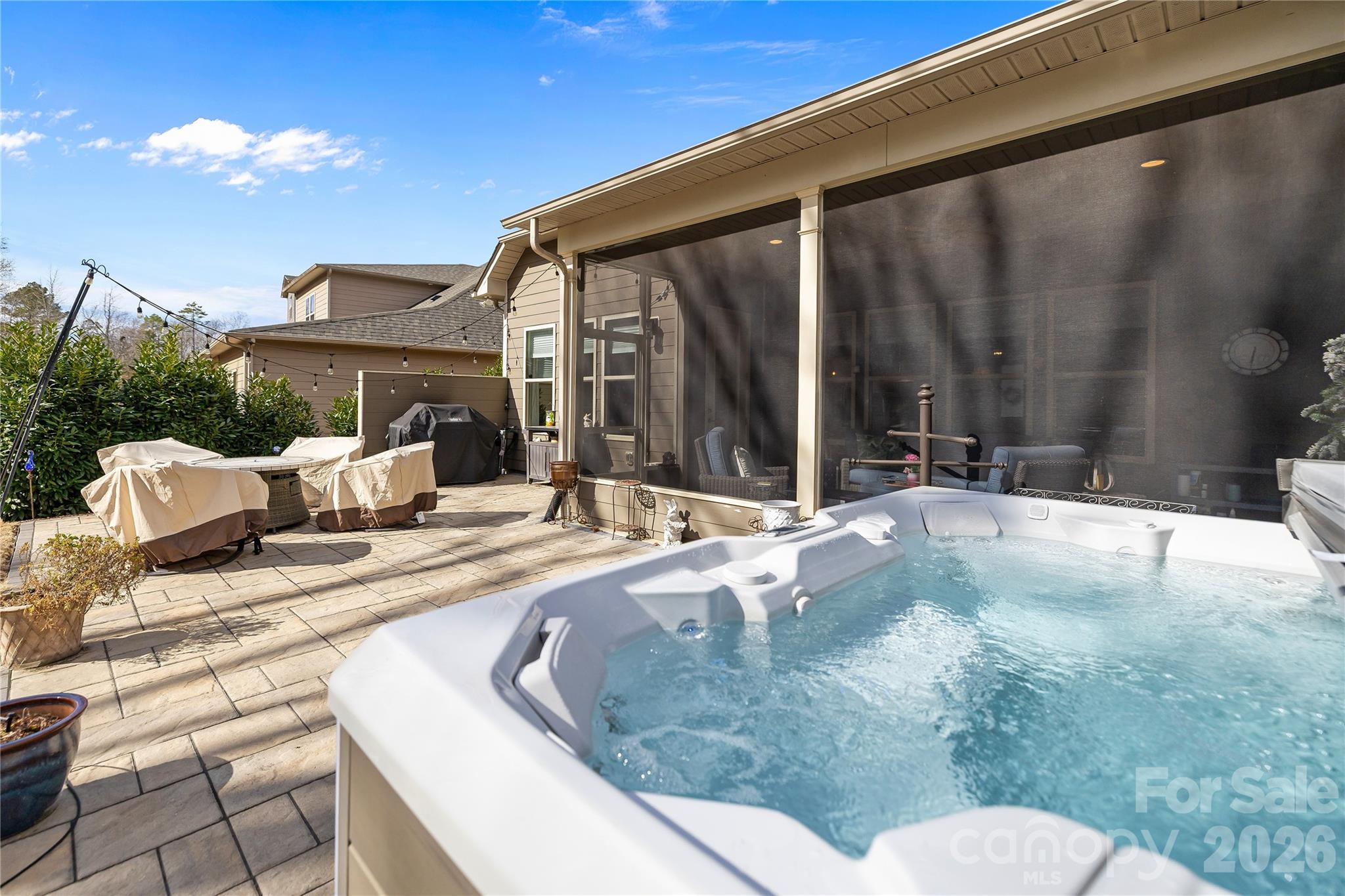 Bedroom 2 offers exceptional privacy and convenience with its own connecting full bath, making it ideal for guests. Additional functionality continues in the well-designed laundry room featuring a drop zone, utility sink, and cabinet storage — perfect for staying organized. Outdoor living is where this home truly shines. Step onto the screened porch, ideal for year-round enjoyment, which leads to a beautifully crafted paver patio complete with a hot tub feature — perfect for relaxing evenings or entertaining guests. The fully fenced backyard provides privacy and a secure space for pets or play. The garage is equipped with overhead storage racks for added organization and includes two 50-gallon electric water heaters, offering peace of mind and efficiency.