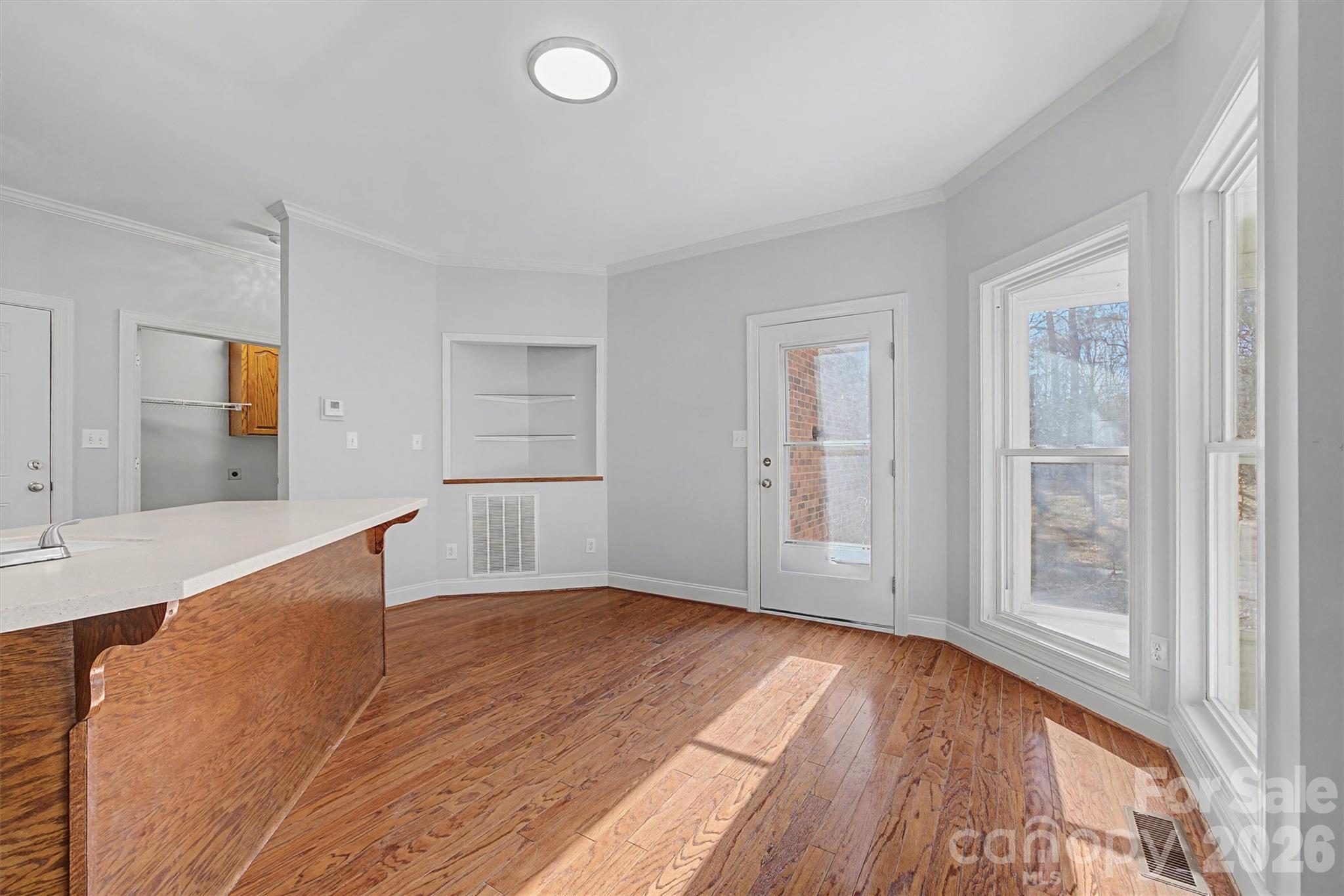 Welcome home to space, classics, and comfort on 1.3 beautiful acres. This 3 bedroom, 2.5 bath split floor plan home offers 2,364 sq ft designed for both everyday living and effortless entertaining. Step through the doors to the grand foyer leading to the formal dining room and a flex room perfect for a home office, play room, or creative space. Flowing seamlessly into the inviting living room with cozy fire place, you have open access to the breakfast nook and kitchen complete with a new stove and range hood, making it effortless to entertain. Overlooking your expansive back yard in the sun porch and savor quiet mornings or relaxed evenings. The spacious primary suite features a walk-in closet and private en suite, while large secondary bedrooms include walk-in closets and a convenient Jack and Jill bath. Fresh paint, lighting and new flooring throughout create a bright feel, while keeping some of the original hardwoods keeps the timeless charm. With generous front and back yards, and minutes from I-77, you're convenient to everything while still having the quietness and room to garden, gather, and truly live.