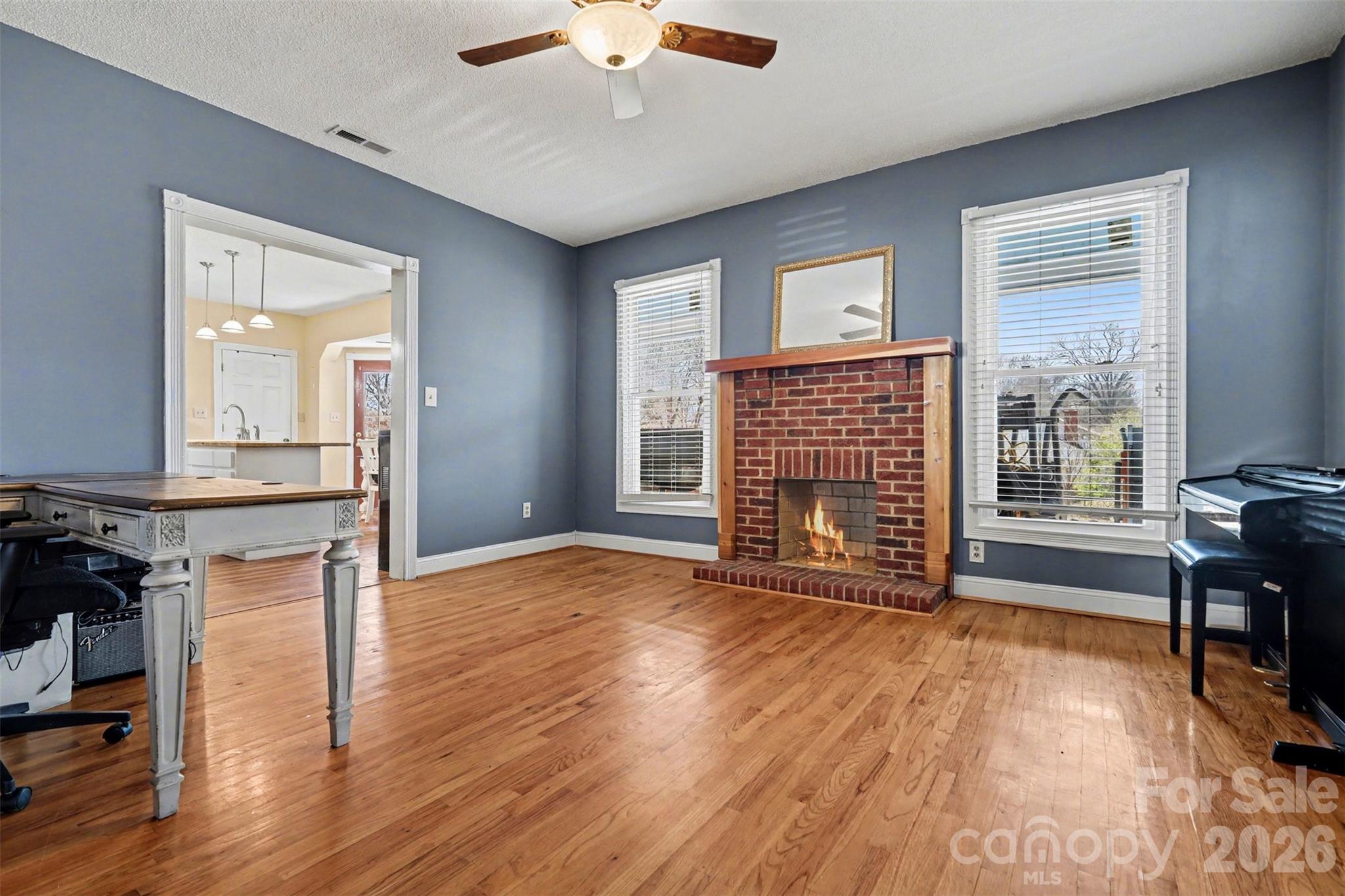 A welcoming front porch sets the tone, inviting you to slow down and enjoy quiet mornings or evening conversations. Inside, you’ll find tall ceilings, rich wood flooring, and generously sized rooms filled with natural light. The family room features a fireplace framed by classic detailing, creating a cozy focal point while maintaining the home’s historic appeal.