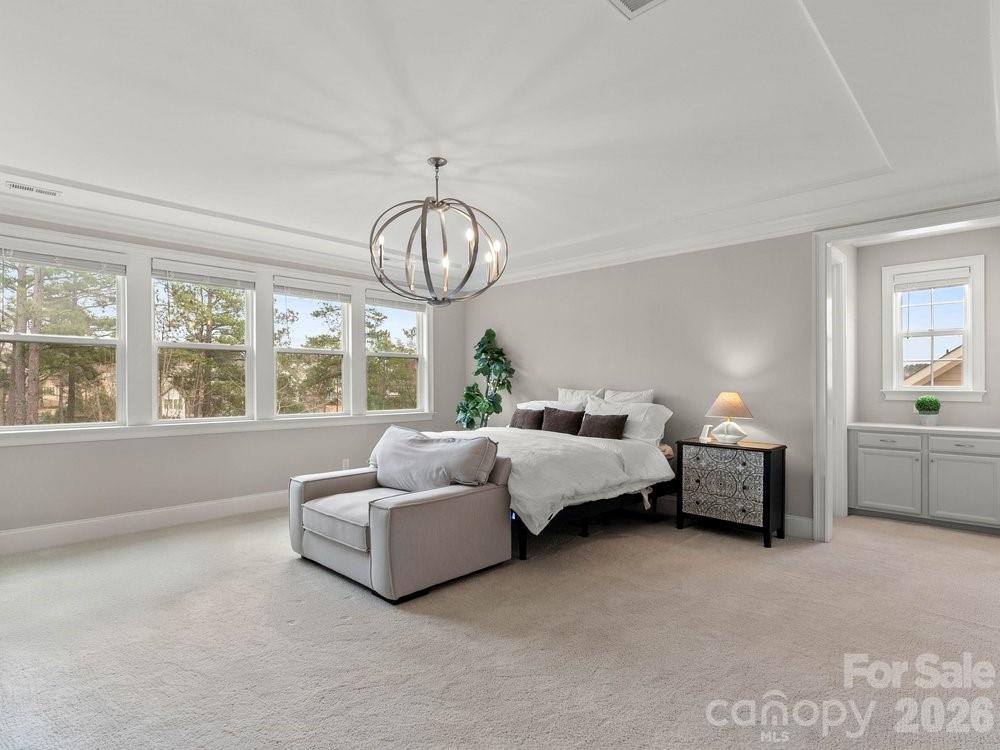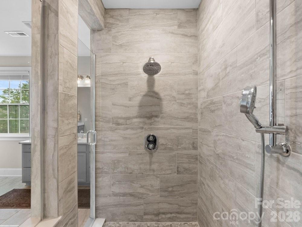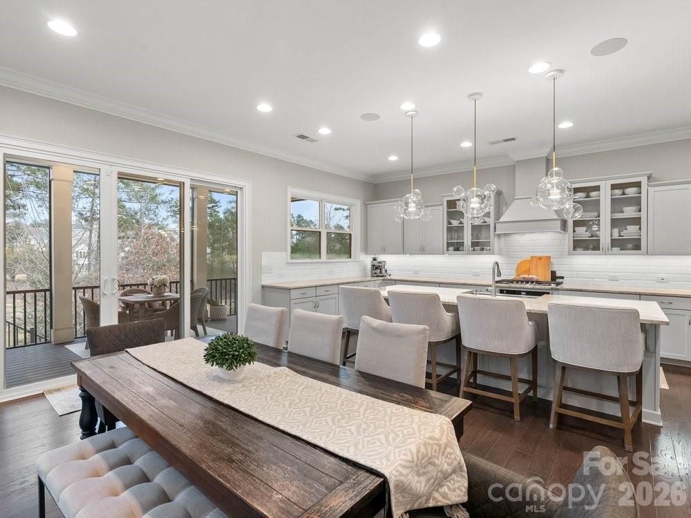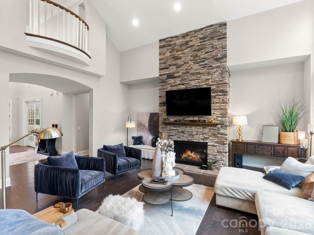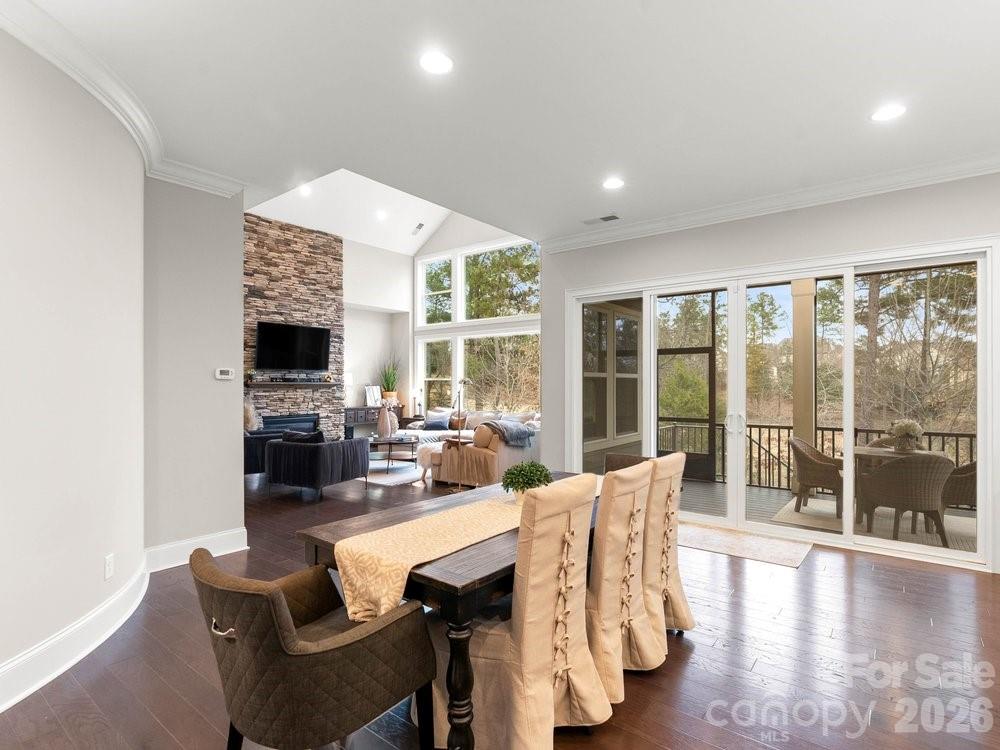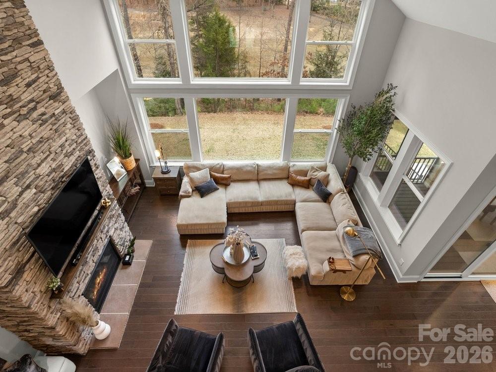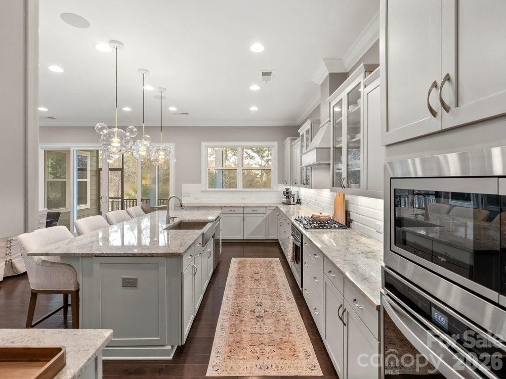 The vaulted great room is filled with natural light from floor to ceiling windows and anchored by a striking stone fireplace. Just beyond, the chef’s kitchen is truly the heart of the home with a wooden hood vent, gas cooktop, quartz countertops, cabinet under lighting, and an oversized island perfect for gathering. A butler’s pantry with glass cabinetry and custom backsplash connects the kitchen to the formal dining room, creating a seamless space for entertaining. Step outside to the expansive screened porch with Trex decking, overlooking a private backyard complete with a paver patio and built in outdoor grill.