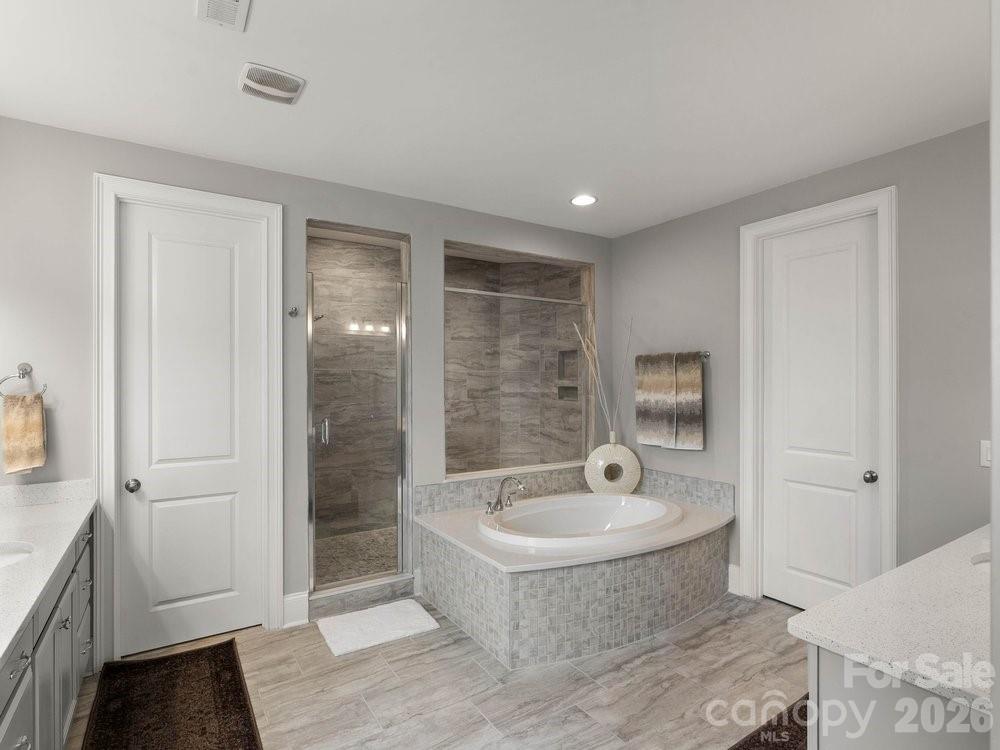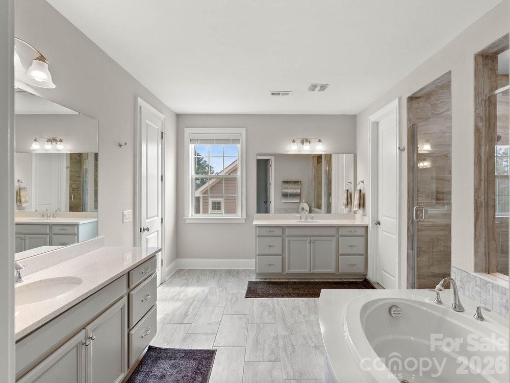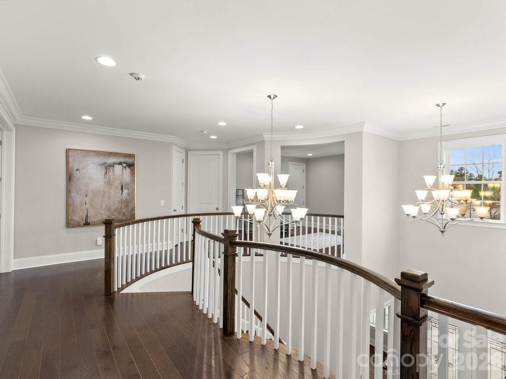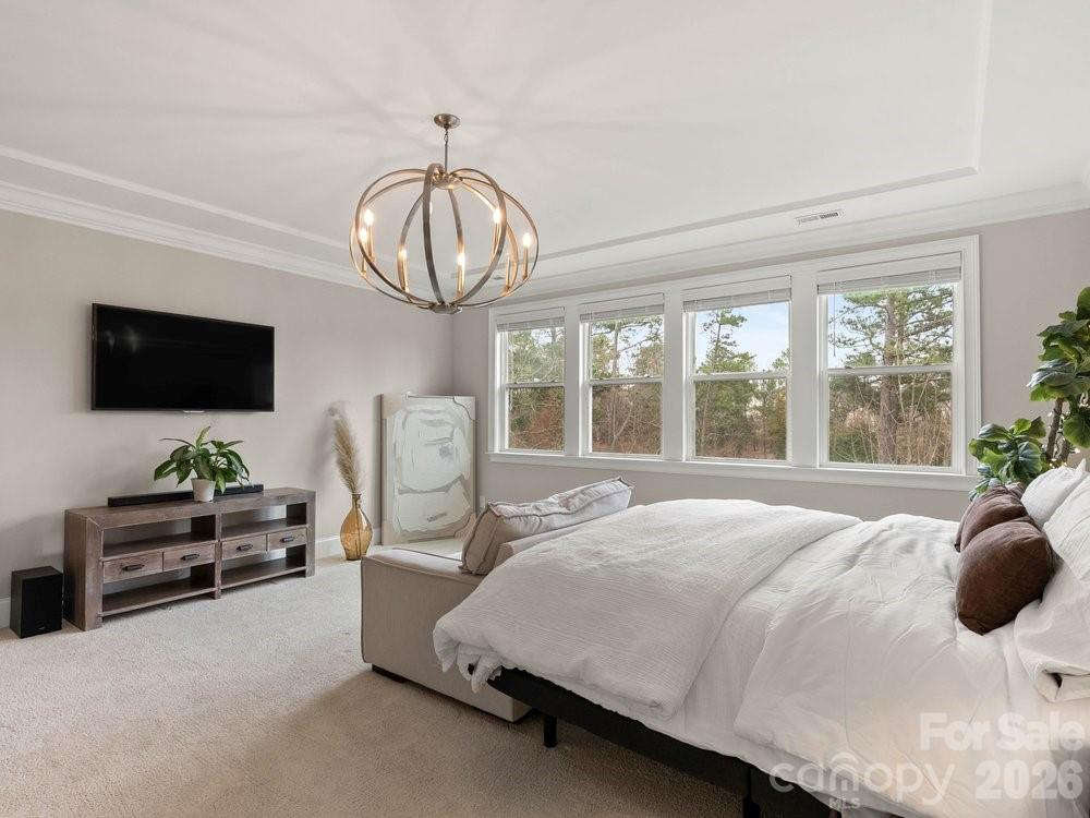 The main level also includes a dedicated office with French doors, coffered ceilings, and a closet, along with a guest suite featuring a full bath. Upstairs, the spacious primary retreat showcases dual walk in closets, a custom light fixture, and a spa inspired bath with a large tiled walk in shower, soaking tub, and dual vanities. Four of the six bedrooms include en suite baths, offering comfort and privacy for family and guests alike. A huge bonus room provides flexible space for a media room, recreation room, additional bedroom, or secondary living area.