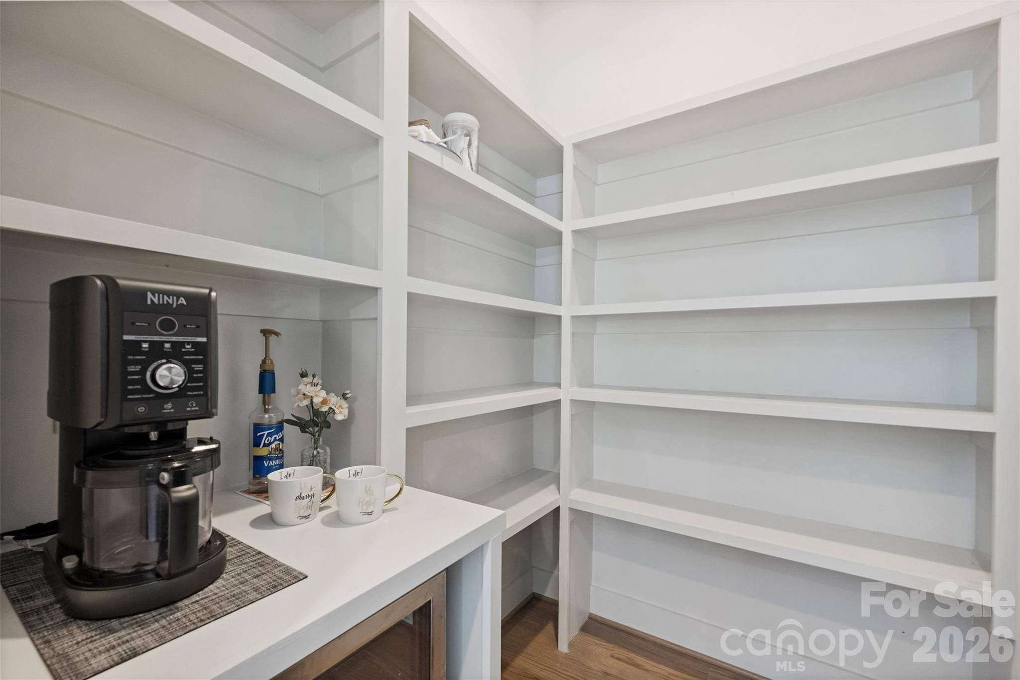 The kitchen is designed to impress with ample cabinetry, generous workspace, and a large island with bar seating that anchors the space. It flows seamlessly into the main living and dining areas, making everyday living and entertaining effortless. A walk-in pantry adds both storage and style, complete with a dedicated nook for a coffee bar and beverage or wine fridge.