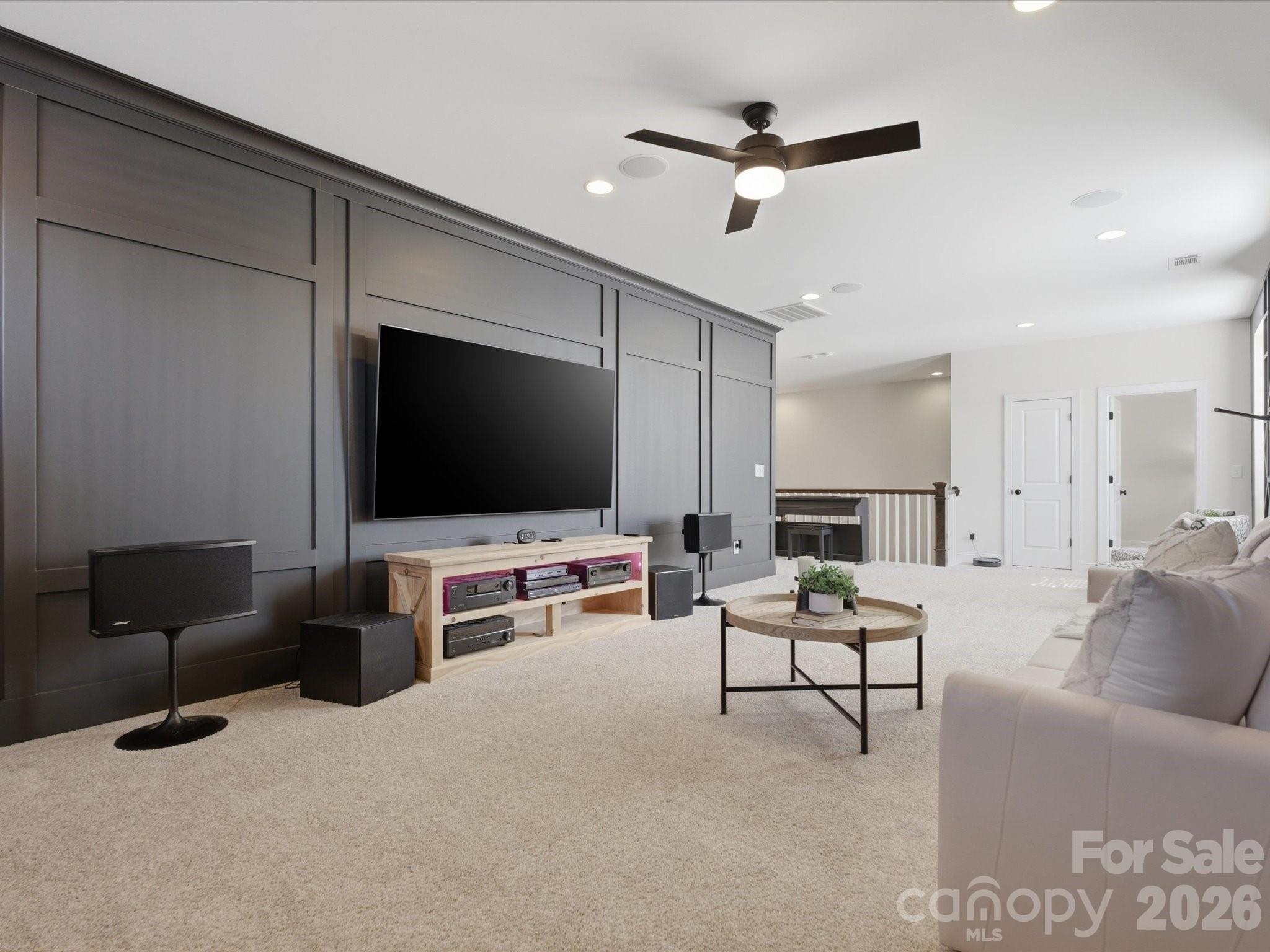 Upstairs, the spacious primary suite includes hardwood floors and custom closets. Two additional bedrooms and a large loft provide flexible living space, with the loft featuring custom cabinetry, a refrigerator, and surround sound—perfect for a media or recreation area.