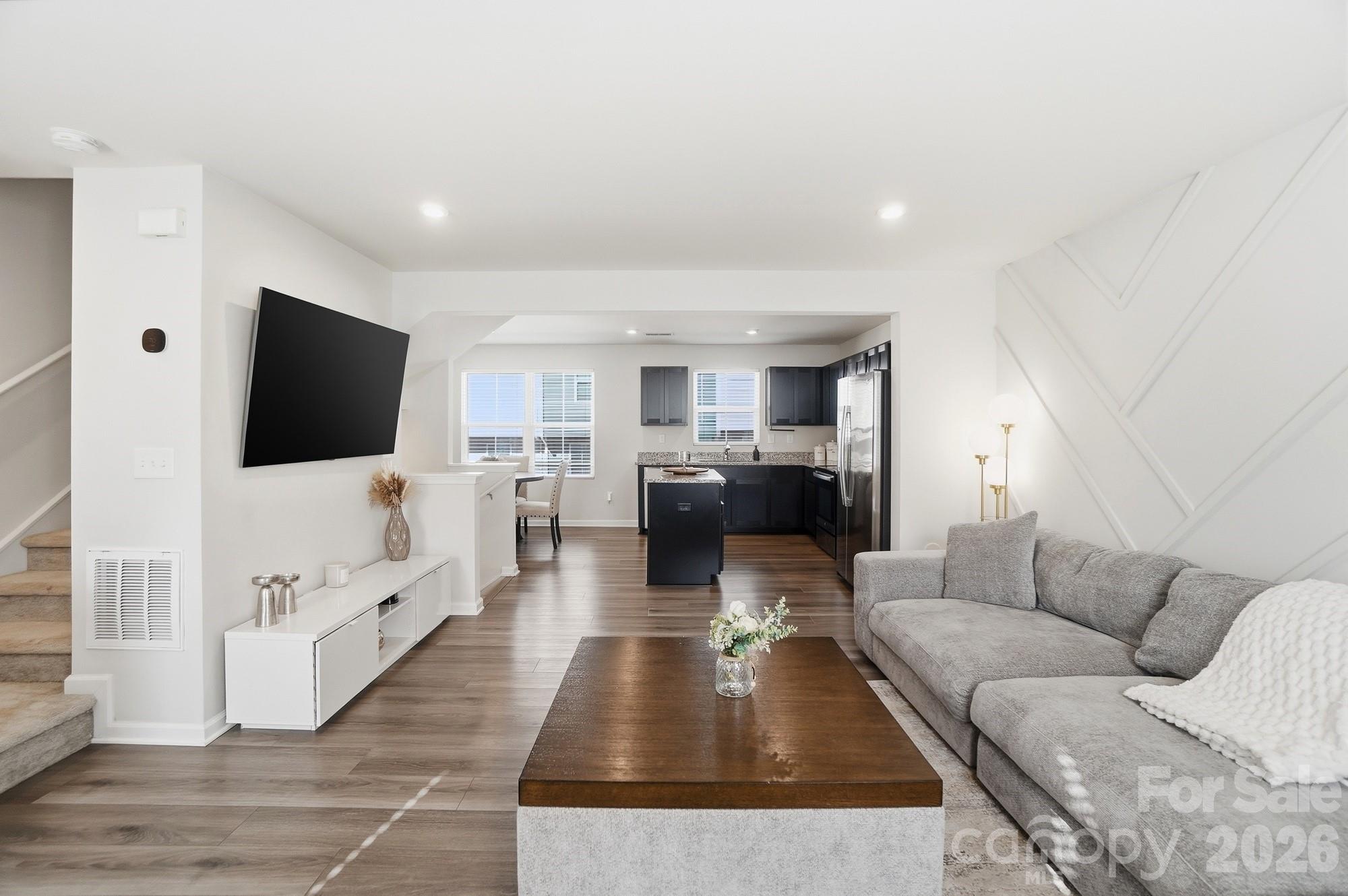 The heart of the home is a beautifully appointed open-concept main level featuring upgraded LVP flooring throughout both the main and lower levels. The kitchen shines with quartz countertops, a large island, and a dining area that flows seamlessly into the living room w/ geometric feature wall — an ideal setup for entertaining or everyday living.