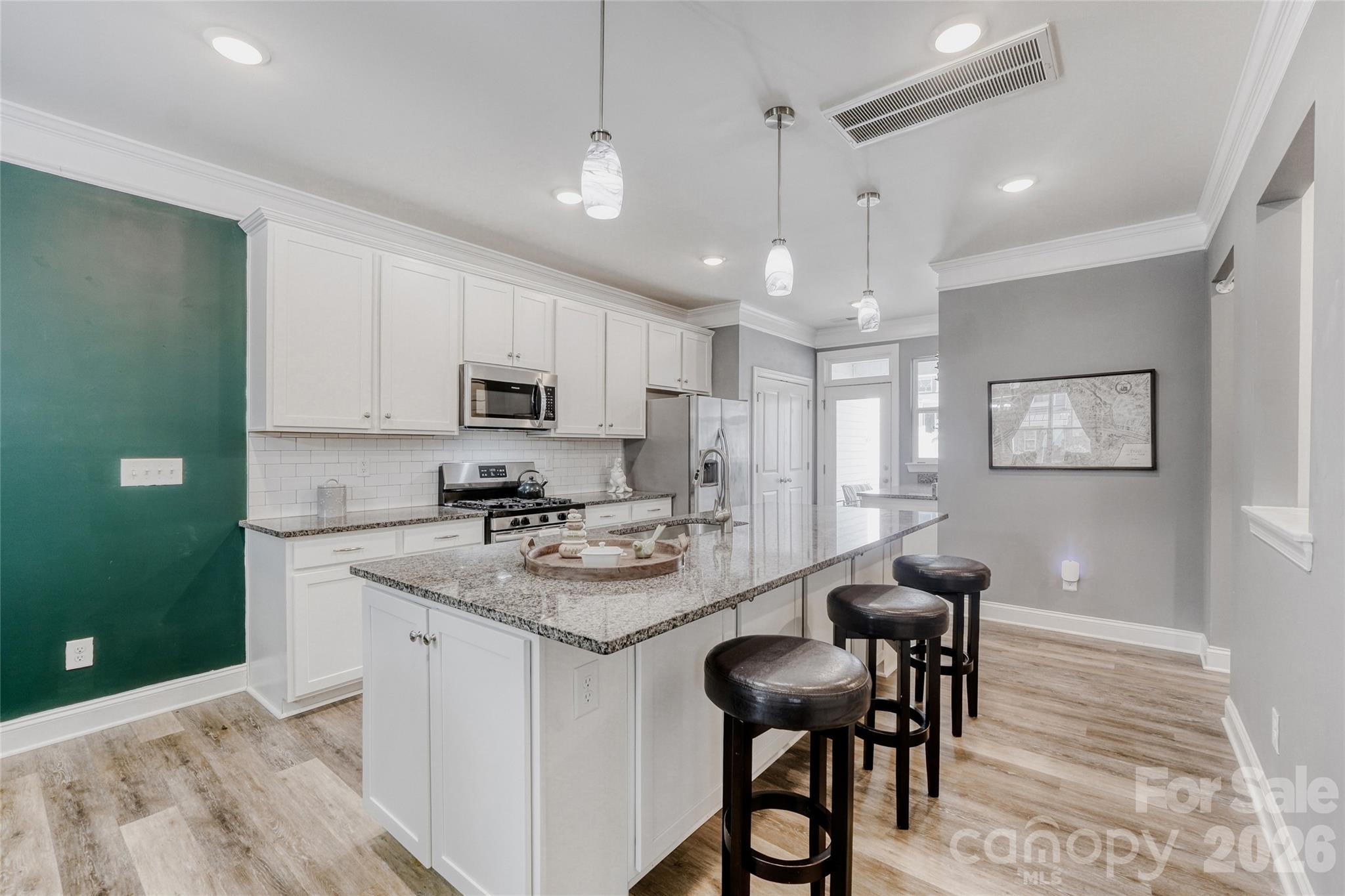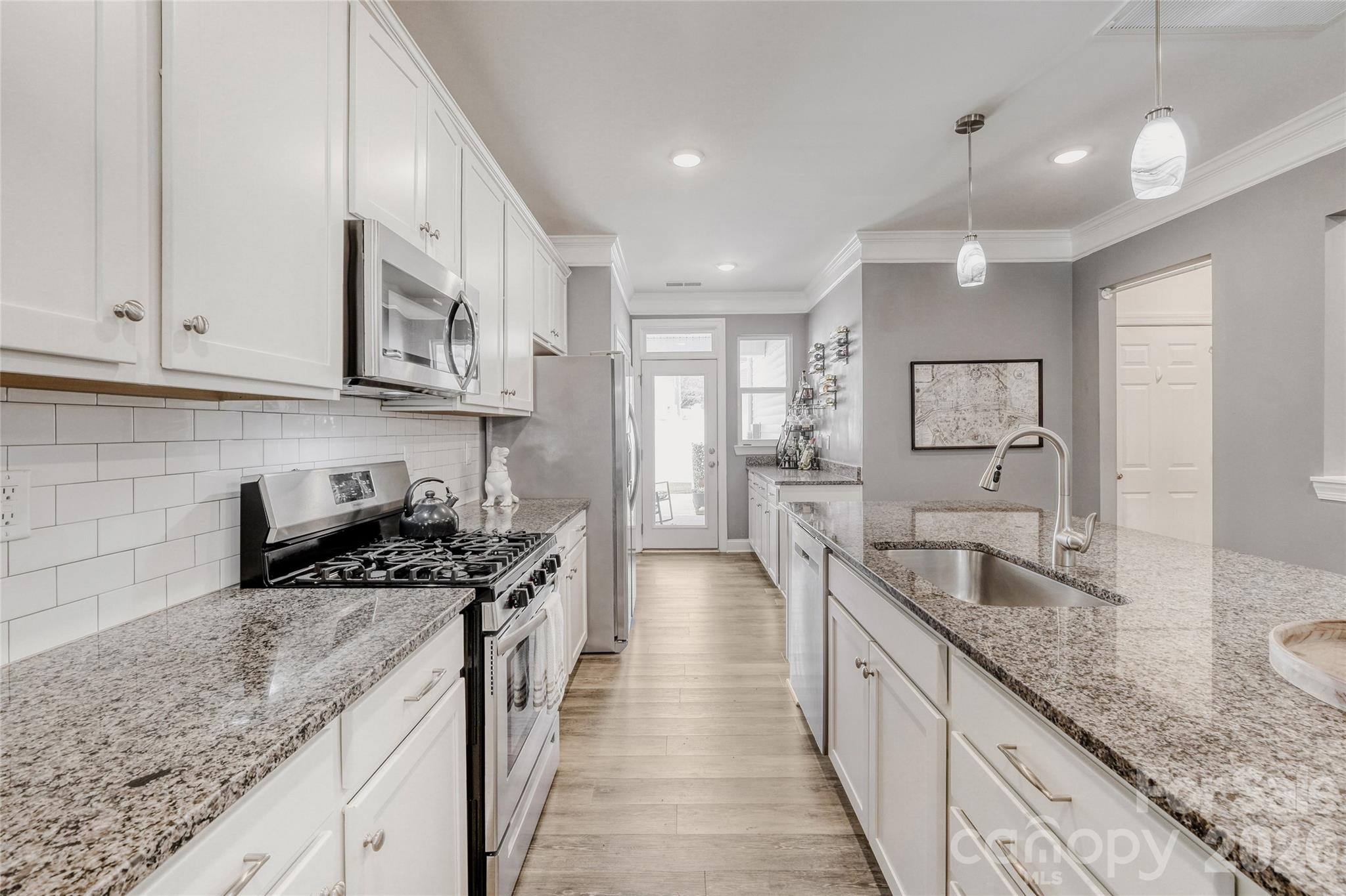 Beautiful 3-bedroom, 2.5-bath end-unit townhome in Mooresville just minutes from Lake Norman! Offering the perfect blend of comfort and convenience, this home features wide-plank LVP flooring throughout, stylish accent walls, and elegant crown molding that adds warmth and character. The kitchen is designed for both everyday living and entertaining, complete with granite countertops, an oversized island, abundant cabinetry, a gas range, and a custom beverage station — perfect for hosting or your morning coffee routine. A dedicated mini office nook makes working from home easy and efficient. Upstairs, the spacious primary suite includes a large walk-in closet with custom organizers and a dual-vanity bath. Two additional bedrooms provide generous space for guests, family, or flexible use. Enjoy relaxing or grilling on the private, fenced patio featuring low-maintenance turf — ideal for easy outdoor living. Located just 1 mile to I-77 and the hospital, 4 miles to Downtown Mooresville, and 5 miles to Downtown Davidson. Stylish, low-maintenance living in an unbeatable location — don’t miss this one!