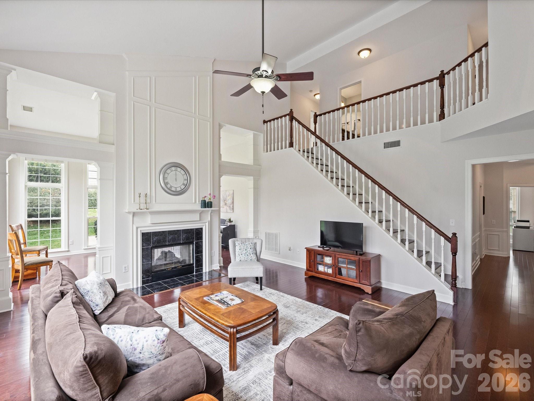 Inside you are greeted by a stunning two-story foyer filled with natural light at every turn. Wood flooring spans the majority of the main level, which includes formal living and dining rooms, as well as a private home office with French doors. The spacious kitchen with breakfast area flows seamlessly into the dramatic two-story great room with a gas fireplace, beautifully shared with the expansive sunroom lined with windows.