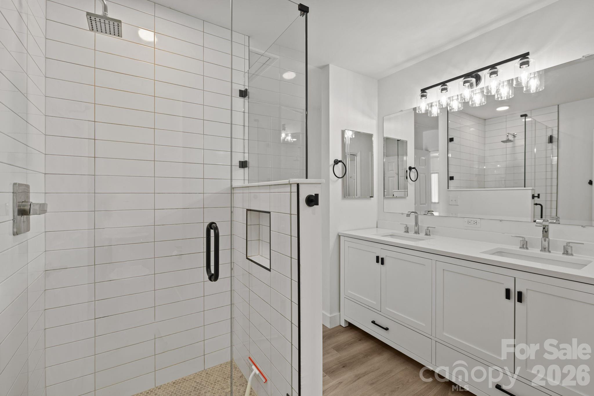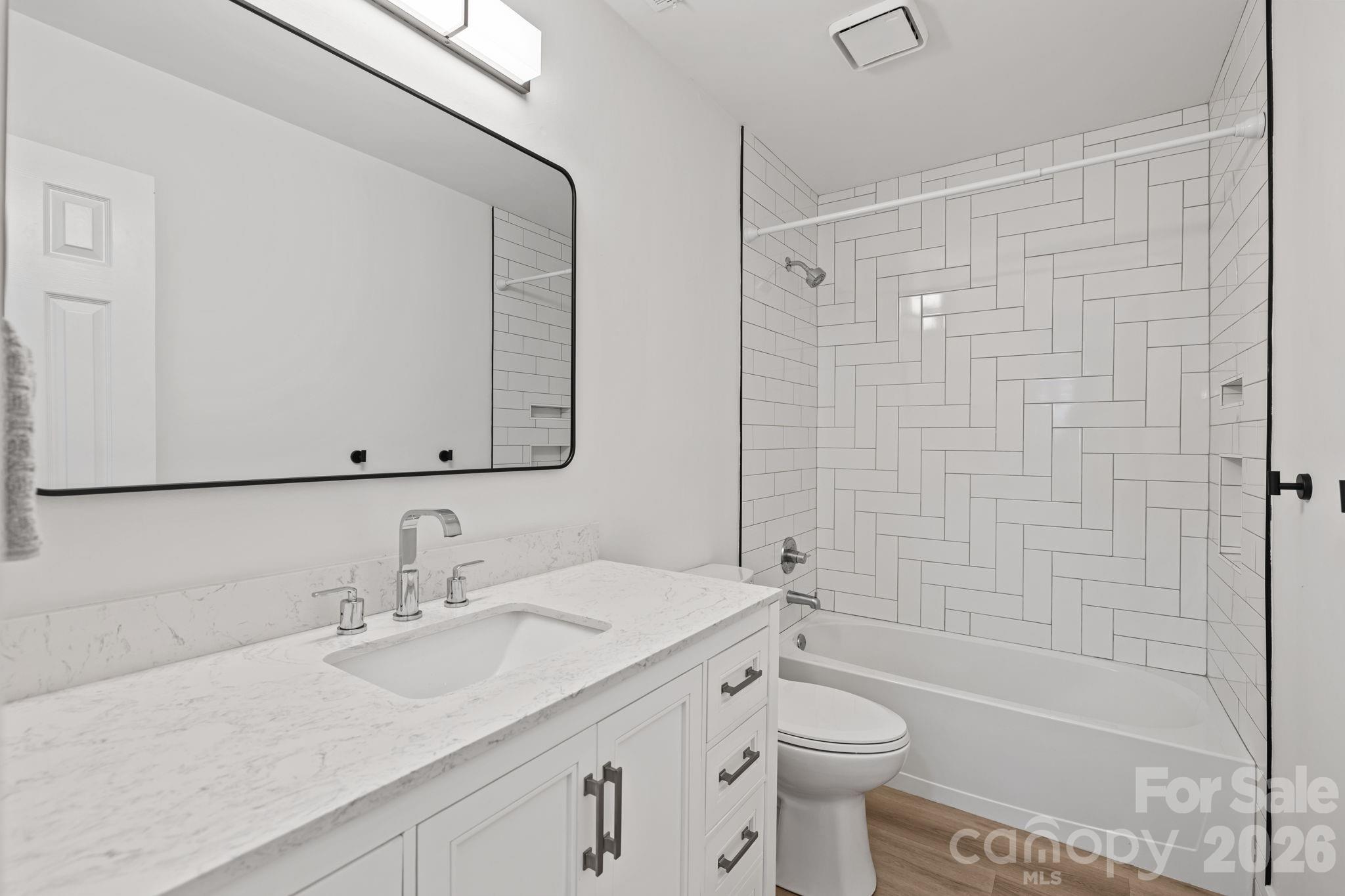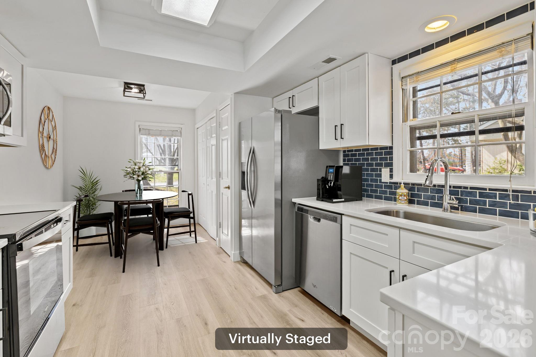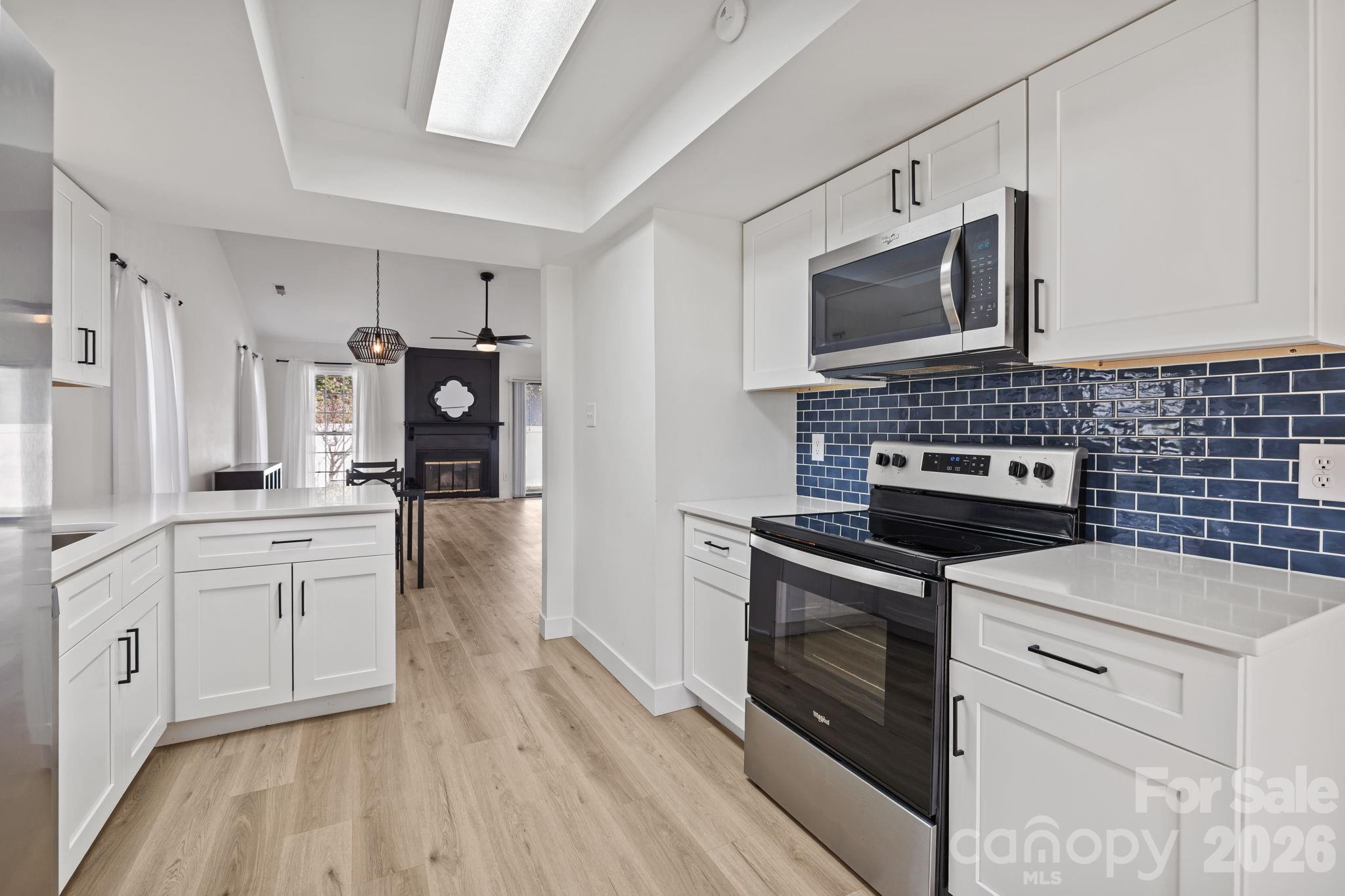 The home features brand-new quartz countertops, elegant white shaker cabinets, and luxurious wide-plank vinyl flooring throughout. Recent updates include a new hot water heater, toilets, light fixtures, sinks, glass shower door, and a newly fenced back patio—perfect for relaxing or entertaining.