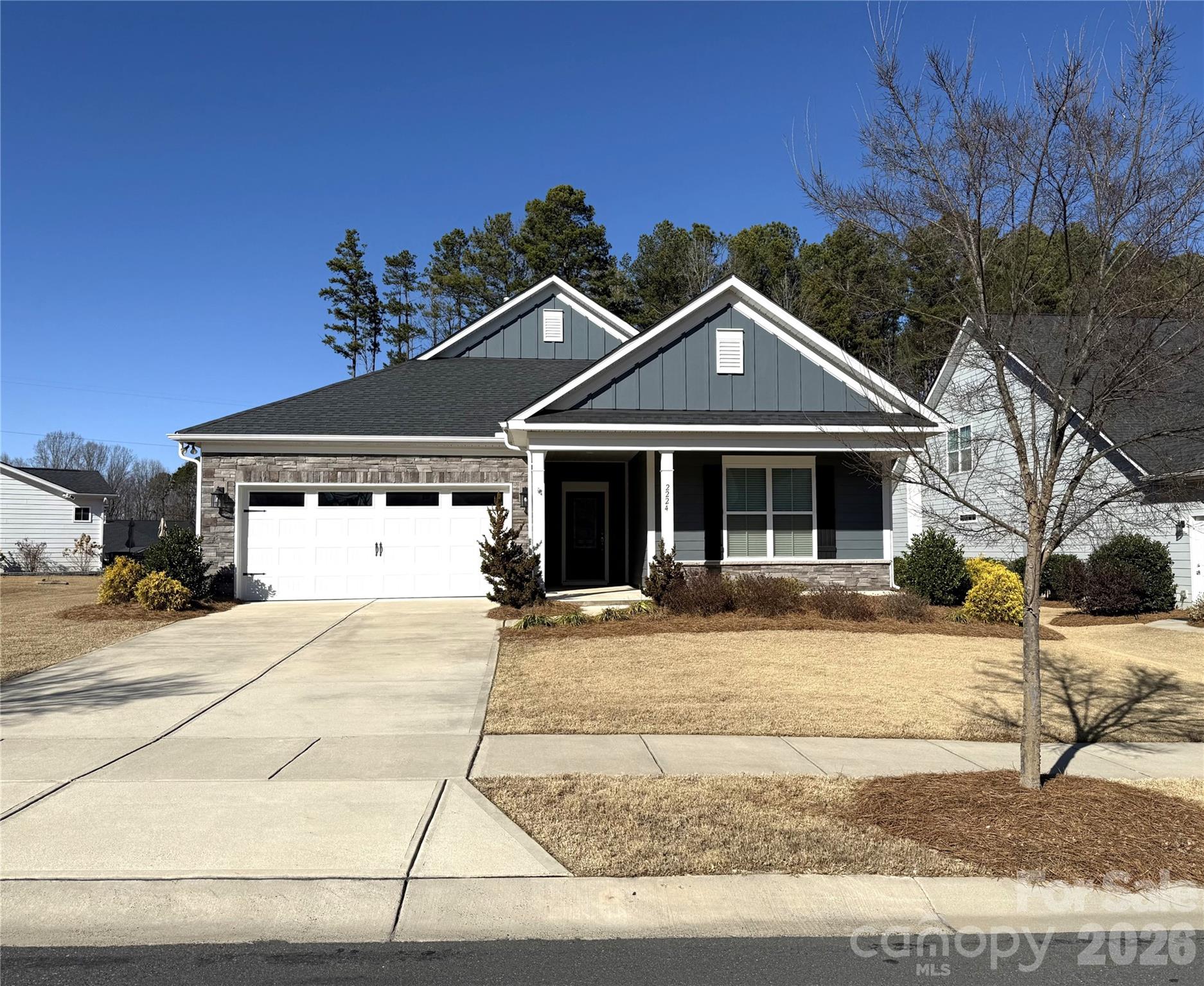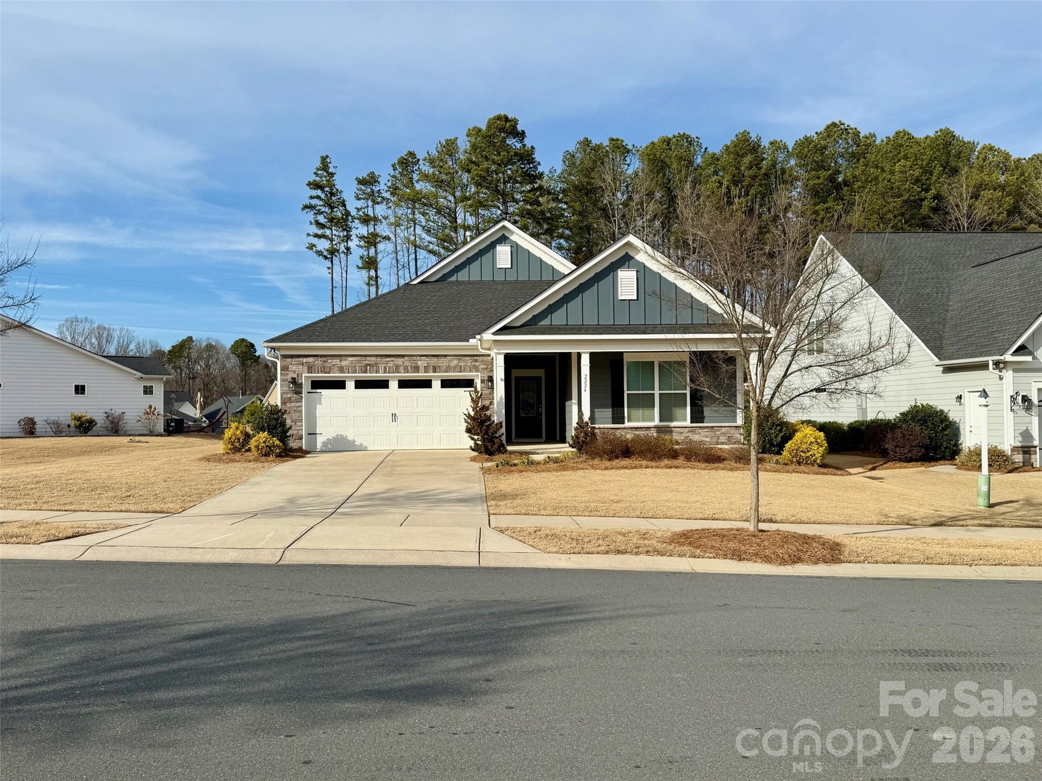 GRAB THIS ONE BEFORE SOMEONE ELSE DOES! Opportunity awaits to be the new owner of this lovely "like new" ranch style home located in a PRIME LOCATION within the desirable Heritage South 55+ Active Adult community in Indian Trail, NC. MOVE-IN-READY and waiting for you! Built in 2020, the home is situated on a 0.22 acre prime lot backing up to the community common area filled with trees and shrubs along the rear property line. Home features 1783 sq. ft. with two delightful covered porches enhancing both front and back. Open floor plan with 2 bedrooms, 2 full baths, flex room with french doors, (for a home office, dining, TV or guest room) and upgraded neutral features including no carpeting throughout the house. Plenty of natural light, higher ceilings in the living area, breakfast area, large kitchen island with granite and upgraded white cabinets. Primary suite w/tray ceiling, large shower, dual vanity & generous size closet. This popular community offers carefree living, ranch style homes with 2 car garages and lawn maintenance included! Residents enjoy a 7,000 sq. ft. Amenity Center with Grand Hall, Kitchen, Pool, Outdoor entertaining, Fitness Center, Craft Room & Pickleball courts along with Clubs & Social Events. For those buyers who enjoy the outdoors, Heritage South was designed with plenty of sidewalks and a new walking trail to enjoy the Carolina blue skies as you stroll the neighborhood. Conveniently located close to shopping, restaurants, medical facilities, entertainment, financial institutions & the Atrium Health West Hospital which is located less than 5 miles away just off of Hwy 74 in Matthews. Take advantage of the value this home and community has to offer. SIMPLIFY AND ENJOY LIFE IN HERITAGE SOUTH! You will not be disappointed.