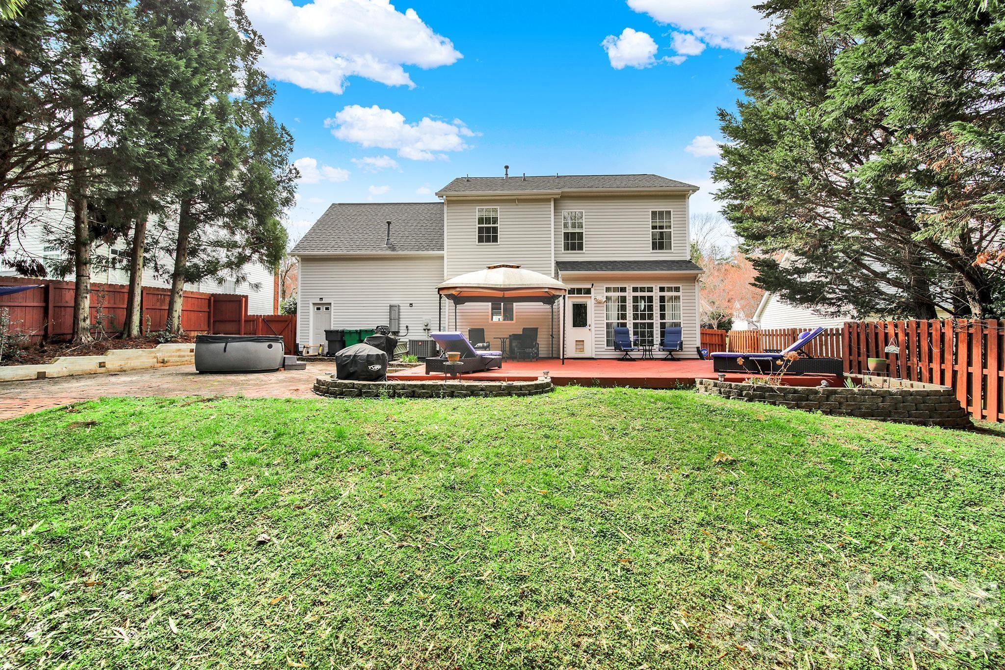 Welcome Home to the highly desirable Wiltshire Manor community, nestled in the Steele Creek area of Charlotte. This home, located near the cul de sac, has a beautiful private back yard with deck, patio, hot tub and spacious shed with storage.This spacious home offers an ideal blend of style and functionality. The main level features dining room, cozy den with gas fireplace, living room area that can be used as office space & a bright spacious kitchen with granite countertops & stainless steel appliances. Upstairs you will find 3 bedrooms and a versatile bonus room with built in shelving- perfect for media space, home office or bedroom. Beautiful flooring throughout the home for added warmth and character. The spacious primary bedroom features high ceilings, a beautiful ensuite bath featuring a rainfall shower and dual vanities, plus oversized closet. Conveniently located near Rivergate Shopping center with restaurants, quick drive to McDowell Park and the Premium Outlets.