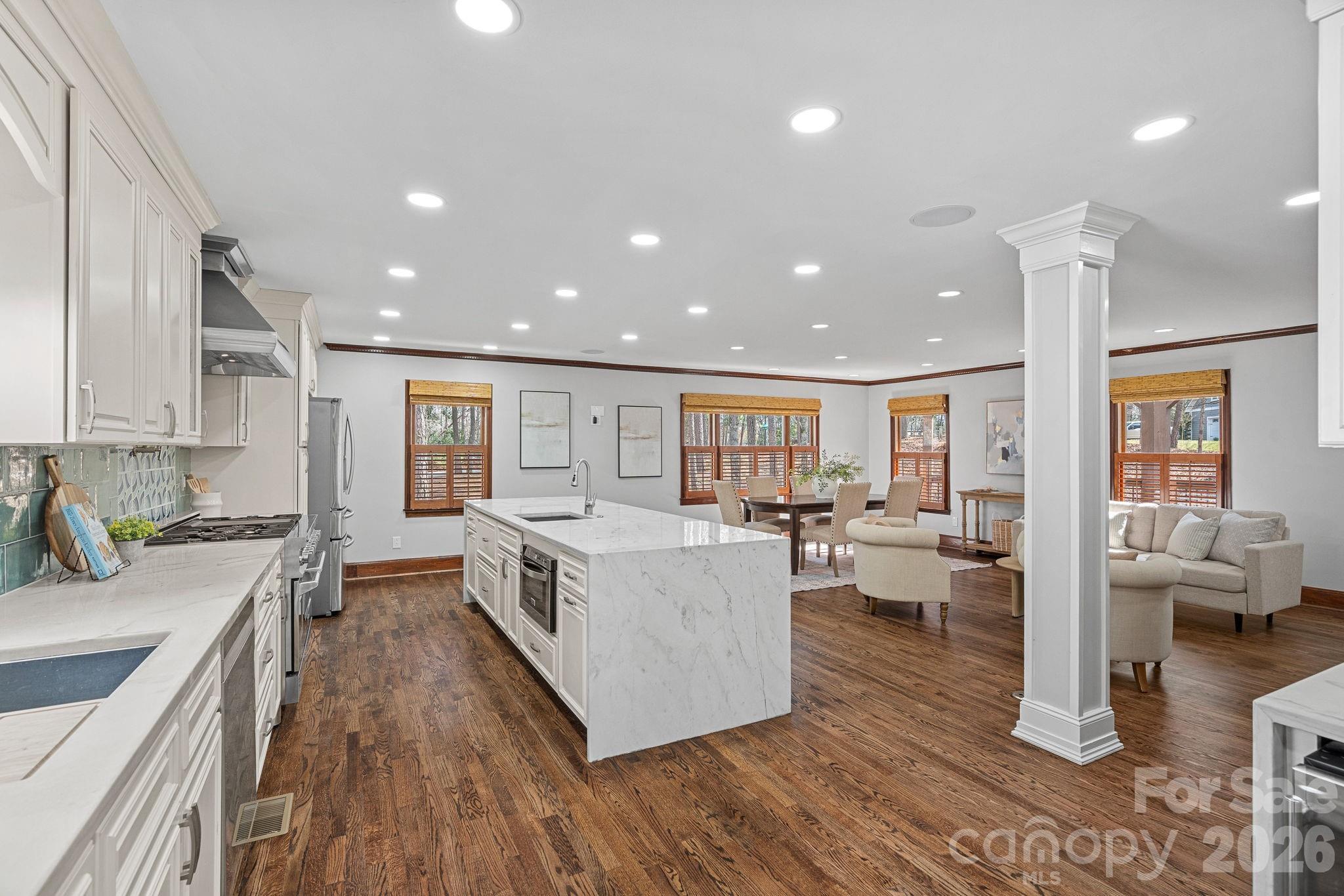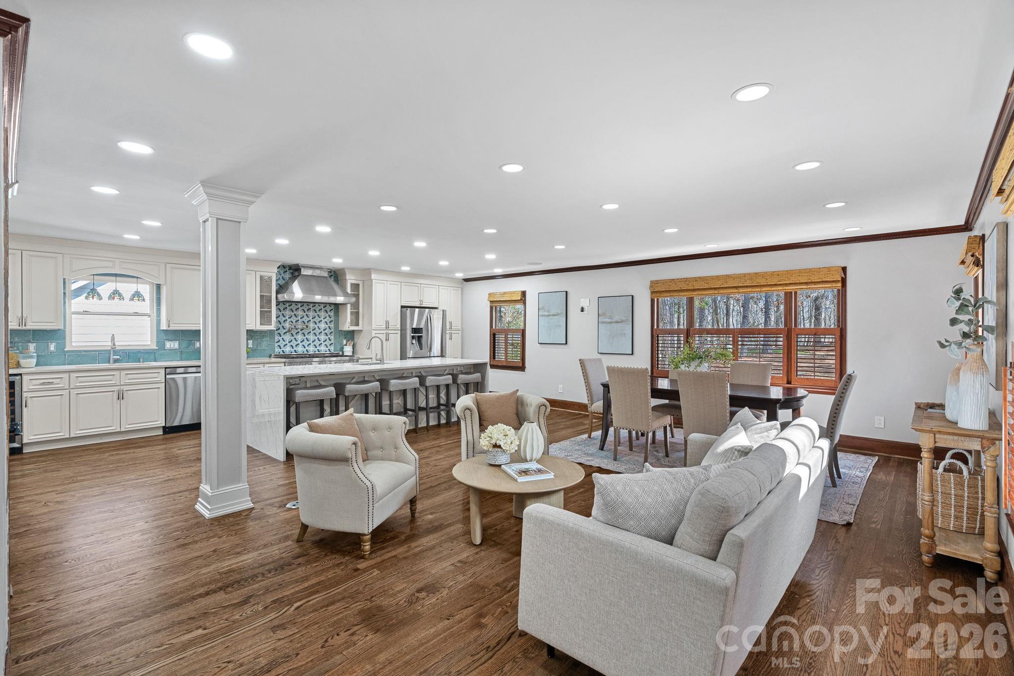 Located on a cul-de-sac in one of Charlotte’s most sought-after neighborhoods, this beautifully updated 4,587 sq ft home offers an exceptional blend of elegance, comfort, and space. Set on 1.02 acres, the property provides a rare sense of privacy and room to enjoy the surrounding landscape while still being part of an established community. The main level features a bright, open-concept floor plan designed for effortless living and entertaining. At the heart of the home is the renovated kitchen, thoughtfully designed with a professional-grade ZLINE range along with a prep sink, beverage sink, and main kitchen sink—perfect for both everyday functionality and hosting gatherings. Expansive wraparound porches invite you to relax and take in the beauty of the property, offering multiple outdoor spaces to enjoy the peaceful setting. The primary suite is conveniently located on the main level and has been beautifully updated, creating a private and serene retreat. The finished basement offers second living quarters, providing flexibility for guests, multi-generational living, or an additional recreation space. A three-car garage and generous living areas throughout complete this remarkable property, offering the rare opportunity to enjoy cul-de-sac living on over an acre in one of Charlotte’s premier neighborhoods. * 2026-27 School Year, the middle school will become JM Robinson Middle School.