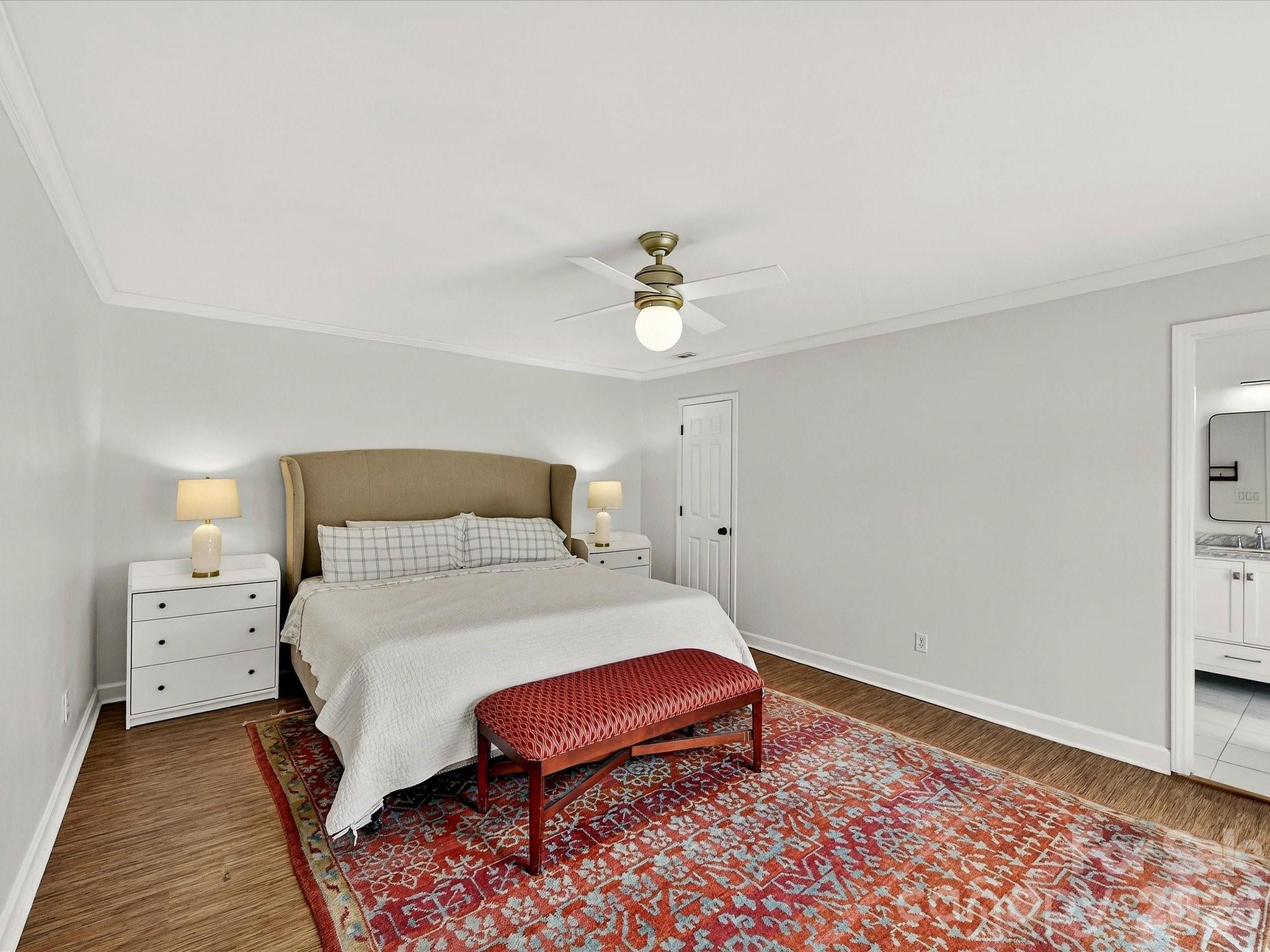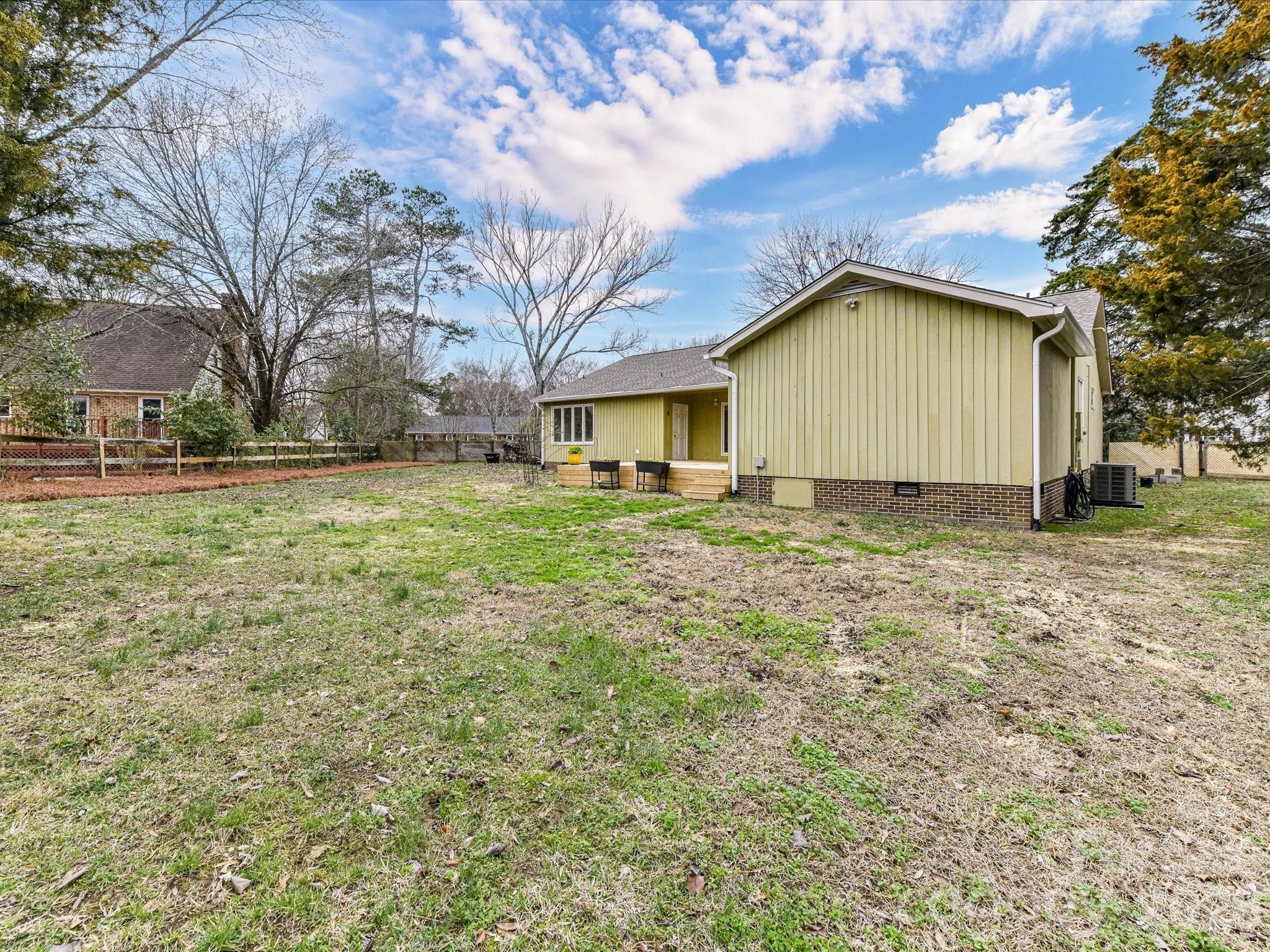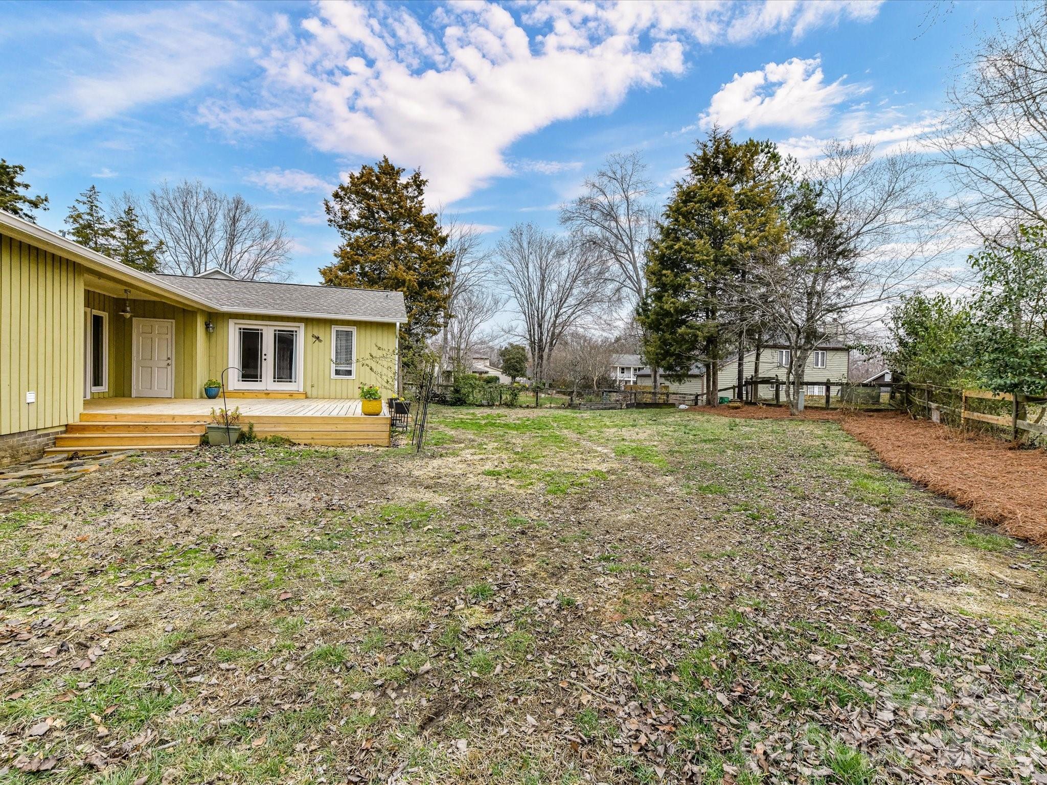 Welcome to this stunning mid-century modern ranch in Autumnwood. Filled with natural light, this home showcases timeless design—vaulted ceilings, floor-to-ceiling windows, rich hardwood floors, and a striking brick wood-burning fireplace that anchors the open living space. The bright, updated kitchen features wood-look tile flooring, granite countertops, white cabinetry, newer stainless steel appliances, and large windows overlooking the peaceful backyard. A convenient laundry room just off the kitchen (washer and dryer included) adds everyday ease. The spacious primary suite offers direct access to the new deck, a custom walk-in closet, and a beautifully renovated ensuite with tile flooring, an updated vanity, and a frameless glass shower. A secondary bedroom includes a walk-in closet with custom built-ins, while the third bedroom is generously sized with abundant natural light and its own walk-in closet—perfect as a bedroom or home office. The hall bath features tile and ample storage. Enjoy morning coffee or evening dining on the deck overlooking the fully fenced backyard, and savor fresh fruit from your own front-yard trees. Major updates include a new roof (2025) and HVAC (2023). Ideally located near the greenway, Lynx, shopping, dining, and with easy access to I-85 and Uptown, this home perfectly blends classic mid-century charm with modern updates and everyday convenience.