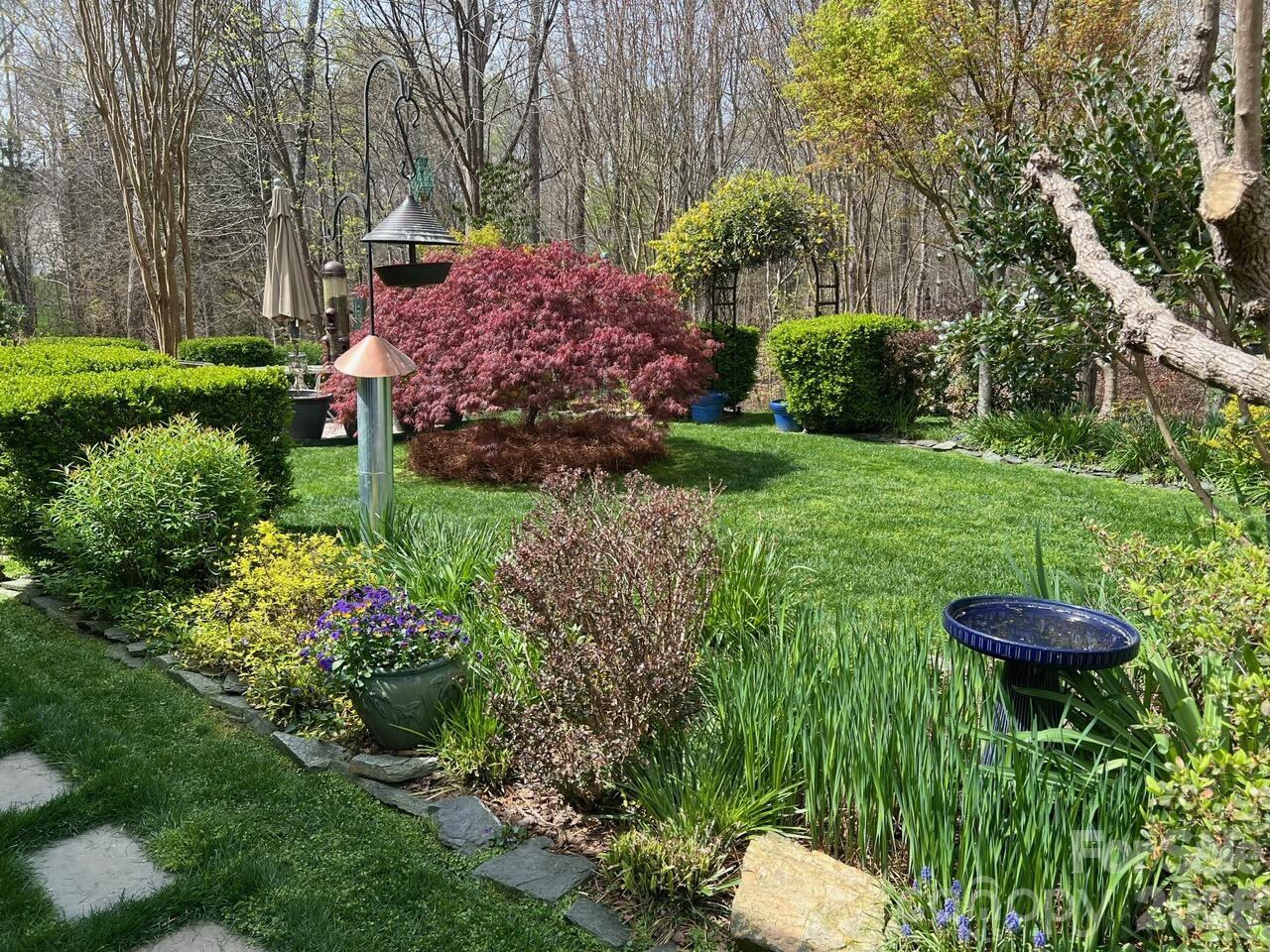 Recently renewed items: Roof, HVAC, microwave, range/oven, dishwasher, EV charger, water heater, water filtration, irrigation system, patio, leaf-free gutters, garden shed, and walking path in the backyard woods.