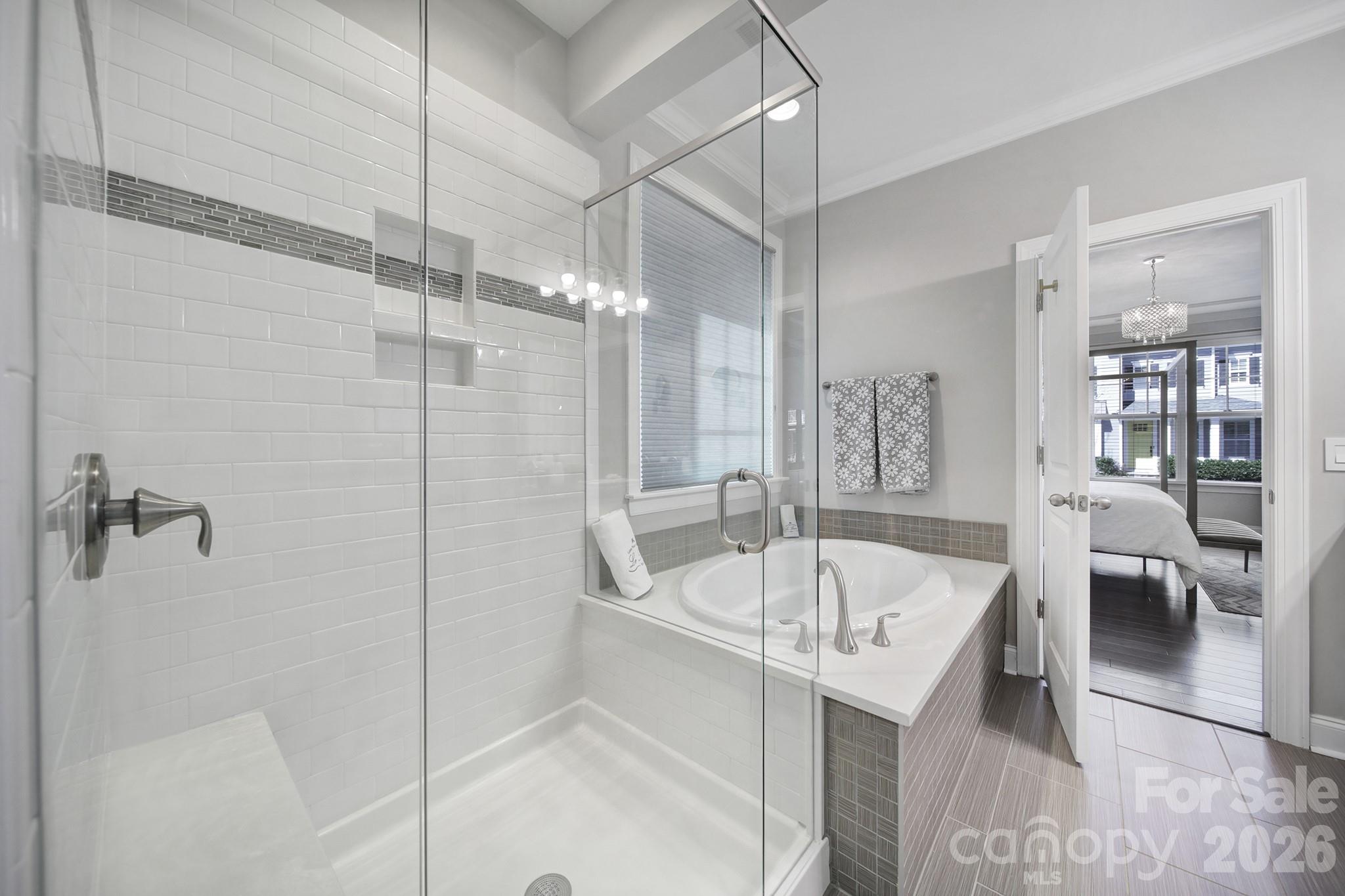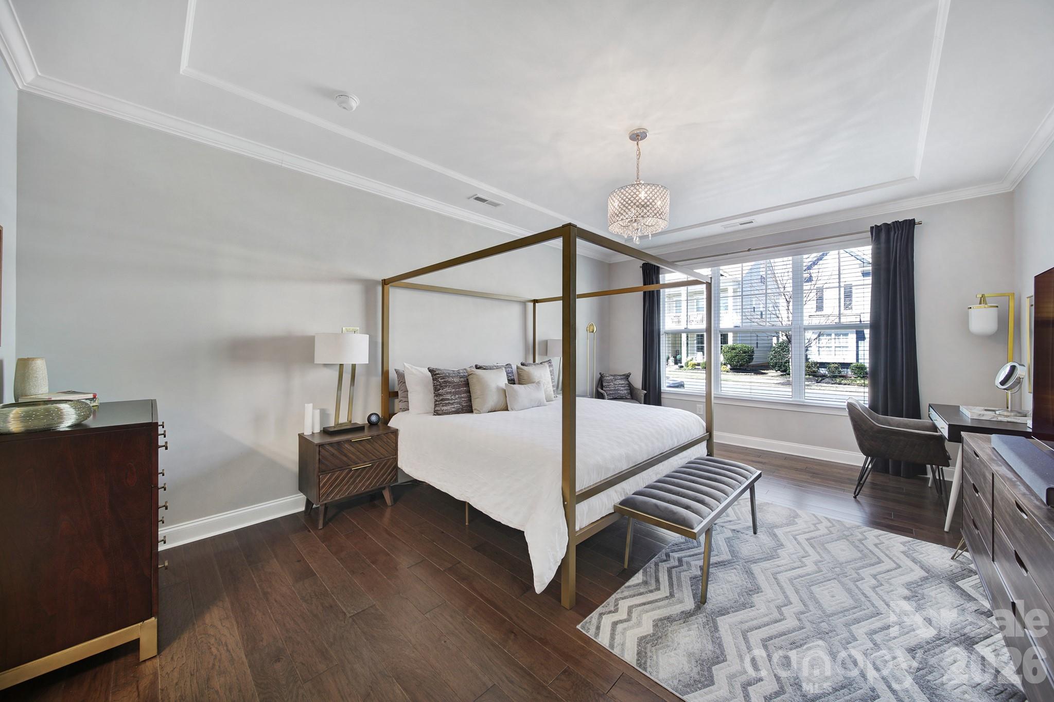 The spacious primary suite on the main level provides a private retreat, complete with a spa-inspired bath featuring a separate garden tub, glass-enclosed shower, and a generous walk-in closet. A dedicated main-level home office offers a bright and quiet space ideal for remote work, while a convenient half bath and spacious laundry room add to the home’s thoughtful design.
