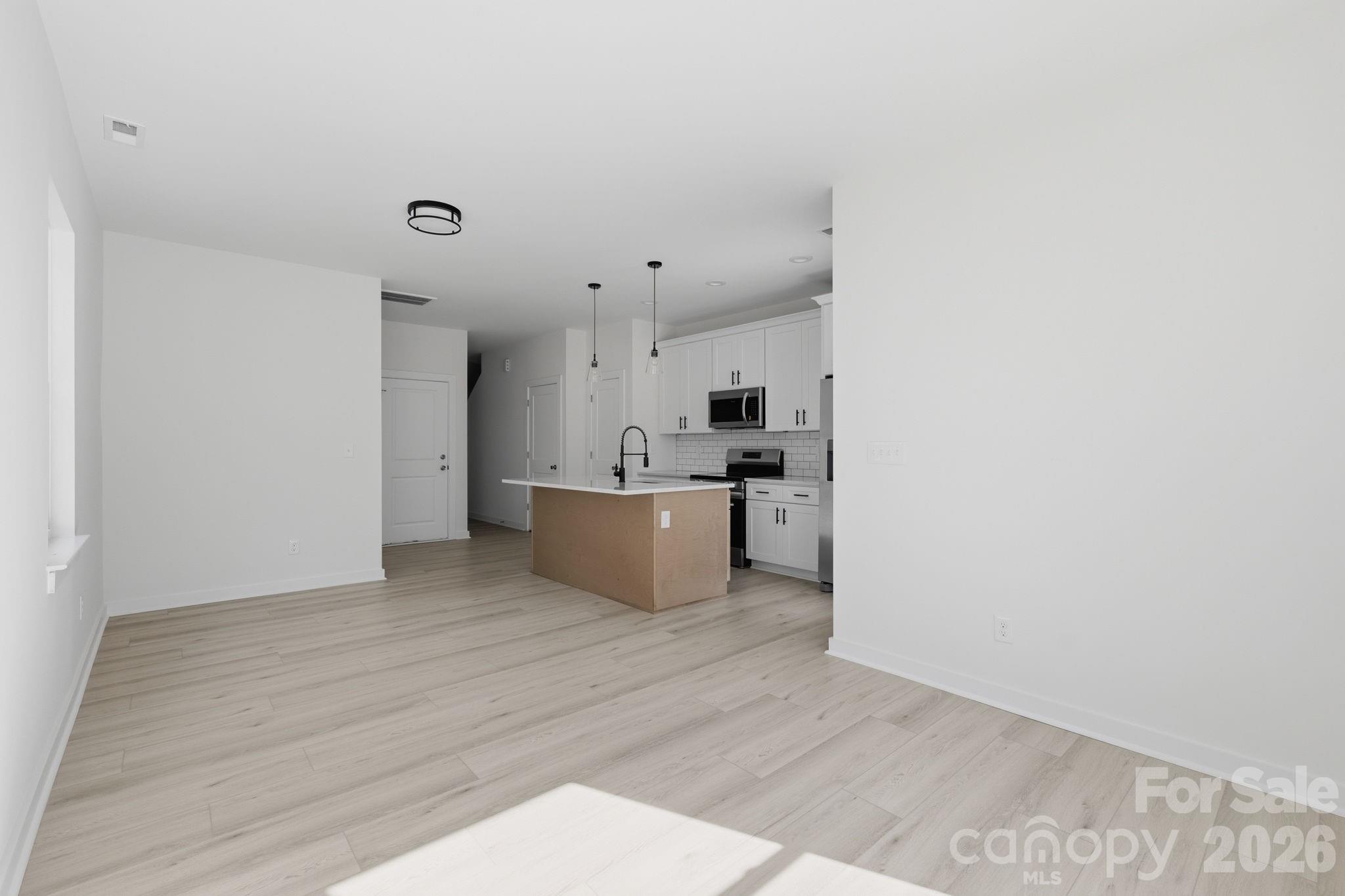 Inside, the home features durable LVP flooring throughout (NO CARPET), Level 3 quartz countertops, custom lighting and fixtures, and a bright open layout designed for comfortable everyday living and entertaining. The kitchen includes a full stainless steel appliance package (including refrigerator and microwave), spacious pantry, crisp subway tile backsplash, abundant cabinetry, and a large island ideal for cooking and entertaining.