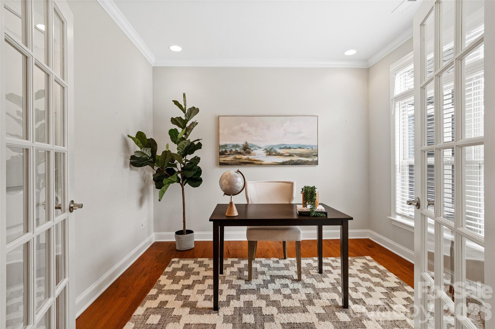 Easy, luxurious ranch-style living awaits in this Promenade III floorplan by Epcon. Enjoy a spacious layout featuring 9' ceilings (10' trays), neutral paint, generous storage, and built-ins. High-end wood flooring runs throughout, complemented by stainless steel appliances, premium cabinetry, beautiful granite counters, and custom window treatments. An added upgrade—and additional square footage—is the finished sunroom off the primary suite, overlooking the private courtyard. This true one-story garden home offers multiple access points and views of the patio and peaceful outdoor oasis filled with camellias, peonies, gardenias, hydrangeas, blue holly, and more. The trellis with climbing jasmine is the crown jewel of the yard, alongside an elegant stacked stone accent wall. Multiple skylights and upgraded transom windows bring natural light into the main living areas. The office/study with French doors can serve as a third bedroom or flexible living space, while guests enjoy their own separate wing for added privacy. Don't miss all the benefits this neighborhood has to offer including a clubhouse, pool, pickleball court, various clubs to join, and an active social committee, not to mention close proximity to dining and shopping. This lovely home has it all, come make it yours!