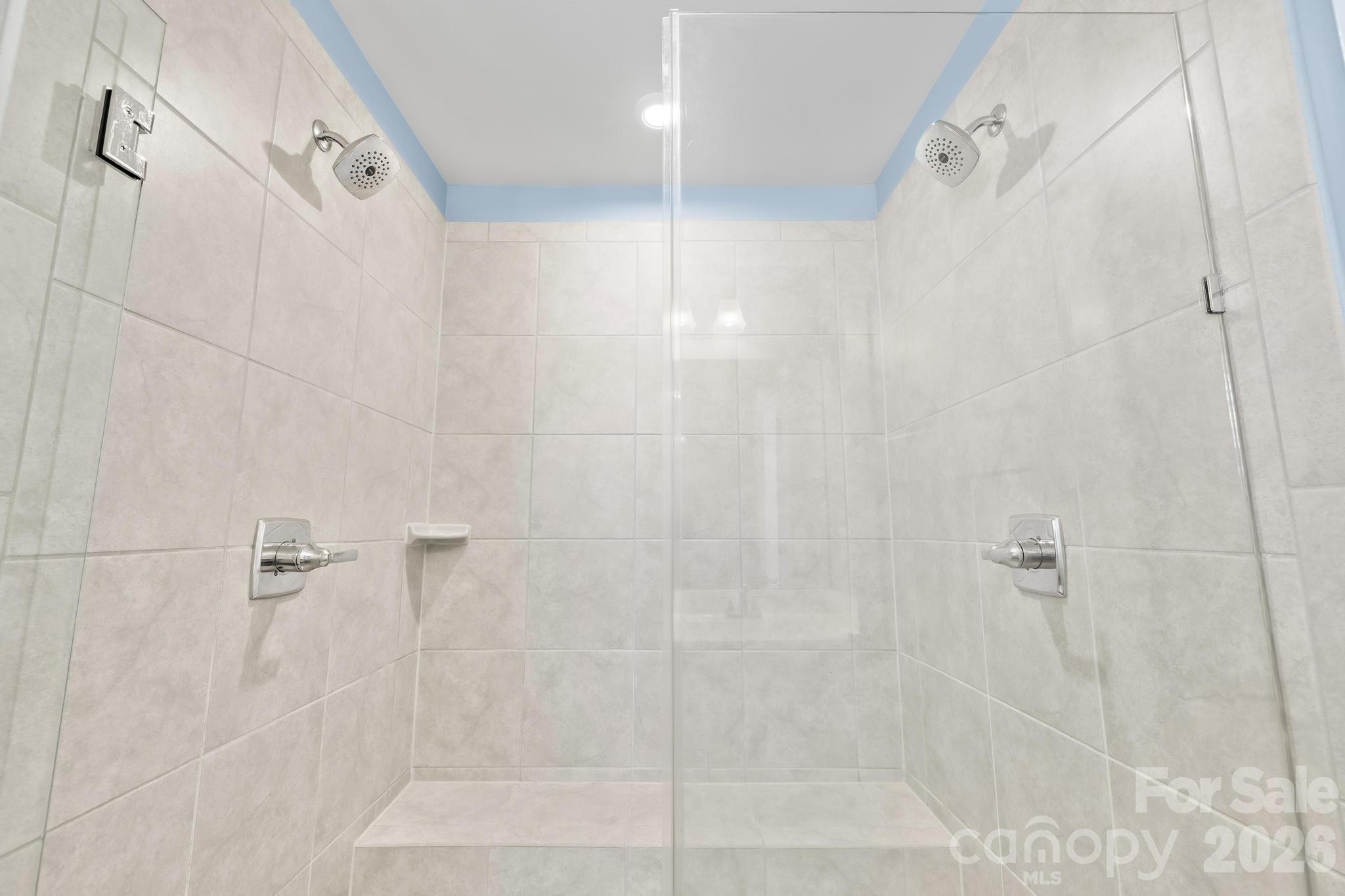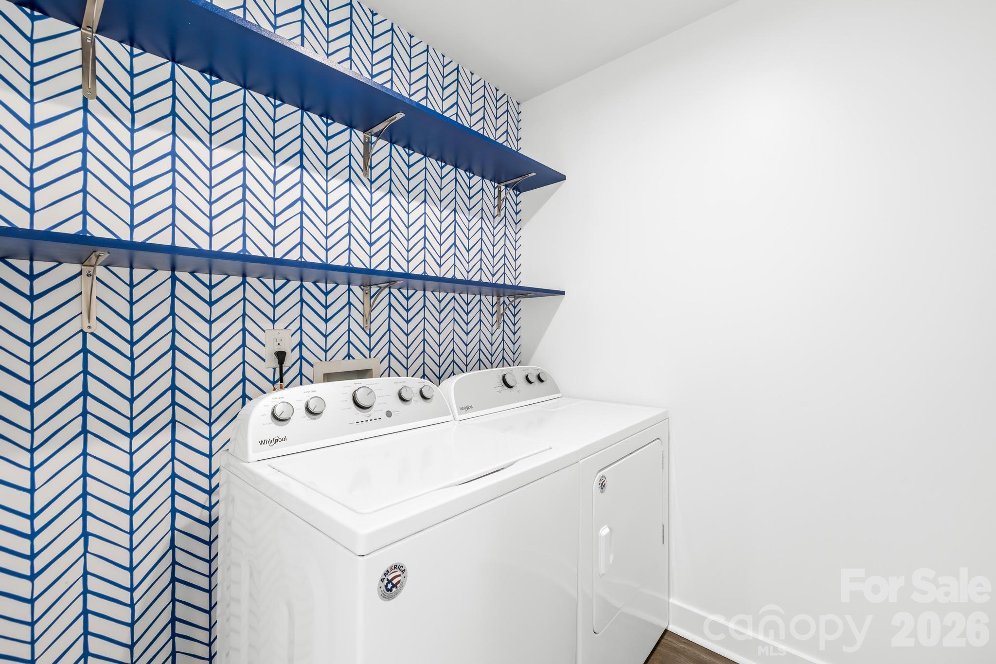 Upstairs, the primary suite offers plenty of space for a king-size bed and includes two walk-in closets. The primary bath features a dual-sink vanity and a beautifully tiled shower with dual shower heads and a built-in bench. Three additional bedrooms—all with ceiling fans—provide flexibility for family, guests, or home office needs. The laundry room stands out with decorative wallpaper and added shelving for both style and function.