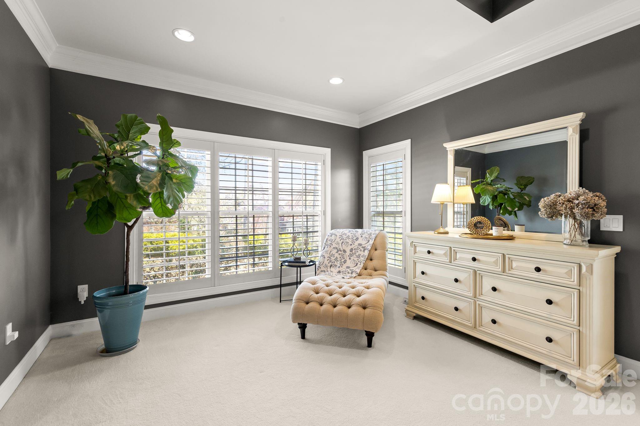 Step into the inviting primary suite with sitting area and renovated spa-like bathroom complete with quartz countertops, a claw foot soaking tub, large tiled shower w/controllable water temperature feature & frameless glass door. Spacious walk-in closet contains a professionally designed closet system.