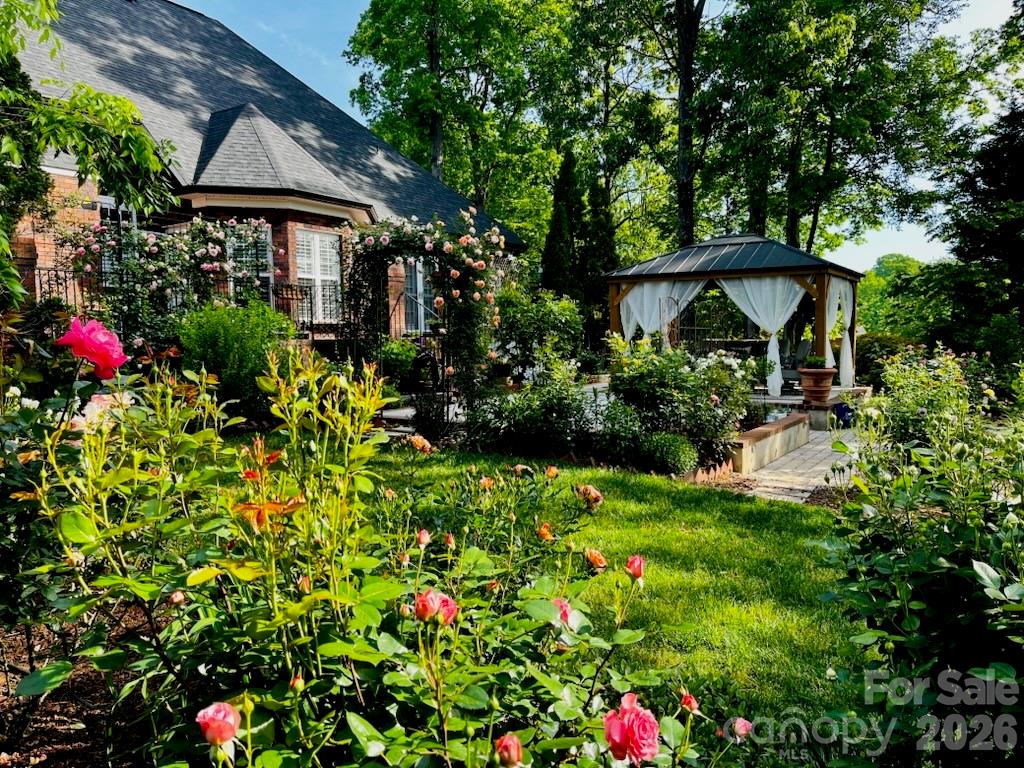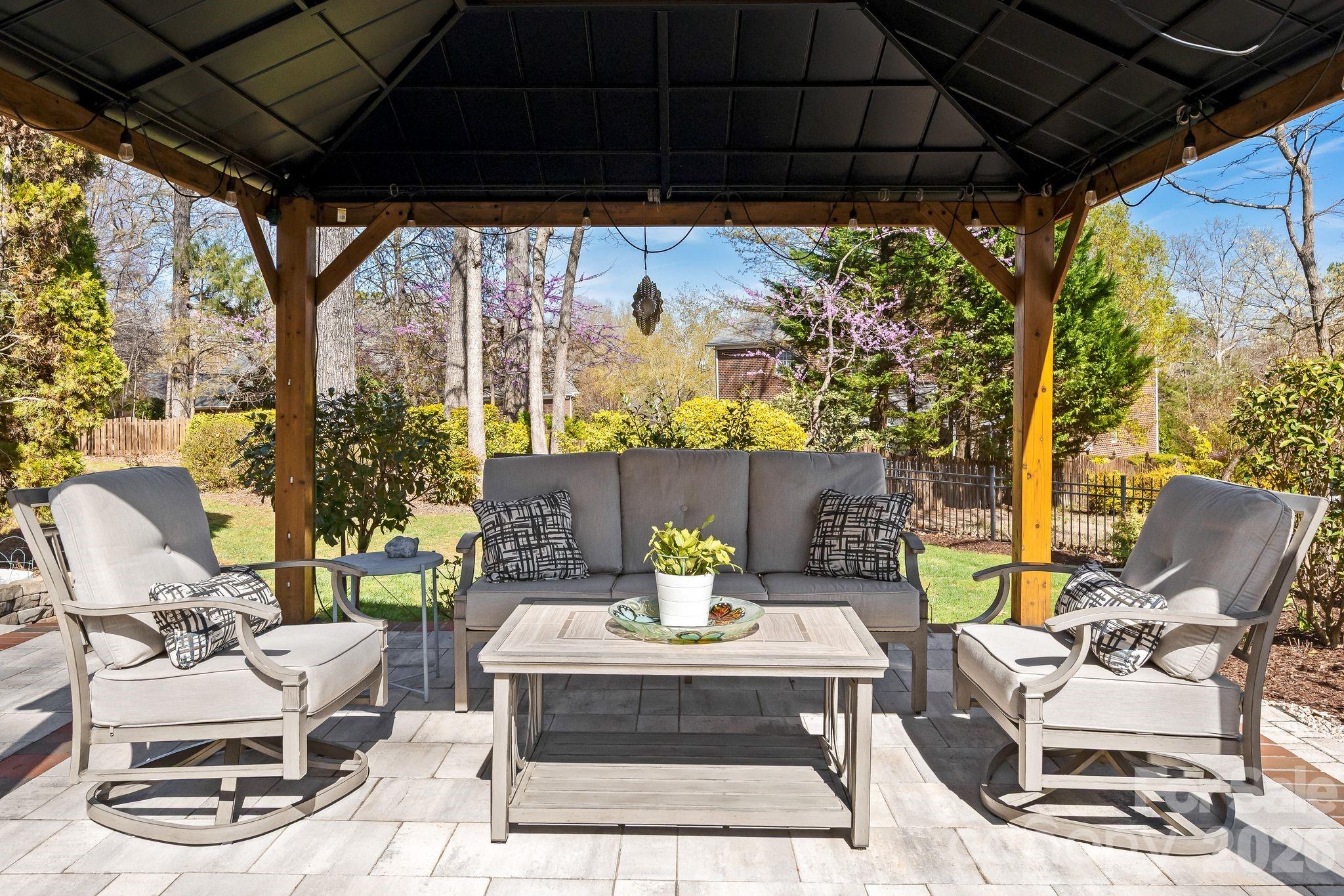 The outdoor living space is truly stunning with beautifully manicured landscaping designed for year-round enjoyment. A raised brick terrace overlooks the lush yard, while a covered pergola sits gracefully over a stone patio—creating the perfect setting for relaxing or entertaining. Full irrigation and landscape lighting enhance the grounds, and when the flowers are in bloom, the yard becomes a vibrant and colorful oasis.