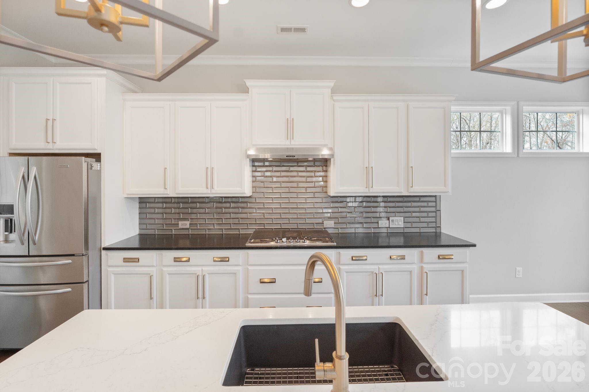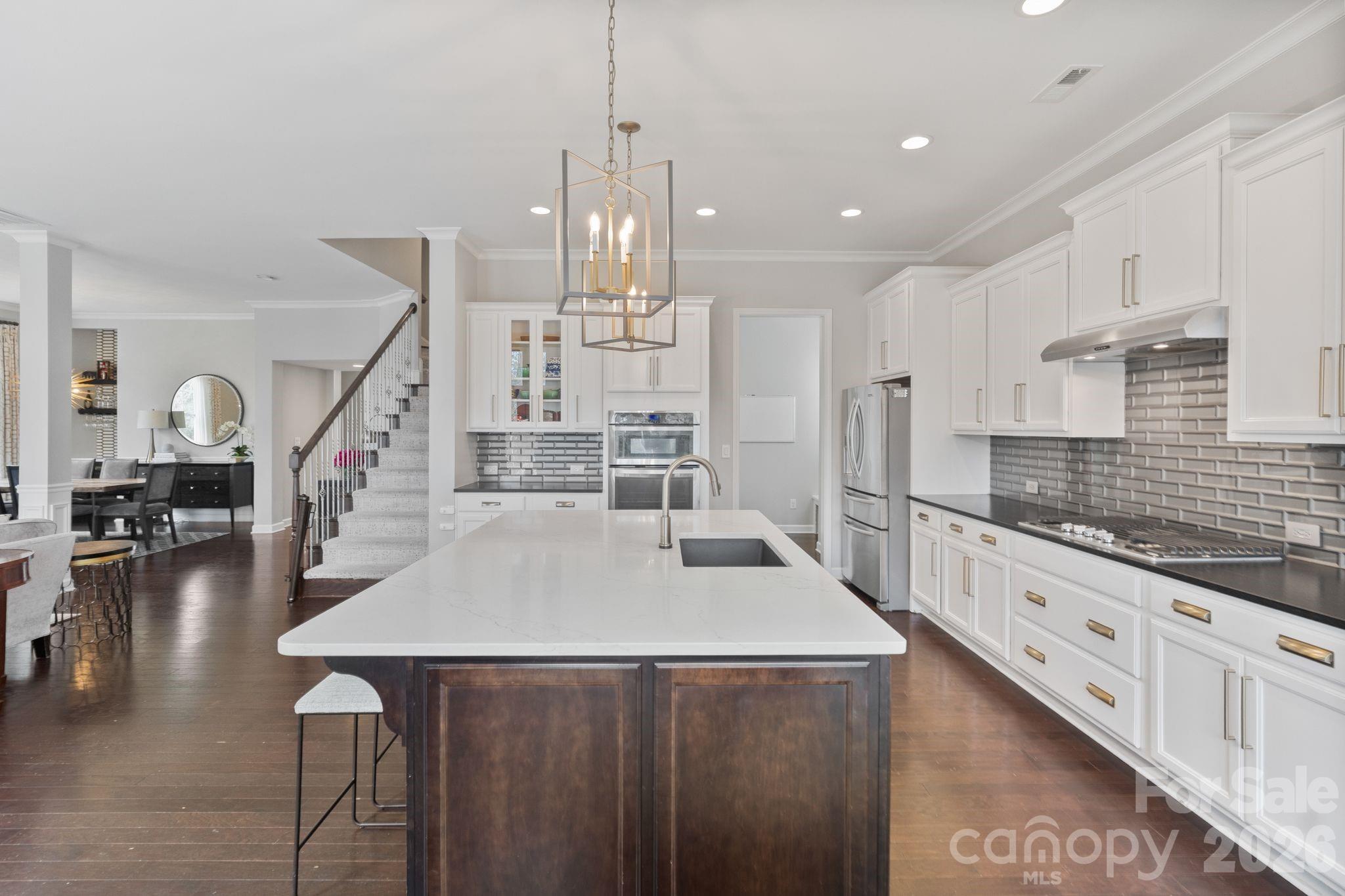 The open floor plan offers an ideal layout for everyday living and entertaining. The kitchen features leathered countertops along the perimeter, a beautiful white quartz island, stainless steel appliances including the refrigerator and an impressive tile backsplash.